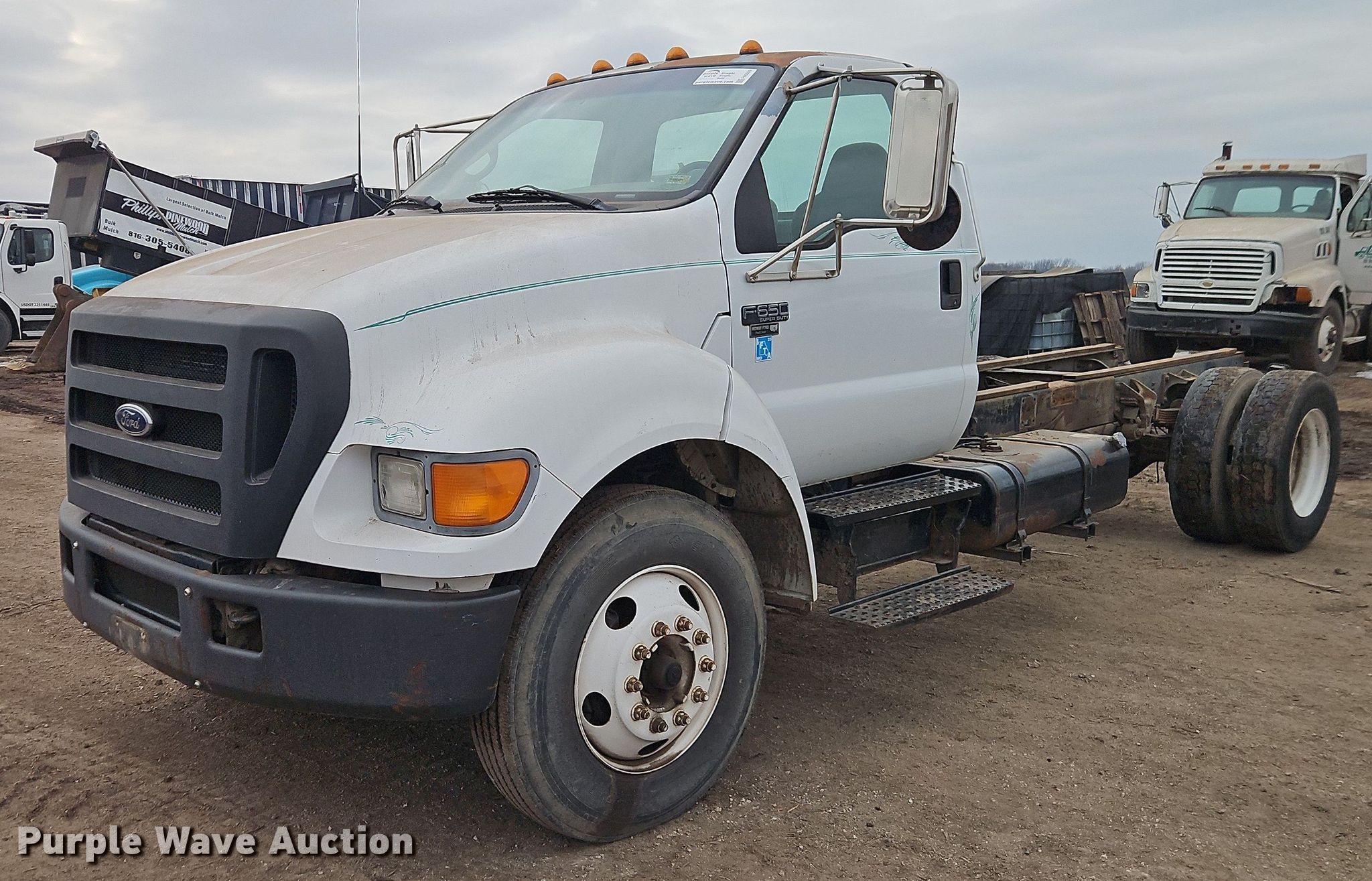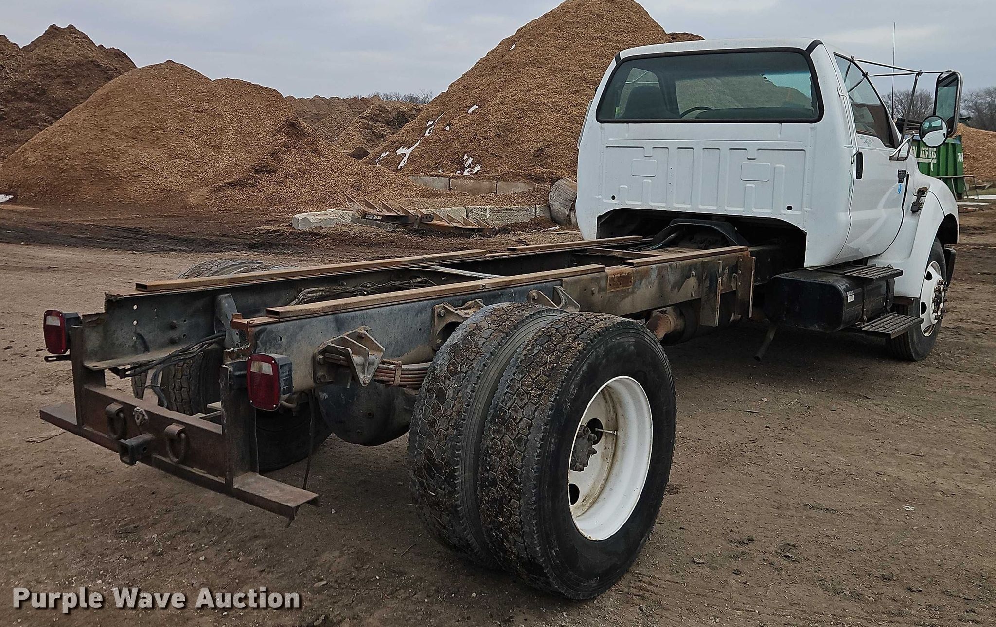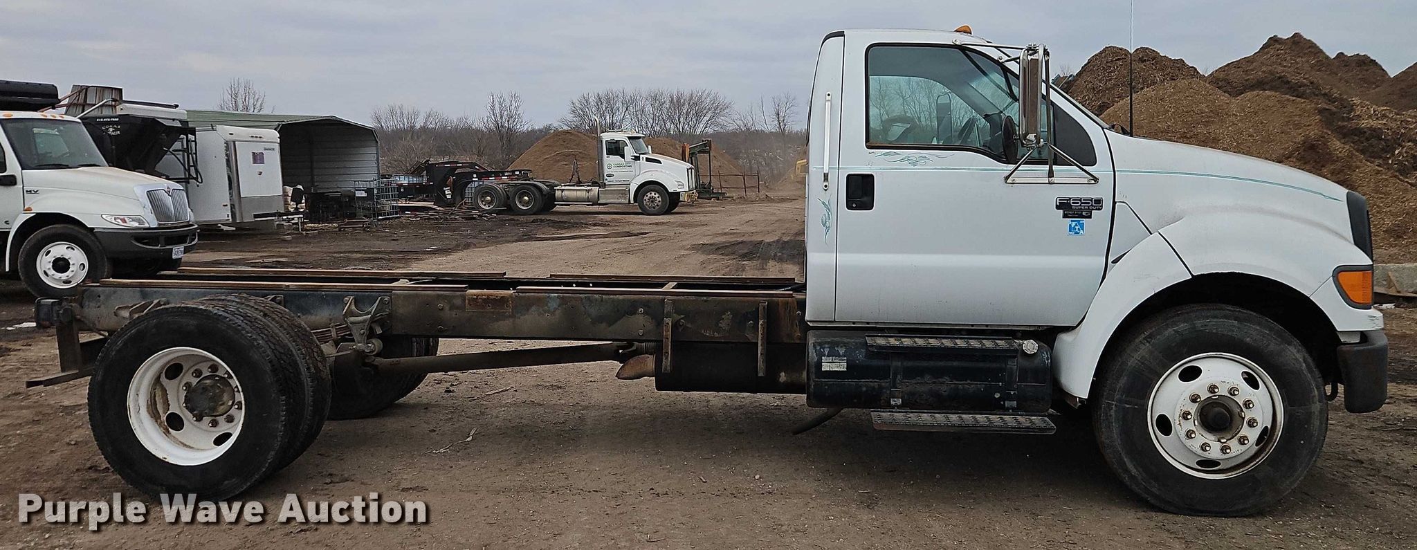 2004 Ford F650 truck cab and chassis. Miles: 187,405 on odometer, VIN: 3FRNF65204V604598. Engine Caterpillar, Cylinders: 6, Fuel type: Diesel. Transmission Automatic. Chassis Axles: Single, Suspension: Spring, Brakes: Hydraulic, PTO, Truck chassis: 13' 6", GVWR: 25,999 lbs FAWR: 10,000 lbs, RAWR: 17,500 lbs, Wheelbase: 660". Interior AC, Heat, Brake controller. Tires Size: 275/80R22.5. Notes Dash warning indicator: ABS. Missouri title. Title distribution may be delayed up to 14 days from verification of funds. St. Louis Composting DBA Kansas City Composting. Belton, MO 64012
