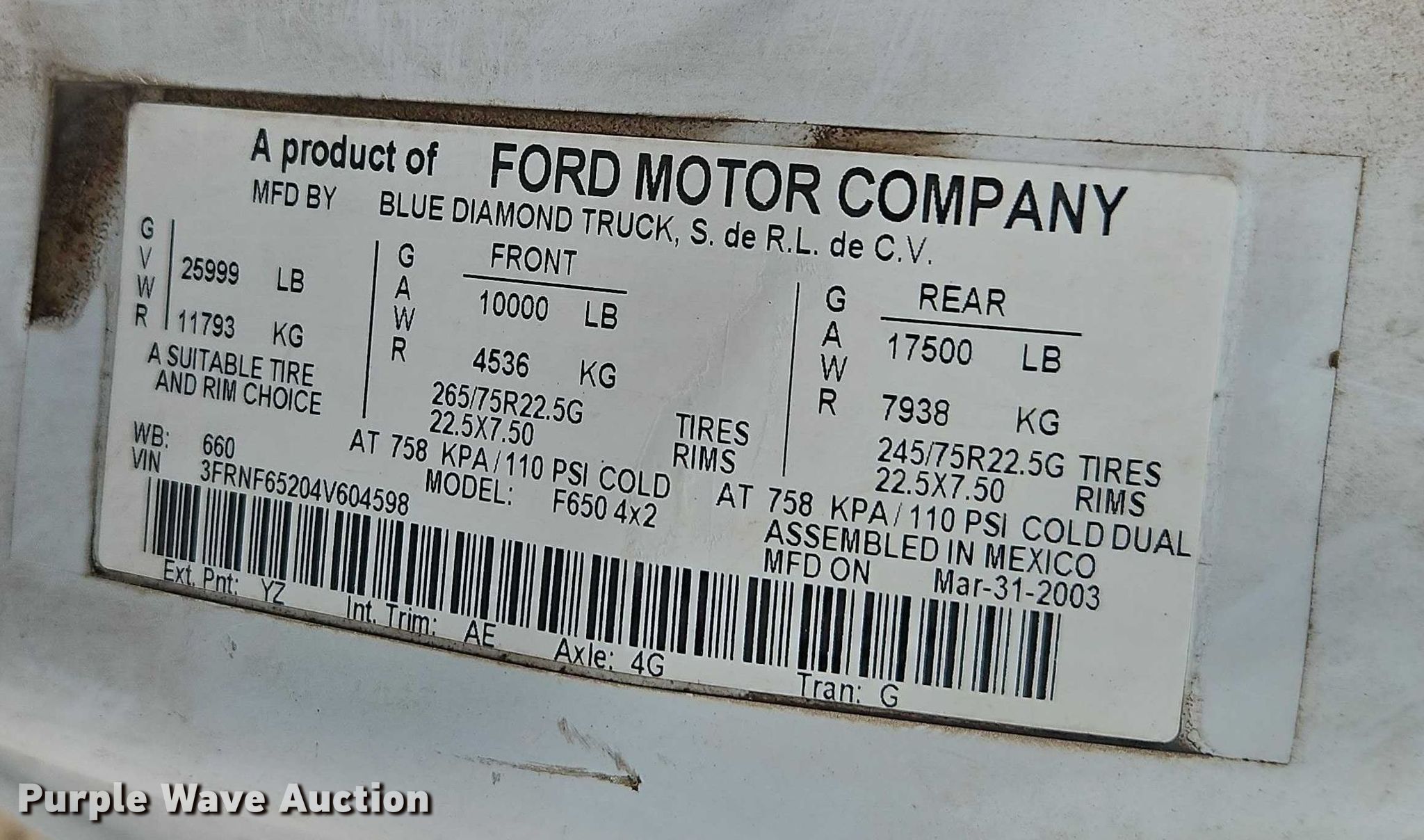 Take a look at this used 2004 Ford F650 truck cab and chassis being sold on March 5th, 2026 in the Thursday March 05 Truck and Trailer Auction made by Ford. Take a look at all of the item information below or take a look at similar auctions for Trucks.