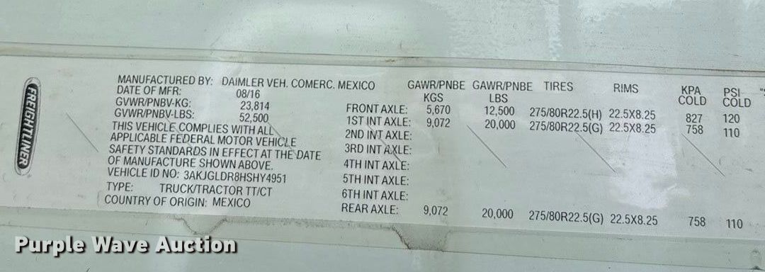 2017 Freightliner Cascadia semi truck. Miles: 831,189 on odometer, VIN: 3AKJGLDR8HSHY4951, Unit #: 90839595. Engine Detroit Diesel DD15, Displacement: 14.8L, Cylinders: 6, Fuel type: Diesel, Engine brake. Transmission Eaton Fuller, Manual, Speed: 10. Chassis Axles: Tandem, Differential lock: Inter-axle, Suspension: Air Dump valves, Brakes: Air, GVWR: 52,500 lbs FAWR: 12,500 lbs, IAWR: 20,000 lbs, RAWR: 2,000 lbs. Interior AC, Heat, Heated mirrors, Power windows, Power locks, Cruise control, Air ride cab, Brake controller, Sleeper Sleeper length: 60", Beds: Double bunk, Refrigerator, Rear climate control, Auxiliary power unit TriPac Evolution, Engine Yanmar.. Features Deck plate: Aluminum, Fifth wheel type: Air operated, Sliding, Fuel tank: Dual. Tires Front: 11R22.5, Rear: 295/75R22.5. Notes Dash warning indicator: ABS, Jump start required during on-site data collection. Repossessed item, stored at a secured facility. Please review REQUIRED REMOVAL INSTRUCTIONS. Titles will be distributed after confirmation of payment and removal. Texas title. Title distribution may be delayed up to 30 days from verification of funds. Lender Owned. 501 Valley Chili Road. Anthony, TX 79821