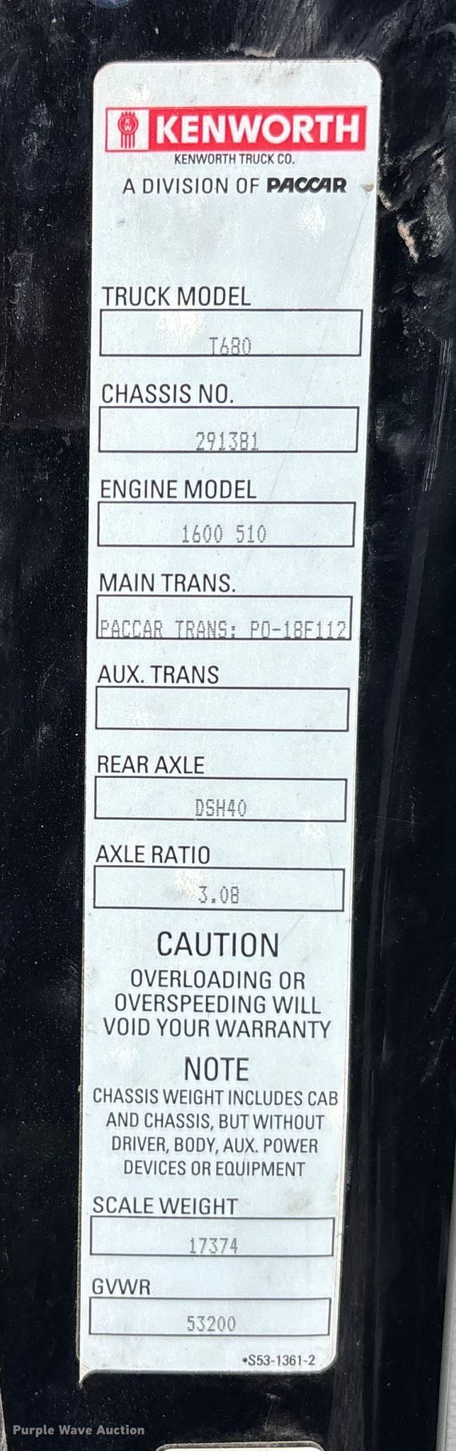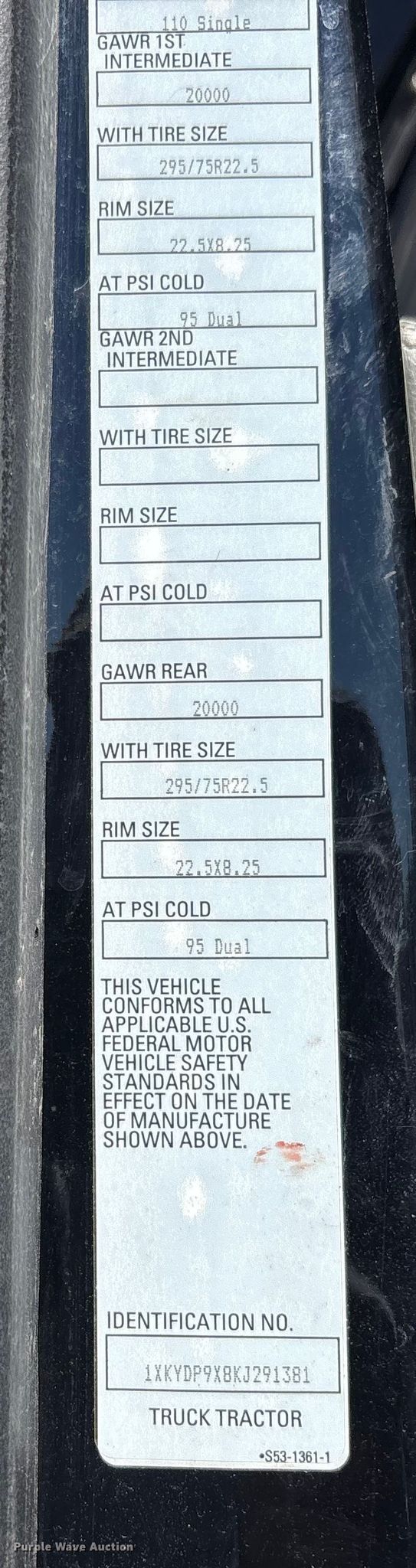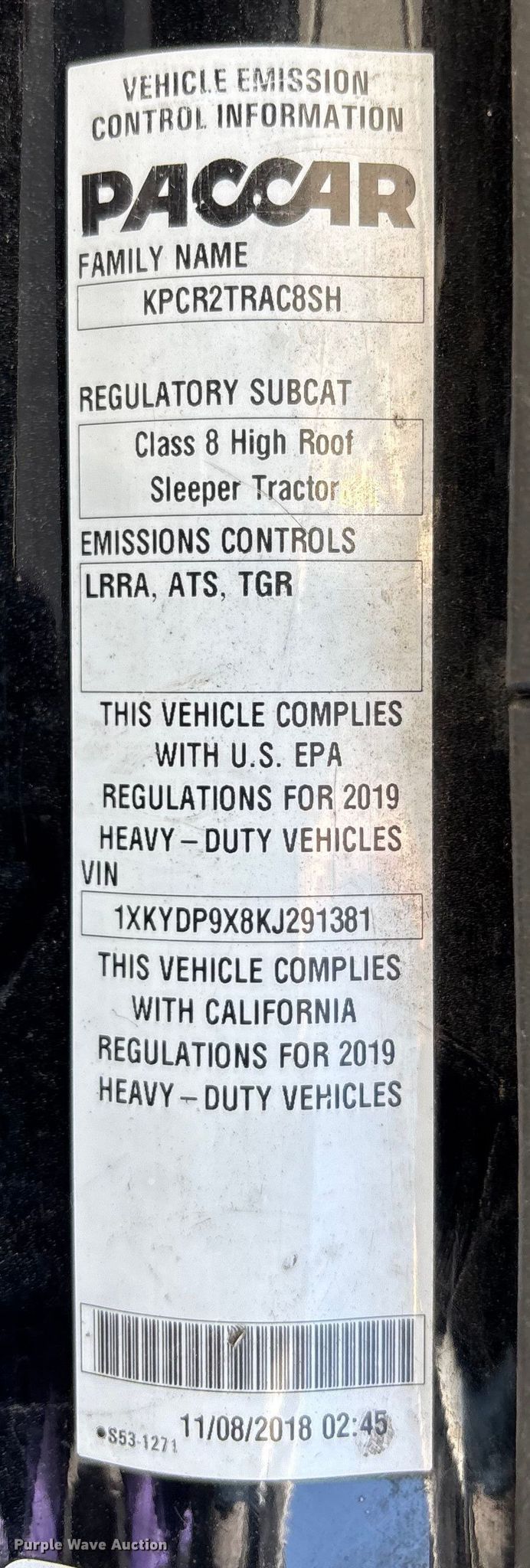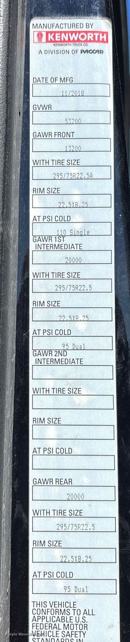 2019 Kenworth T680 semi truck. Miles: 794,021 on odometer, Hours: 26,184 on meter, VIN: 1XKYDP9X8KJ291381, Unit #: 92650775. Engine Paccar, Displacement: 12.9L, Cylinders: 6, Fuel type: Diesel, Engine brake. Transmission Automated manual. Chassis Axles: Tandem, Gear ratio: 3.08, Differential lock: Inter-axle, Suspension: Air Dump valves, Brakes: Air, GVWR: 53,200 lbs. Interior AC, Heat, Heated mirrors, Power windows, Power locks, Cruise control, Air ride cab, Sleeper Sleeper length: 72", Beds: Double bunk, Refrigerator, Rear climate control. Features Deck plate: Aluminum, Fifth wheel type: Air operated, Sliding, Fuel tank: Dual. Tires Size: 295/75R22.5. Notes Possible rodent damage, Dash warning indicator: Check engine, Stop engine, Windshield chipped or cracked, Possible exhaust issues, DPF disconnected, Air hose disconnected, Brake issues Locked up , Rear drive brakes caged, Unit must be towed or hauled. Repossessed item, stored at a secured facility. Please review REQUIRED REMOVAL INSTRUCTIONS. Titles will be distributed after confirmation of payment and removal. Florida title. Title distribution may be delayed up to 30 days from verification of funds. Lender Owned. 3352 West Orange Blossom Trail. Apopka, FL 32703