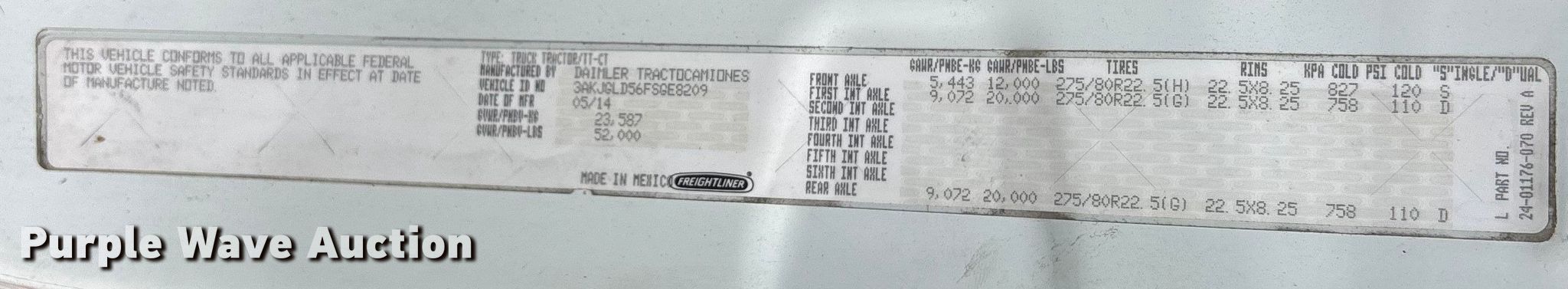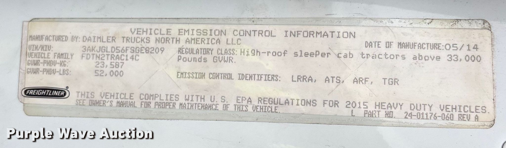 Purple Wave is selling a used Truck Tractor in Florida. This item is a 2015 Freightliner Cascadia semi truck with the following: Miles: Unknown, VIN: 3AKJGLD56FSGE8209, Unit #: 92703245