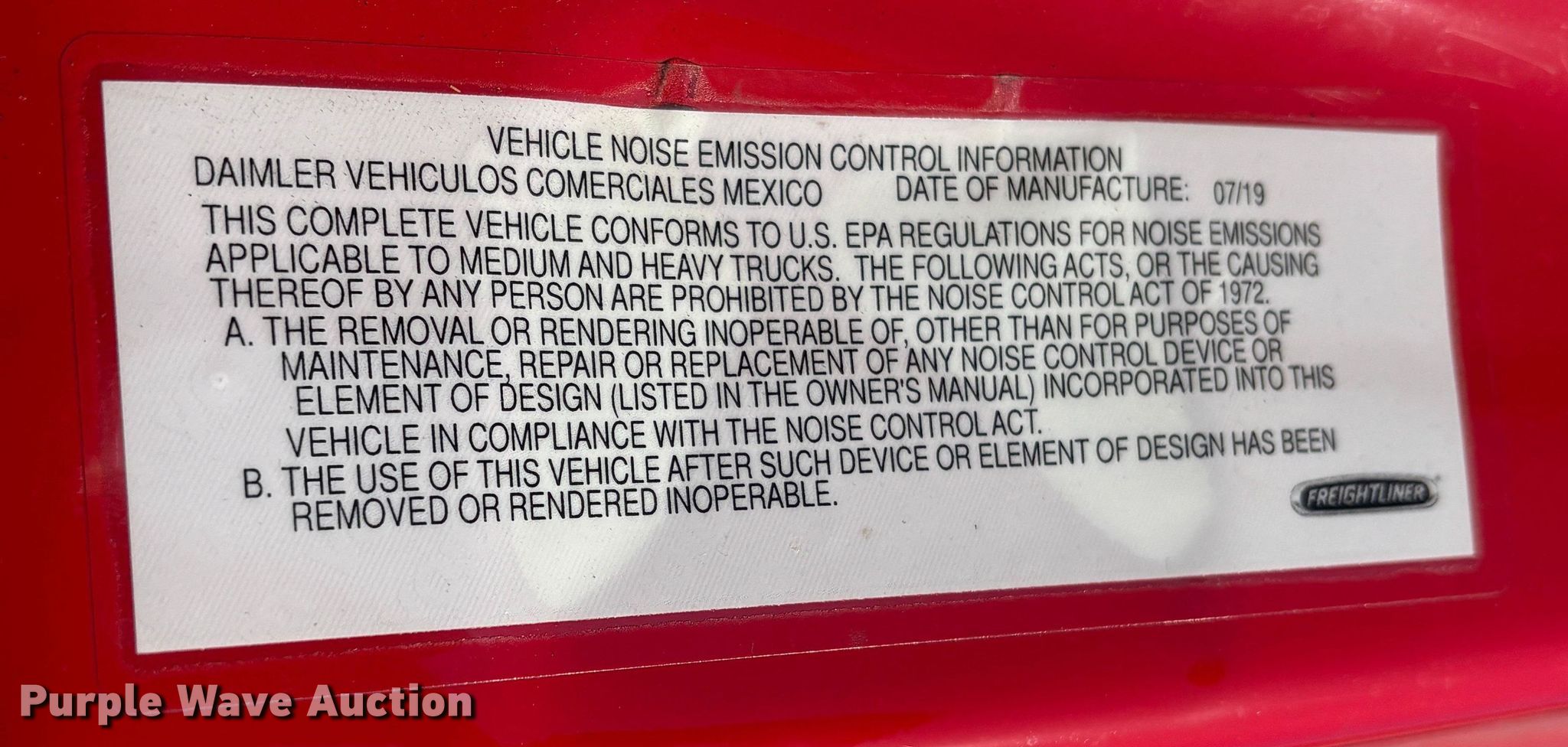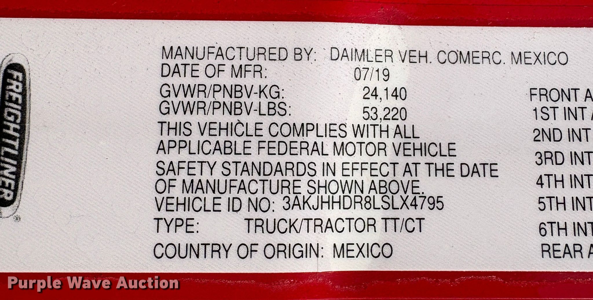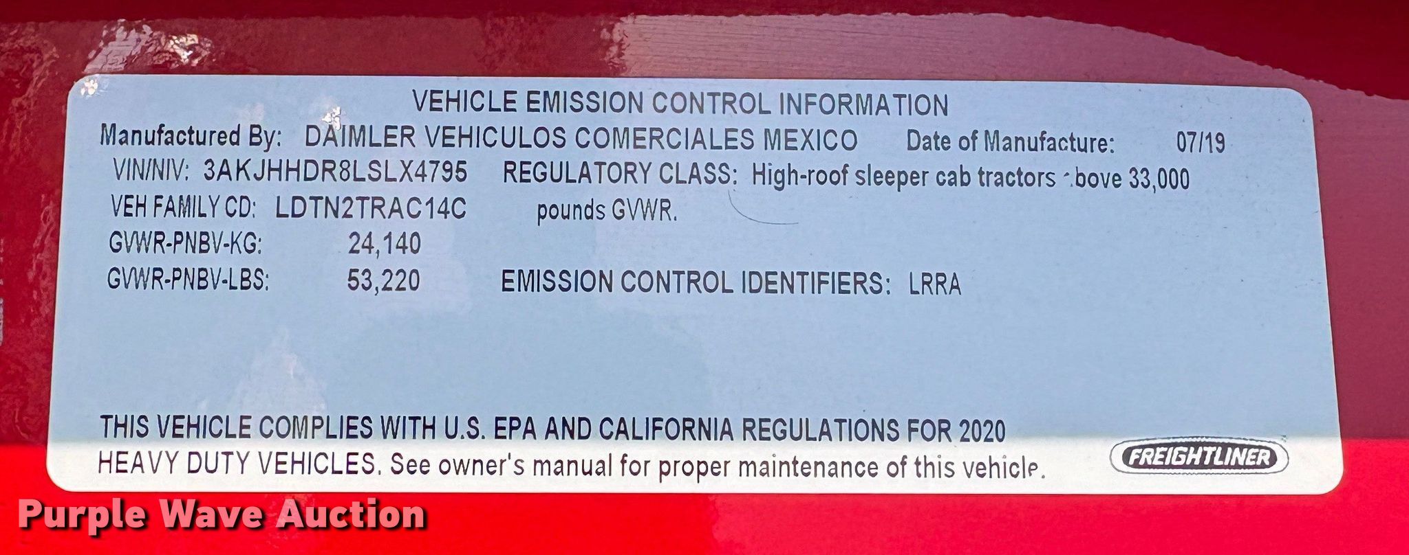 2020 Freightliner Cascadia 126 semi truck. Miles: 683,241 on odometer, Hours: 21,080 on meter, VIN: 3AKJHHDR8LSLX4795, Unit #: 96558685. Engine Detroit Diesel DD15, Serial: 472910S0705896, Displacement: 14.8L, Cylinders: 6, Fuel type: Diesel, HP: 505, Engine brake. Transmission Automated manual. Chassis Axles: Tandem, Differential lock: Inter-axle, Suspension: Air Dump valves, Brakes: Air, GVWR: 53,220 lbs FAWR: 13,220 lbs, IAWR: 20,000 lbs, RAWR: 20,000 lbs. Interior AC, Heat, Heated mirrors, Power windows, Power locks, Cruise control, Air ride cab, Brake controller, Sleeper Sleeper length: 64", Beds: Single, Rear climate control. Features Deck plate: Aluminum, Fifth wheel type: Air operated, Sliding, Fuel tank: Dual. Tires Size: 11R22.5. Notes Dash warning indicator: Check engine, Stop engine, Aftertreatment system problem detected, CPC not configured, Engine emergency shutdown activated, Jump start required during on-site data collection, Engine issues, will not stay running. Buyer responsible for all aspects of state emissions compliance. Repossessed item, stored at a secured facility. Please review REQUIRED REMOVAL INSTRUCTIONS. Titles will be distributed after confirmation of payment and removal. Indiana title. Title distribution may be delayed up to 30 days from verification of funds. Lender Owned. 1255 East Central Avenue. Fresno, CA 93725