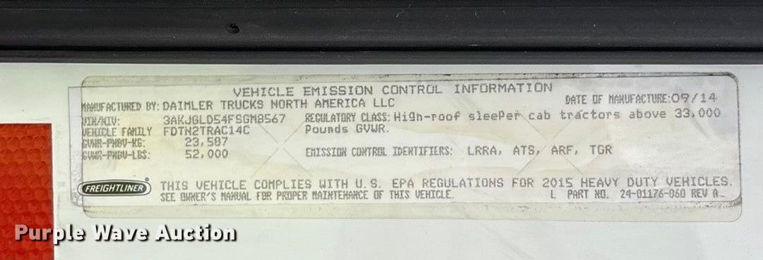 Purple Wave is selling a used Truck Tractor in Texas. This item is a 2015 Freightliner Cascadia semi truck with the following: Miles: 706,374 on odometer, VIN: 3AKJGLD54FSGM8567, Unit #: 99472255