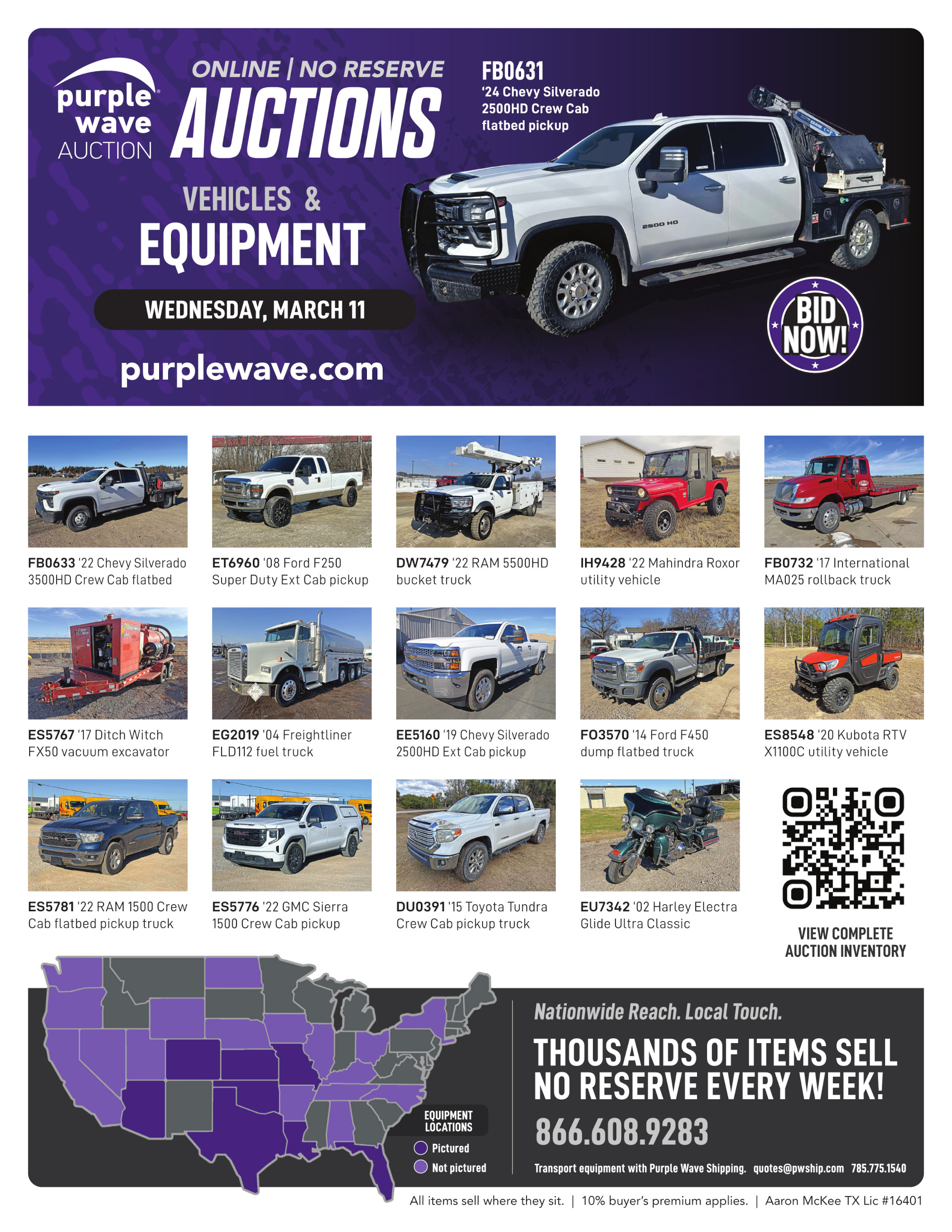 This auction is conducted by Purple Wave, Inc., whose home office is 825 Levee Drive, Manhattan, Kansas. Aaron McKee, Texas auctioneer license # 16401, operates Purple Wave, Inc. Complaints against us may be directed to the Texas Department of Licensing and Regulation, P.O. Box 12157, Austin, Texas 78711, (512) 463-6599. For additional required information, see the attached document.