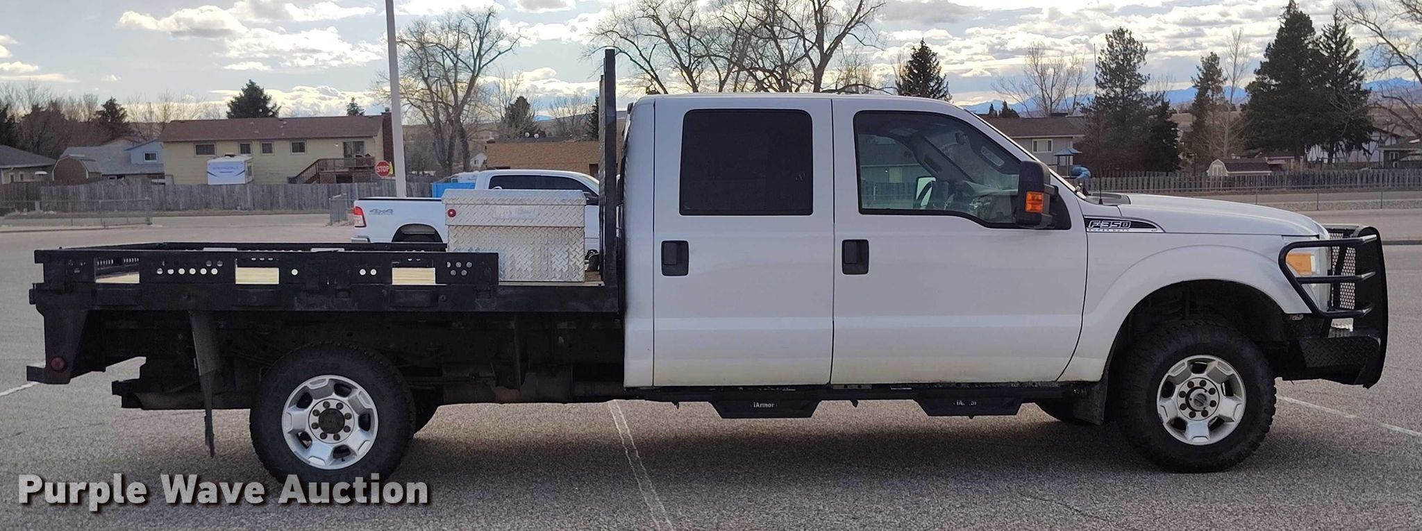 This 2012 Ford F350 Super Duty Crew Cab flatbed pickup truck will sell to the highest bidder regardless of price.