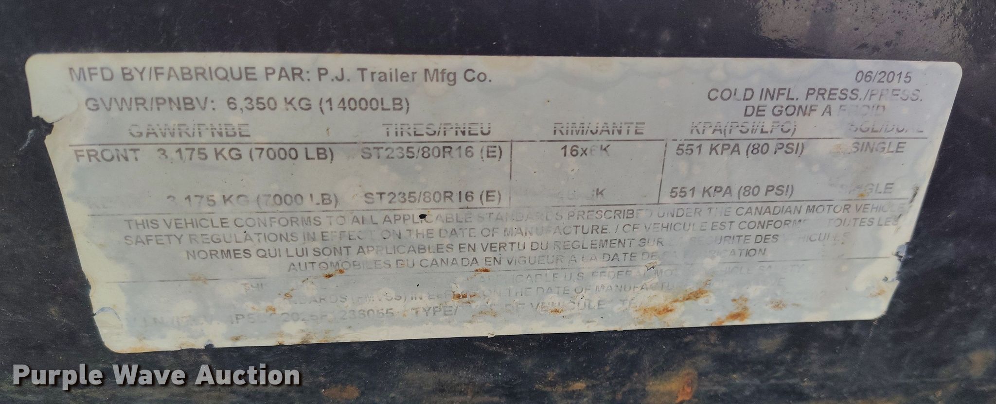 2015 PJ PJ utility trailer. VIN: 4P5CC2025F1236055. Dimensions Overall Length: 24' 10", Width: 102", Deck Length: 17' 10", Width: 87", Tail length: 2' 2". Features Deck type: Wood. Chassis Ball hitch: 2 5/16", Landing gear: Single, Suspension: Spring, Brakes: Electric, Axles: Tandem, GVWR: 14,000 lbs, GAWR: 7,000 lbs. Tires Steel wheels, Size: 235/80R16. Notes Ramps missing. Colorado title. Title distribution may be delayed up to 14 days from verification of funds. Twin Peaks Environmental. Dacono, CO 80514