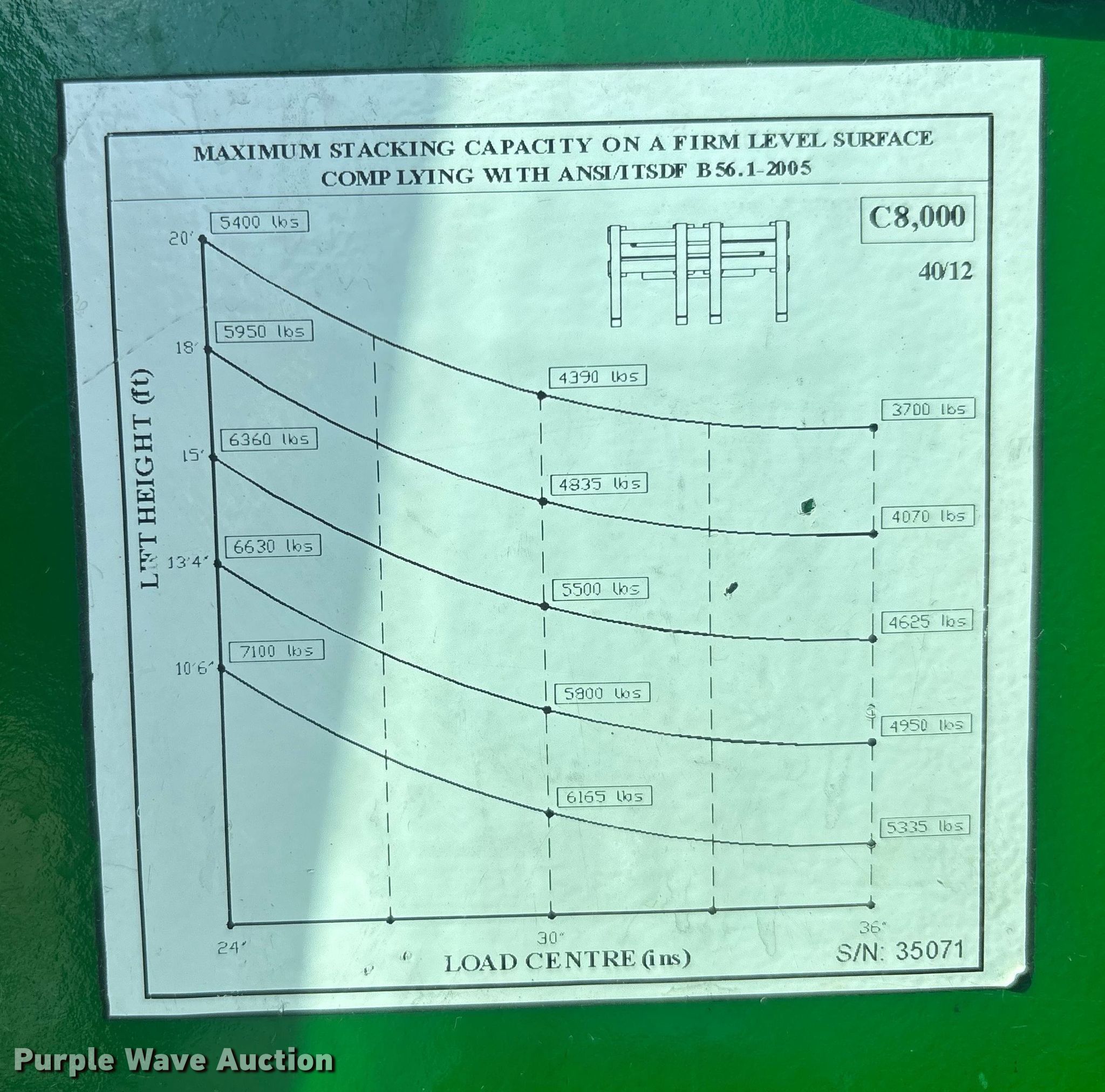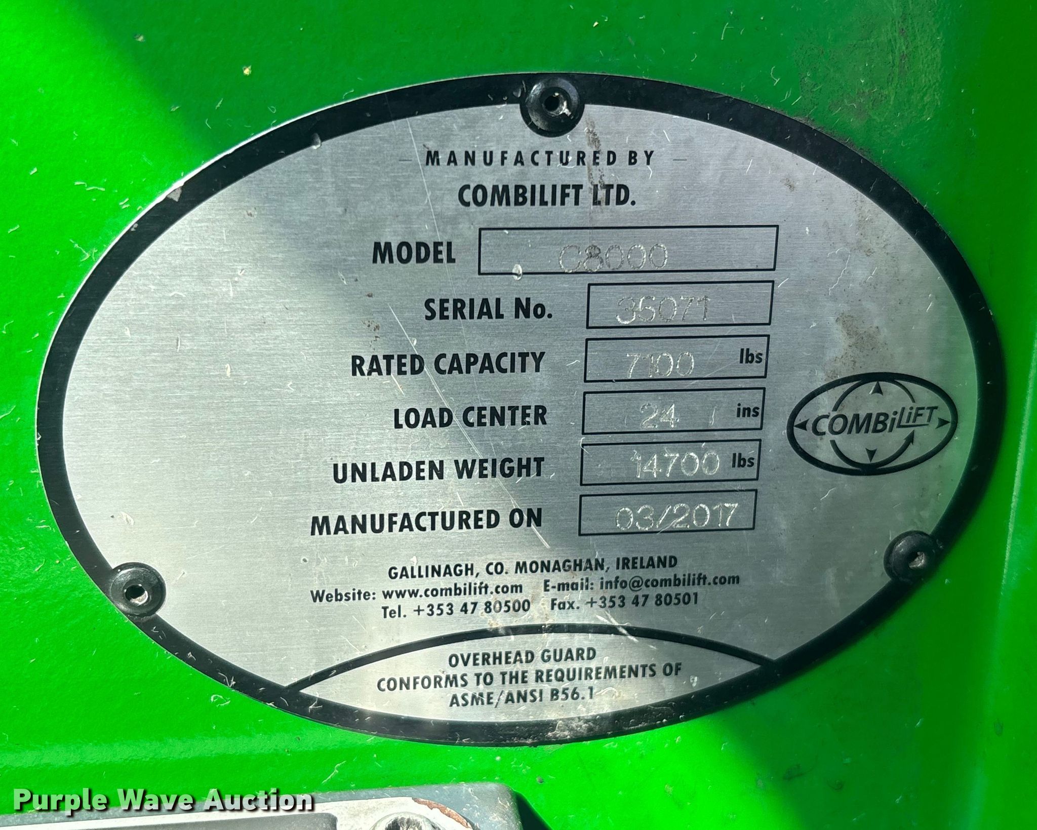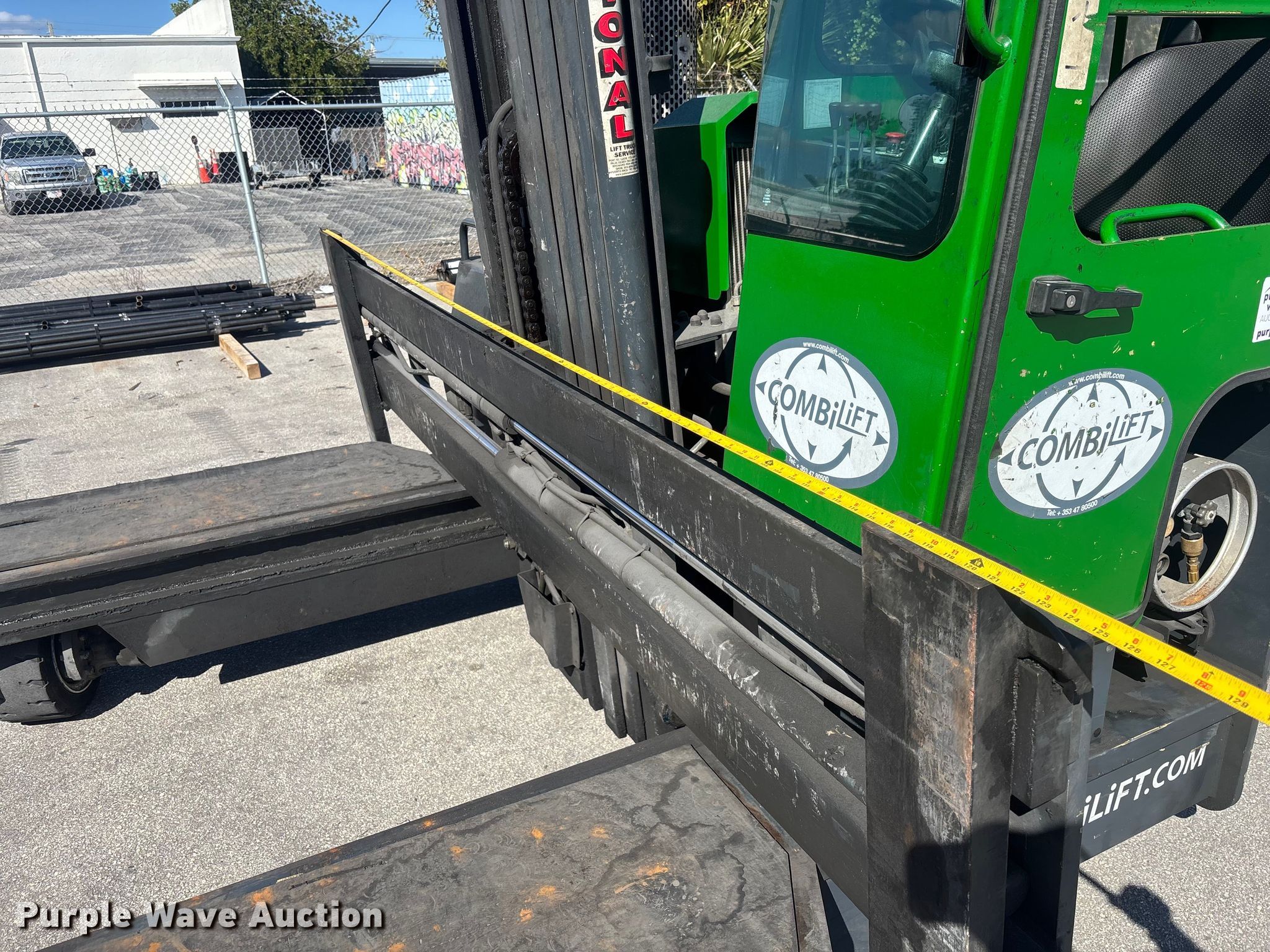 2016 CombiLift C8000 forklift. Hours: 2,876 on meter, Serial: 3507, Unit #: SFS2980. Engine Cylinders: 4, Fuel type: LPG LP bottle: Not included. Transmission Automatic. Operators station Enclosed cab. Features Maximum lift capacity: 7,100 lbs, Maximum lift height: 240", Collapsed mast height: 109", Mast stages: 3, Mast tilt, Fork positioner, Reach / retract, Fork length: 47". Tires Front: 200/50-10/6.50, Rear: 250/75-12/8.00, Solid. Notes Glass missing. Ferguson. West Palm Beach, FL 33407