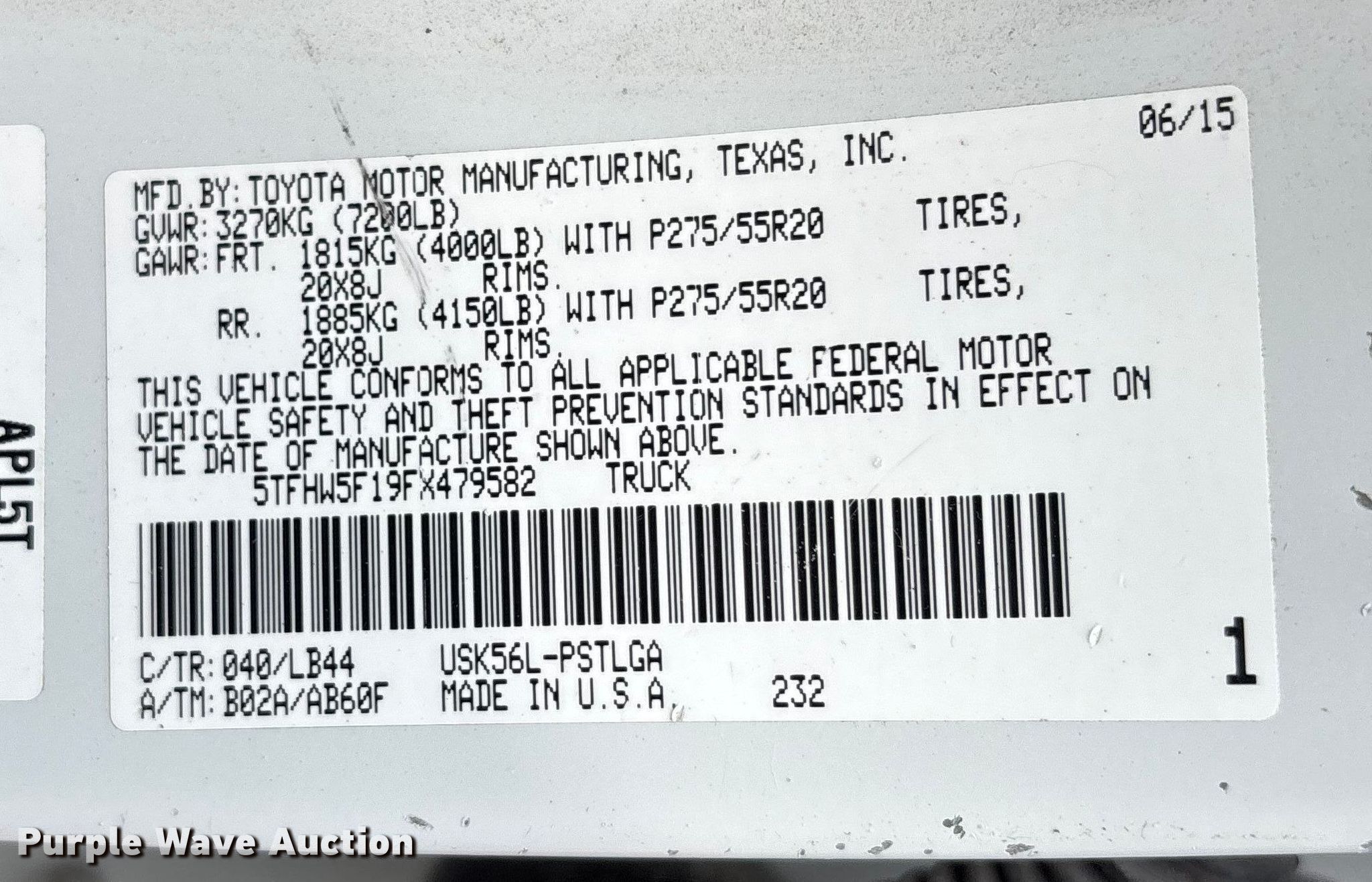 Purple Wave is selling a used 1/2 Ton Pickup or Van in Florida. This item is a 2015 Toyota Tundra Crew Cab pickup truck with the following: Miles: 131,710 on odometer, VIN: 5TFHW5F19FX479582