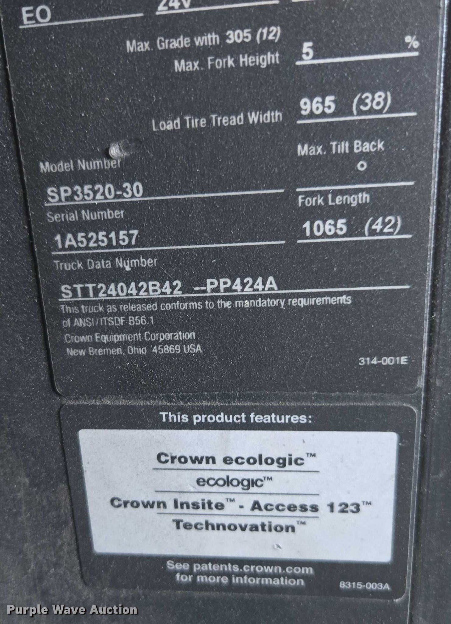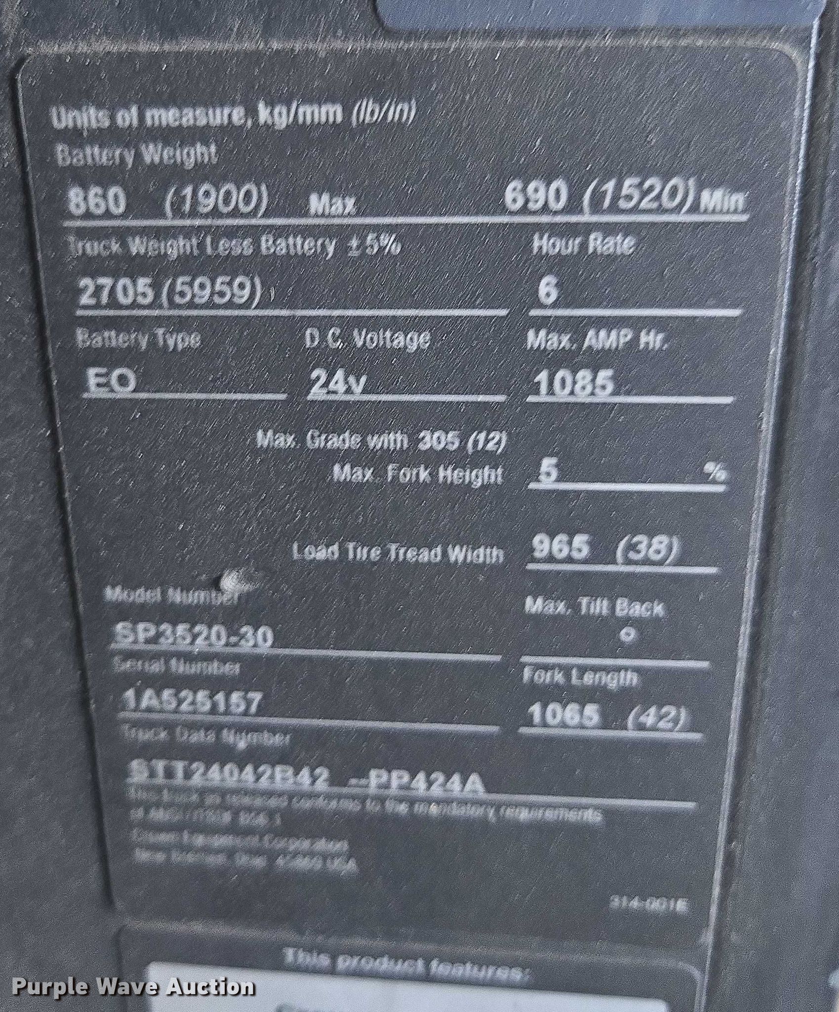 2018 Crown SP3520-30 order picker. Hours: 2,208 on meter, Miles or hours may vary, unit still in use, Serial: 1A525157, Unit #: SFS2926. Electric Motor Volts: 24. Transmission Electric drive. Operators station OROPS. Features Maximum lift capacity: 3,000 lbs, Maximum lift height: 240", Collapsed mast height: 108", Mast stages: 3, Fork length: 42". Tires Solid. Ferguson. Metairie, LA 70001