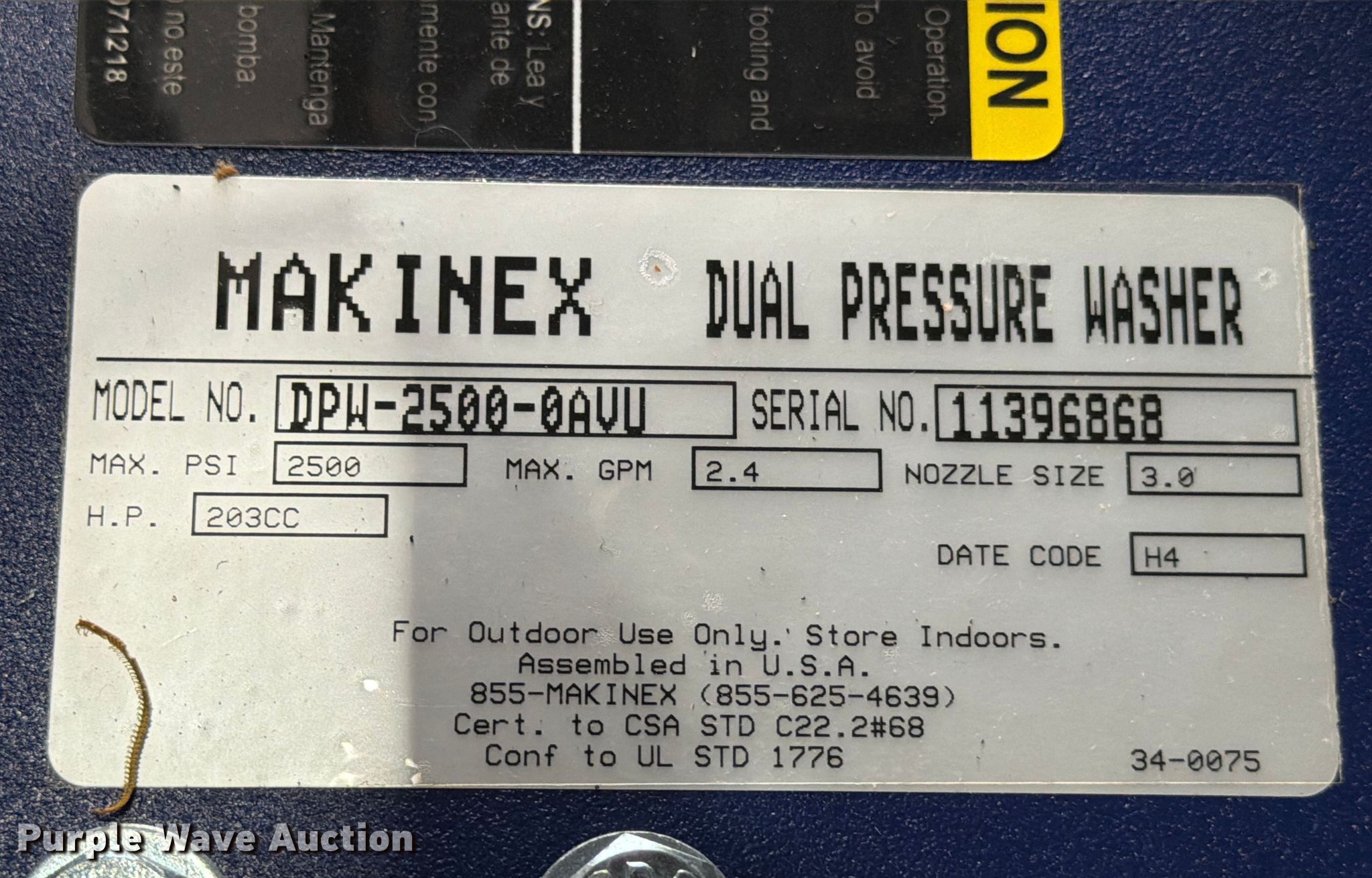 Purple Wave is selling a used Pressure Washer in Texas. This item is a Makinex DPW-2500 pressure washer with the following: Serial: 11396868