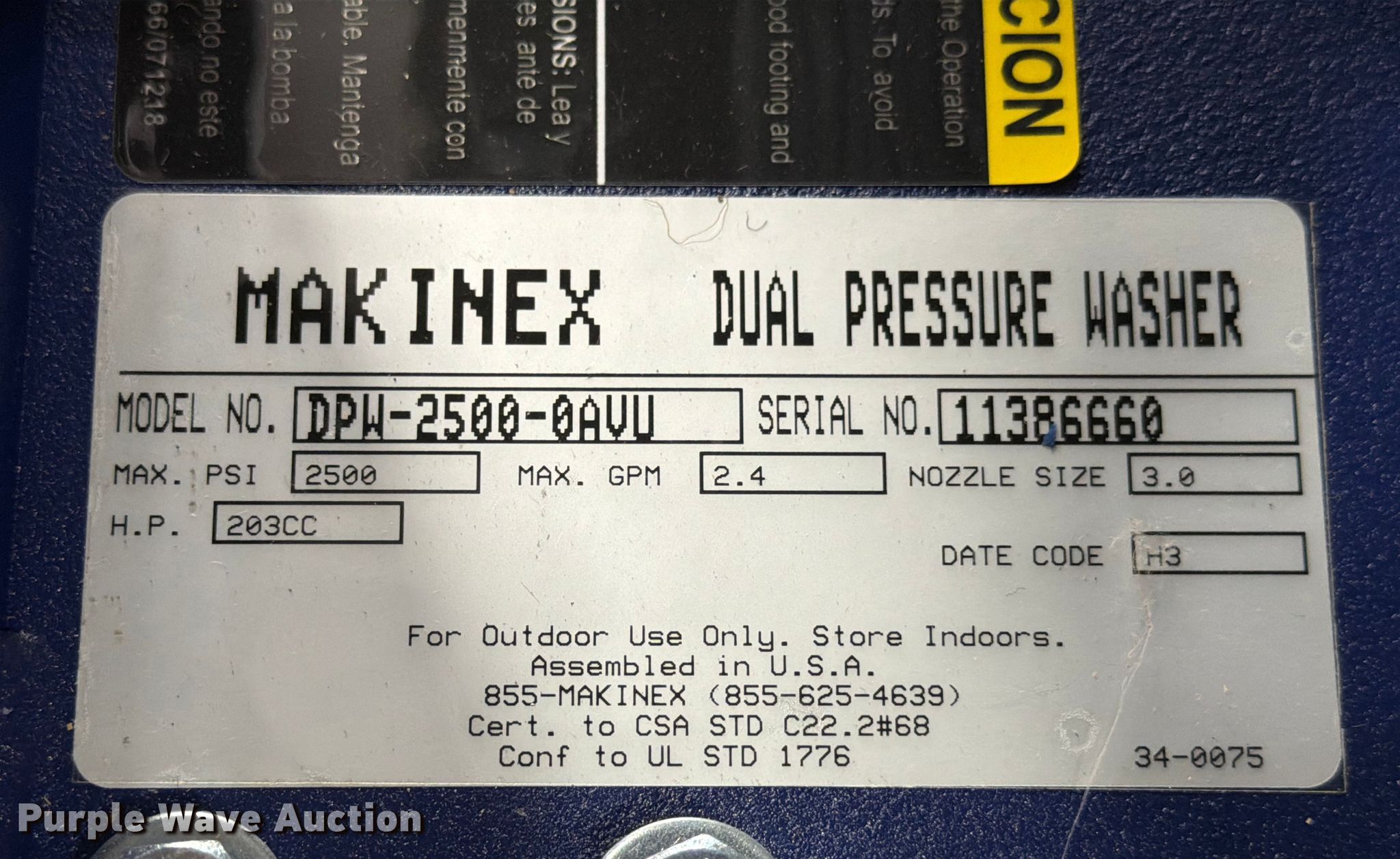 Purple Wave is selling a used Pressure Washer in Texas. This item is a Makinex DPW-2500 pressure washer with the following: Serial: 11386660