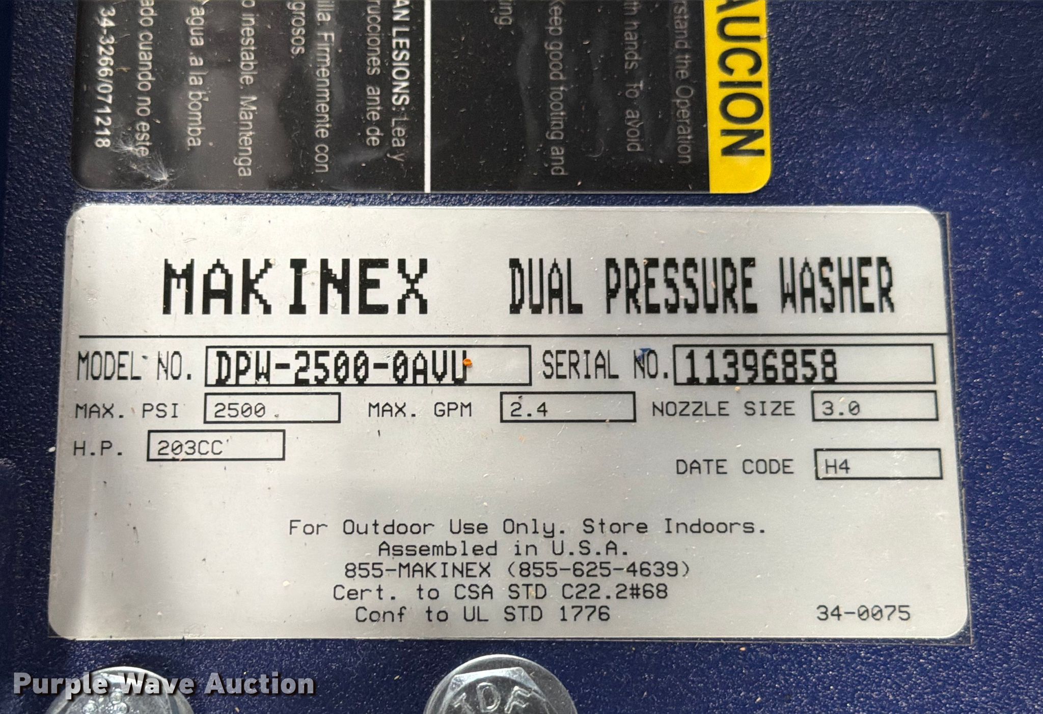 Purple Wave is selling a used Pressure Washer in Texas. This item is a Makinex DPW-2500 pressure washer with the following: Serial: 11396858