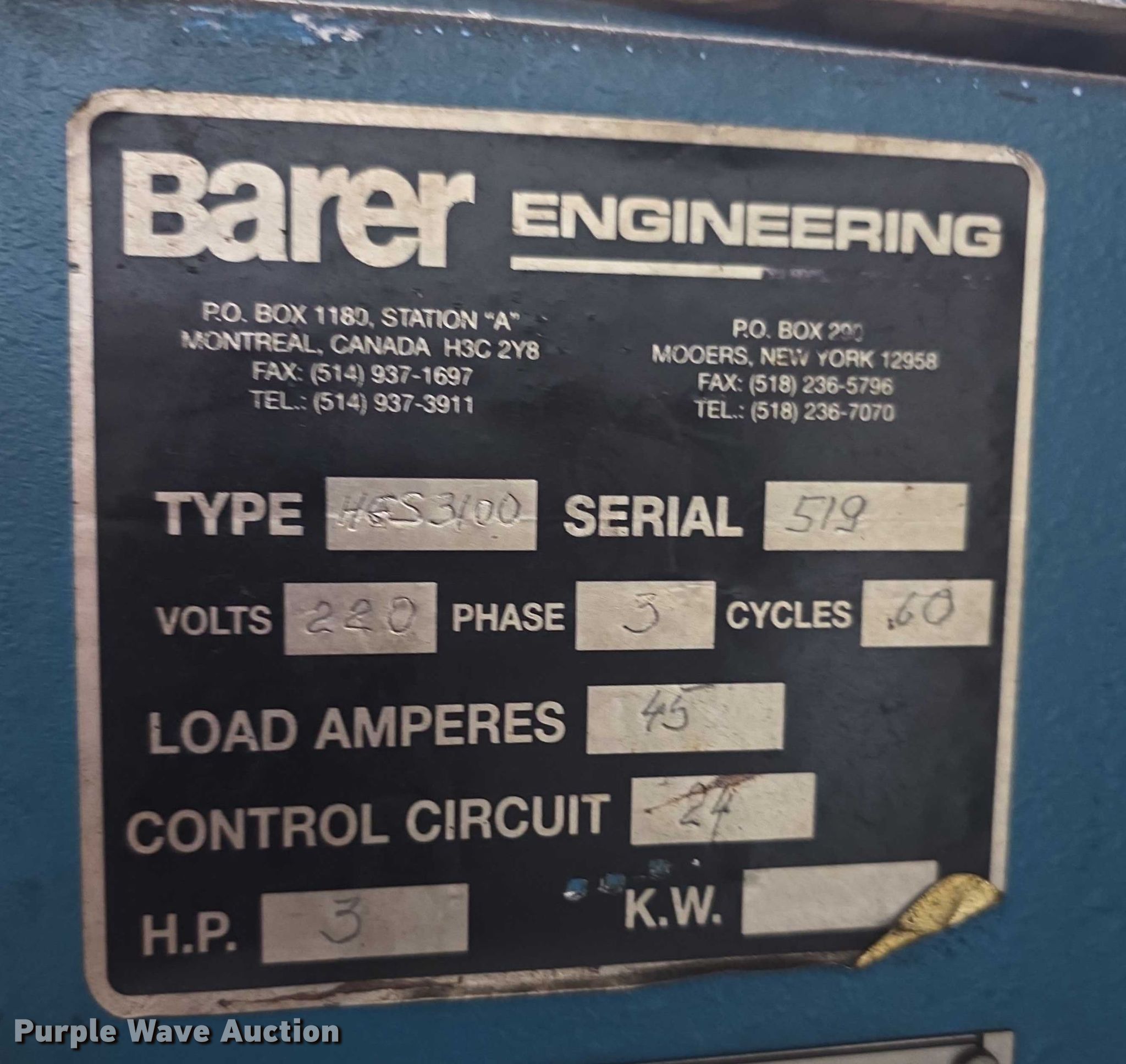 Purple Wave is selling a used Cutting Systems in Kansas. This item is a 10ft Barcorp HGS3100X6 metal brake with the following: Serial: 519