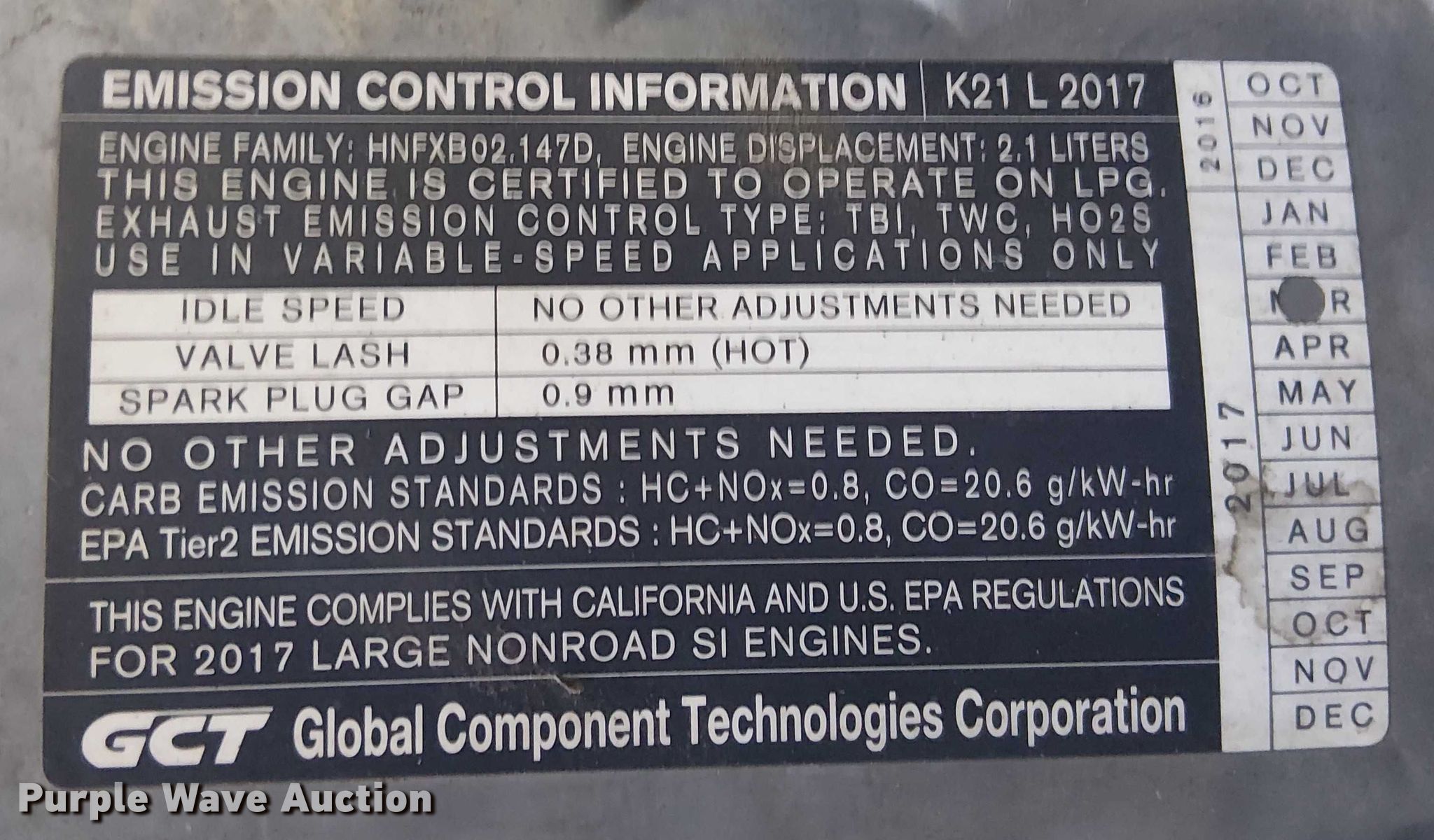 2017 UniCarriers PF50 forklift. Hours: 2,619 on meter, Miles or hours may vary, unit still in use, Serial: P1F2-9H22032, Unit #: SFS2985. Engine GCT K21L, Displacement: 2.1L, Cylinders: 4, Fuel type: LPG LP bottle: Not included. Transmission Automatic. Operators station OROPS. Features Maximum lift capacity: 3,325 lbs, Maximum lift height: 203", Collapsed mast height: 88", Mast stages: 3, Side shift, Mast tilt, Fork positioner, Fork length: 47". Tires Front: 7.00-12, Rear: 6.00-9, Solid. Notes Warning indicator: Master warning, Front driver side tire lug nut issues, loose. Ferguson. Phoenix, AZ 85024