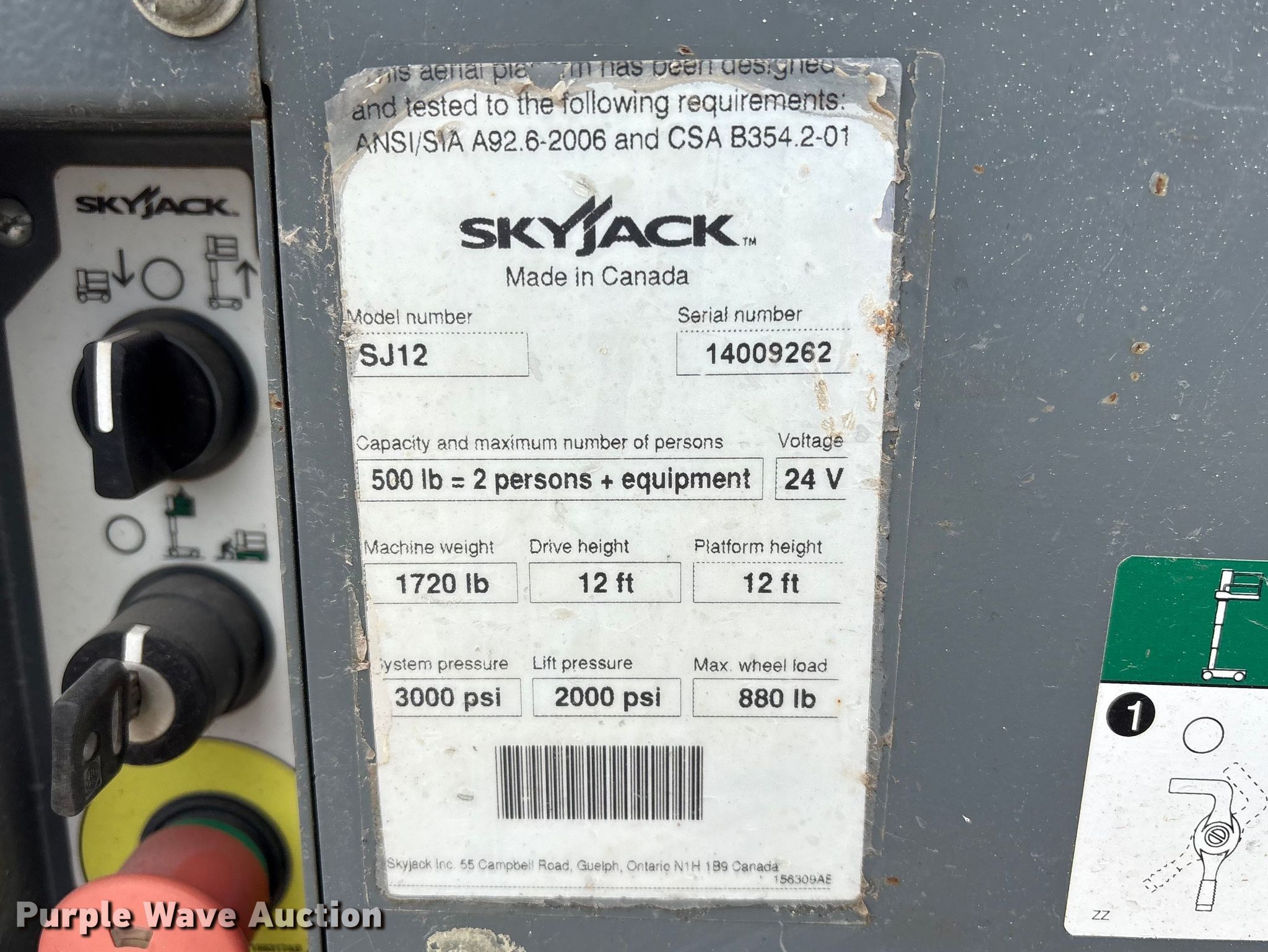 SkyJack SJ12 vertical lift. Hours: 137 on meter, Serial: 14009262. Features Maximum lift capacity: 500 lbs, Maximum lift height: 12', Platform: 39" L x 29" W, AC power outlet, Controls: Platform, Ground. Tires Tire size: 12x4, Solid. Jordan Truck and Equipment. Waterloo, NE 68069
