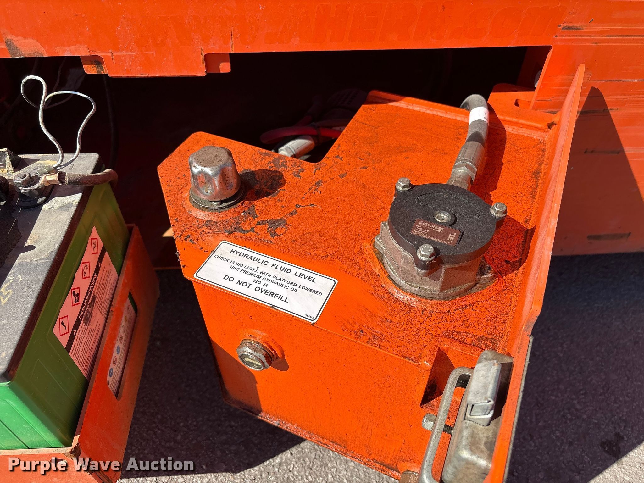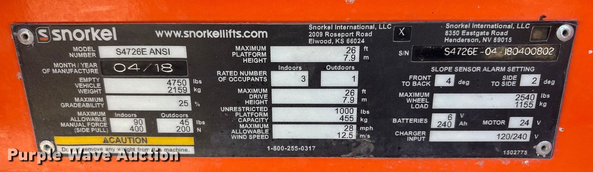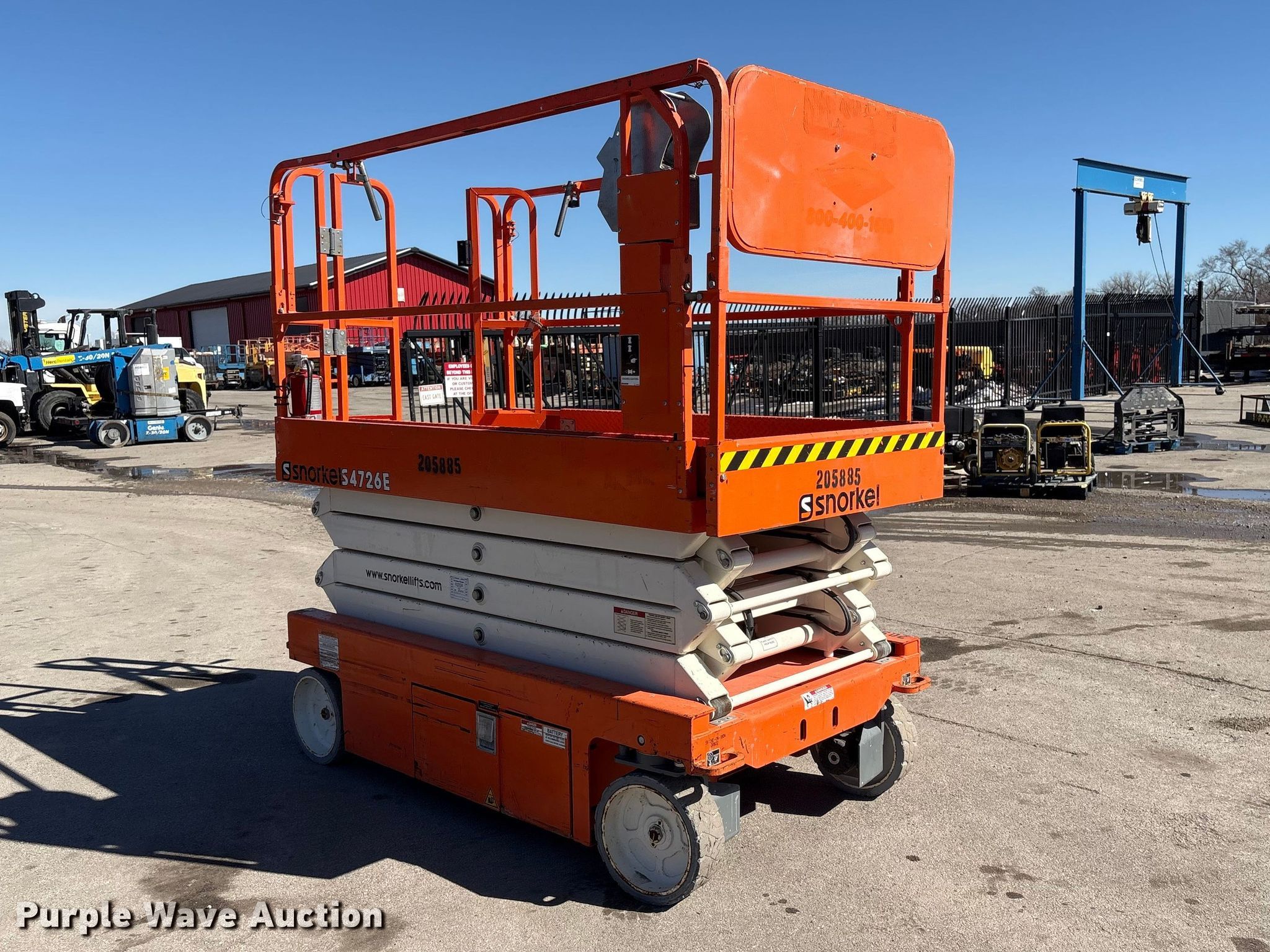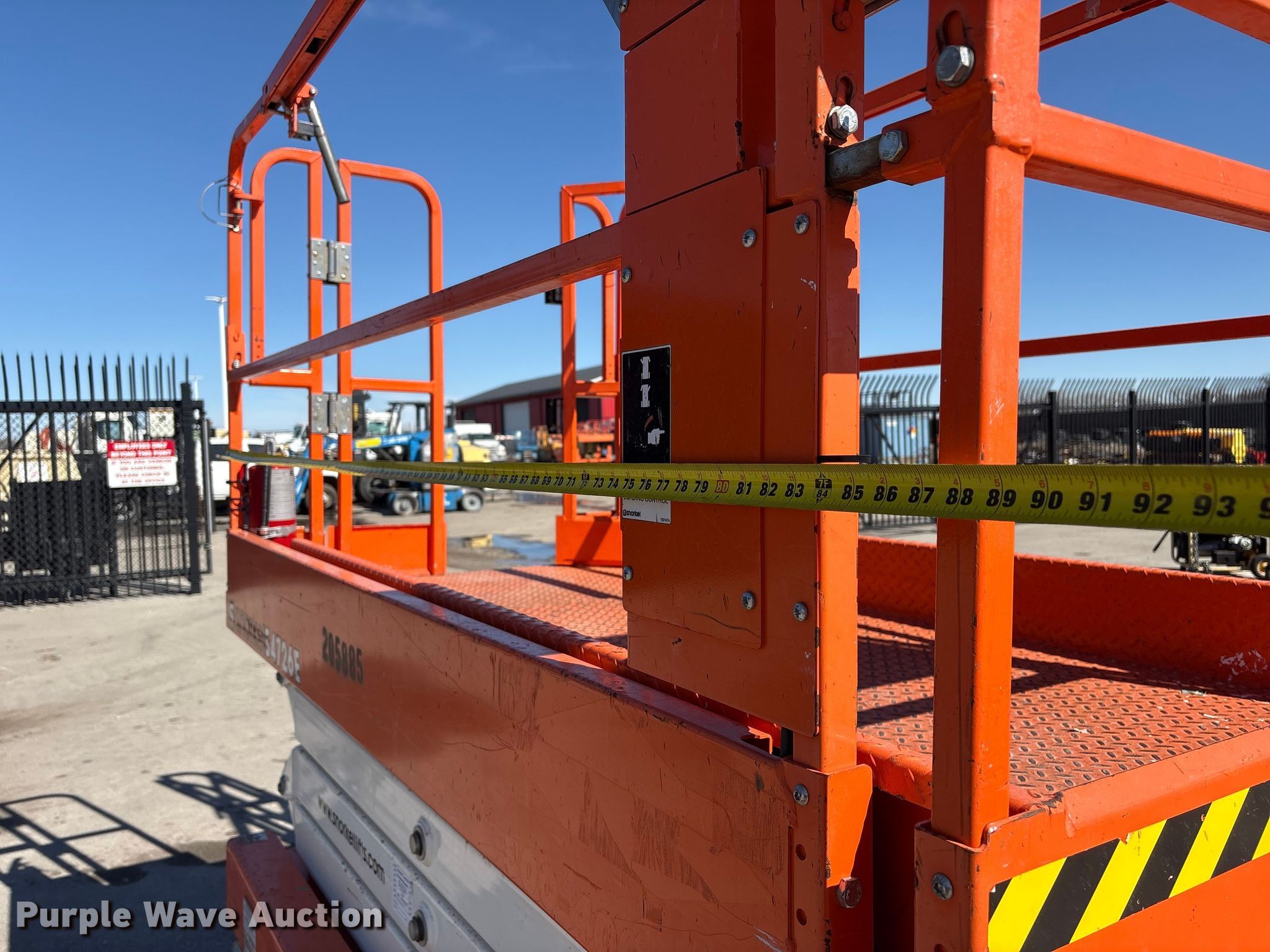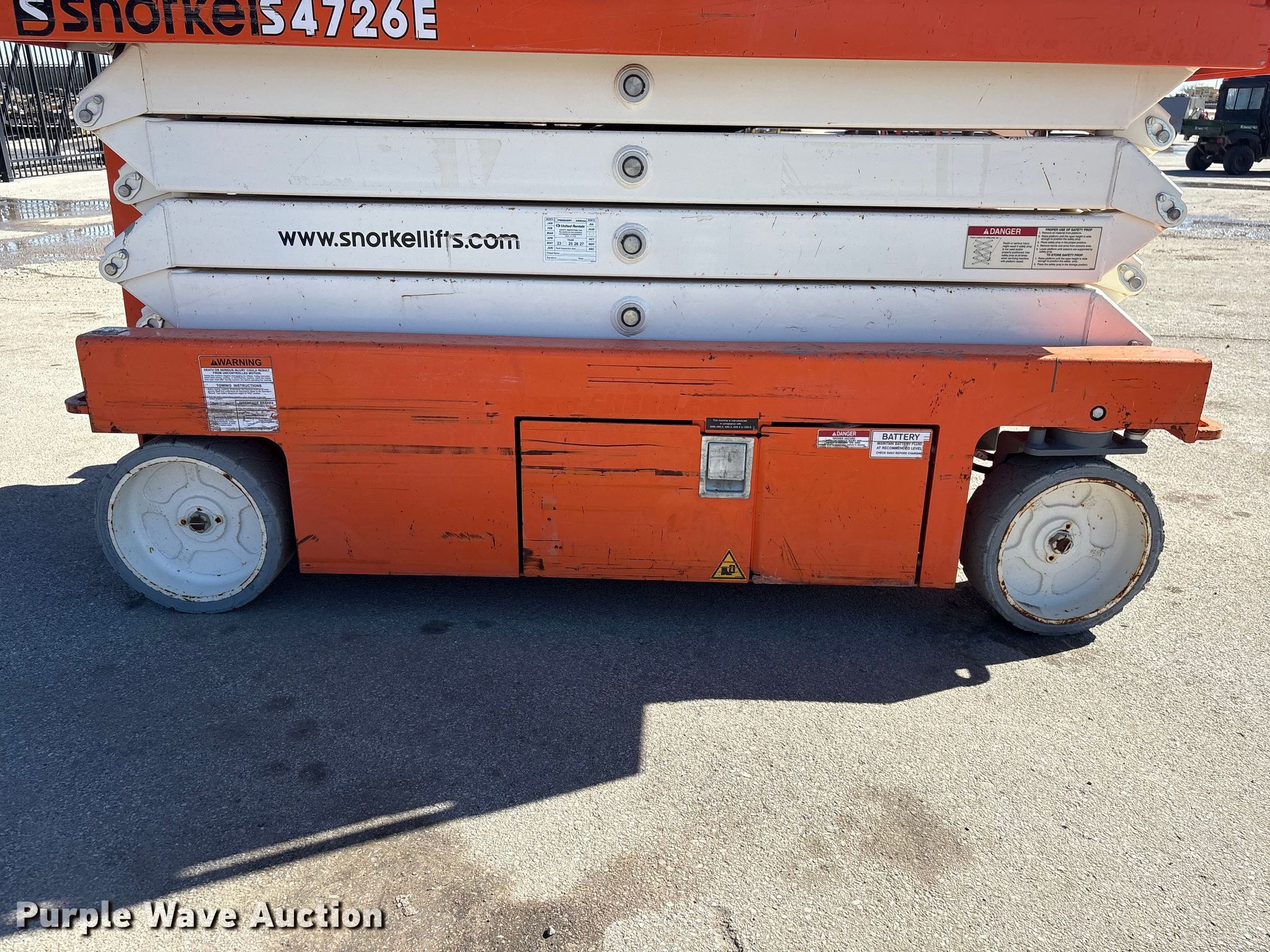 Purple Wave is selling a used Scissor or Vertical Lift in Nebraska. This item is a 2019 Snorkel S4726E ANSI scissor lift with the following: Hours: 281 on meter, Serial: S4726E-04-180400802
