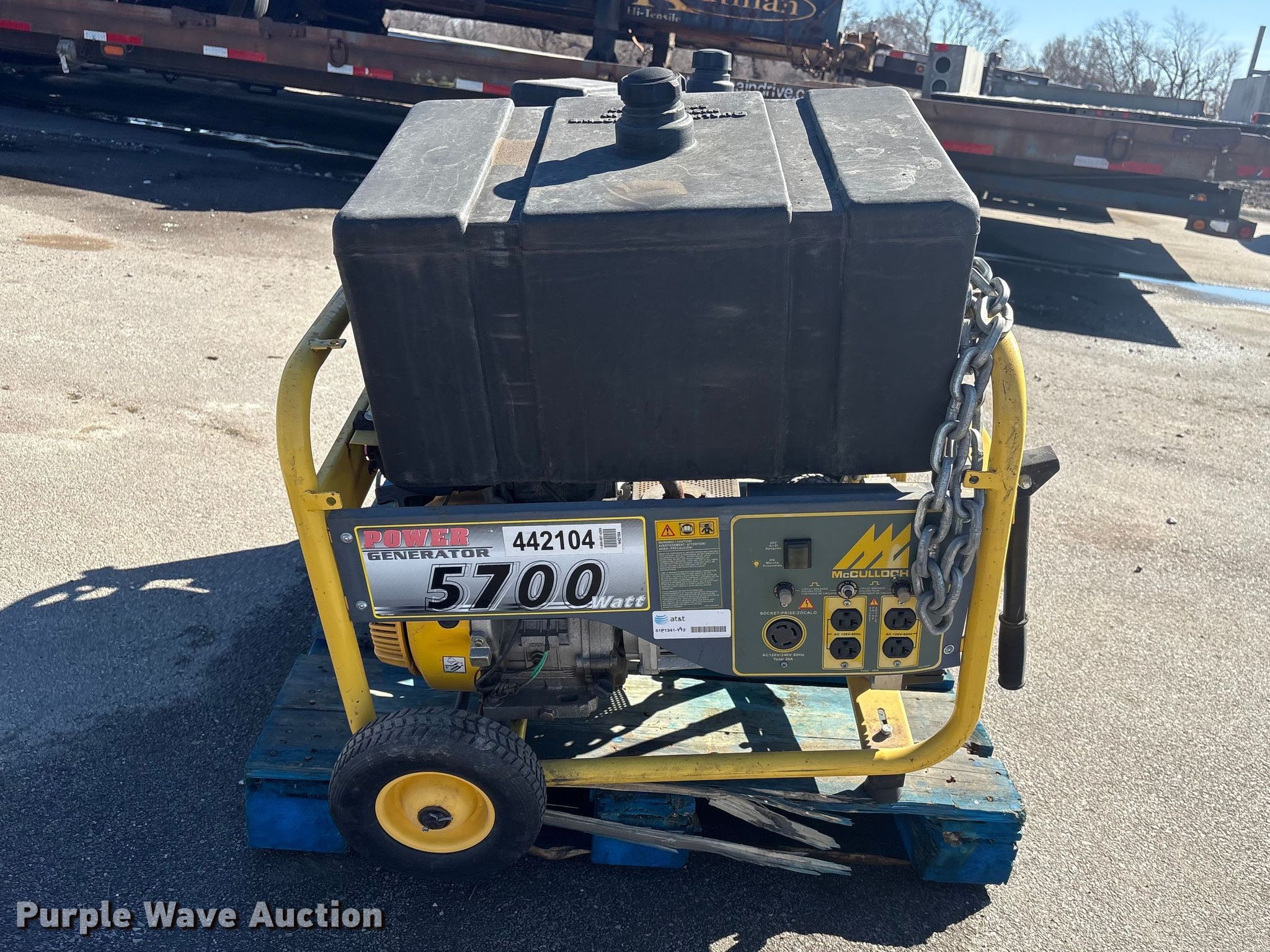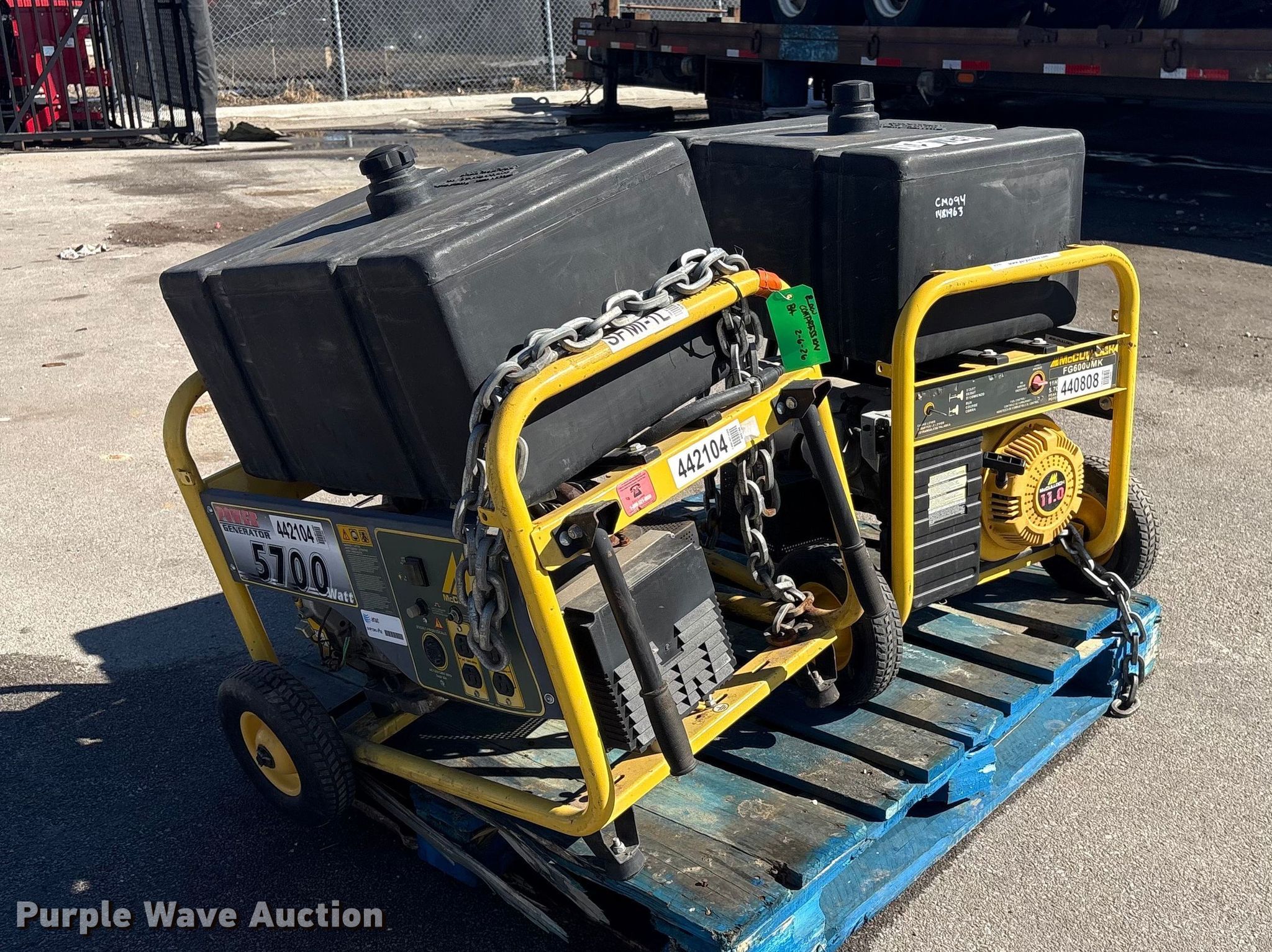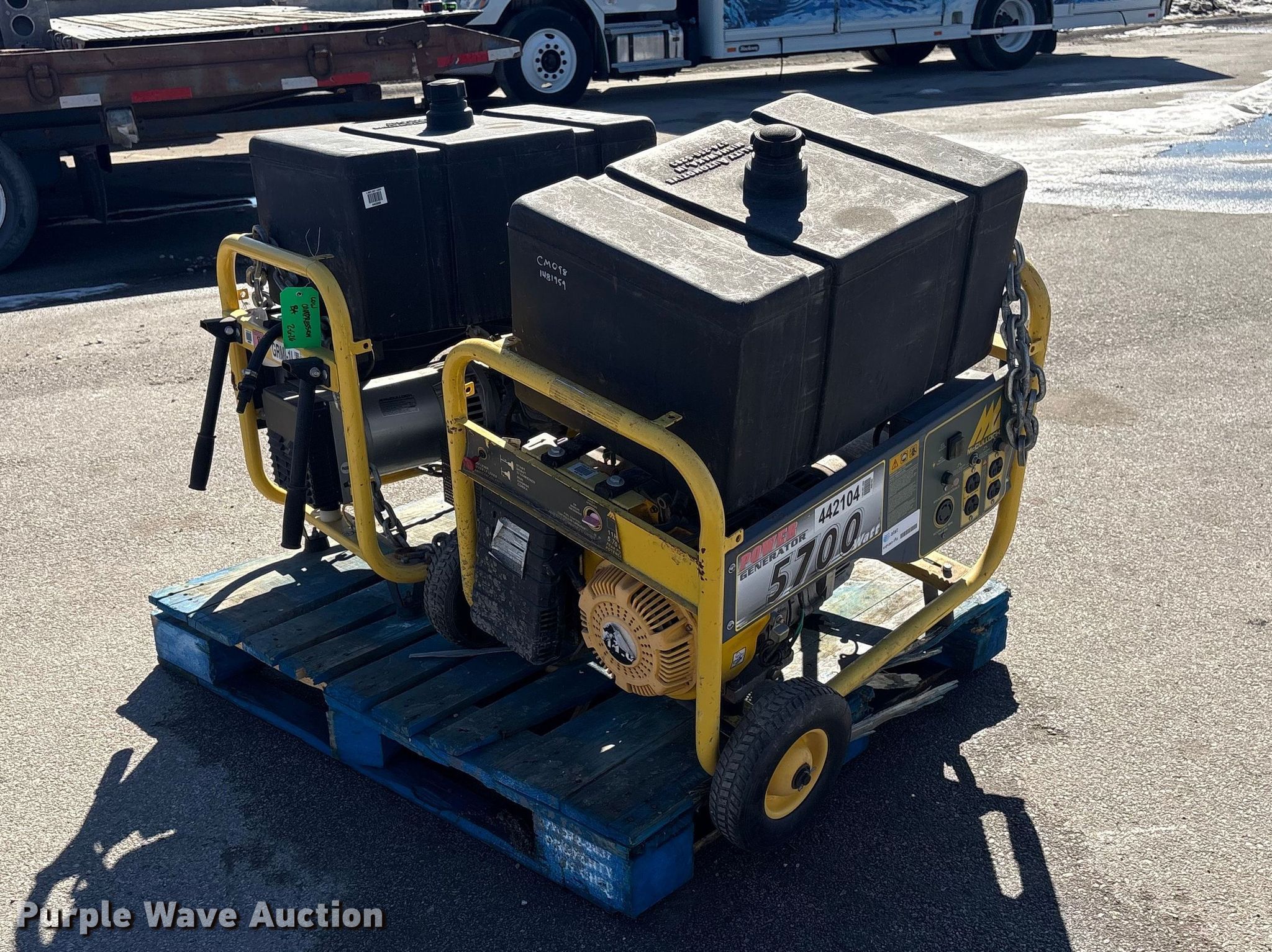 (2) McCulloch FG6000MKUD-C generators. Serial: 2006100-16187, Serial: 2006H00 14515, Dimensions: 30" L x 27" W x 32" H. Features Fuel type: Gas, kW: 5.7, HZ: 60, Volts: 120. Notes Unknown operating condition. Jordan Truck and Equipment. Waterloo, NE 68069