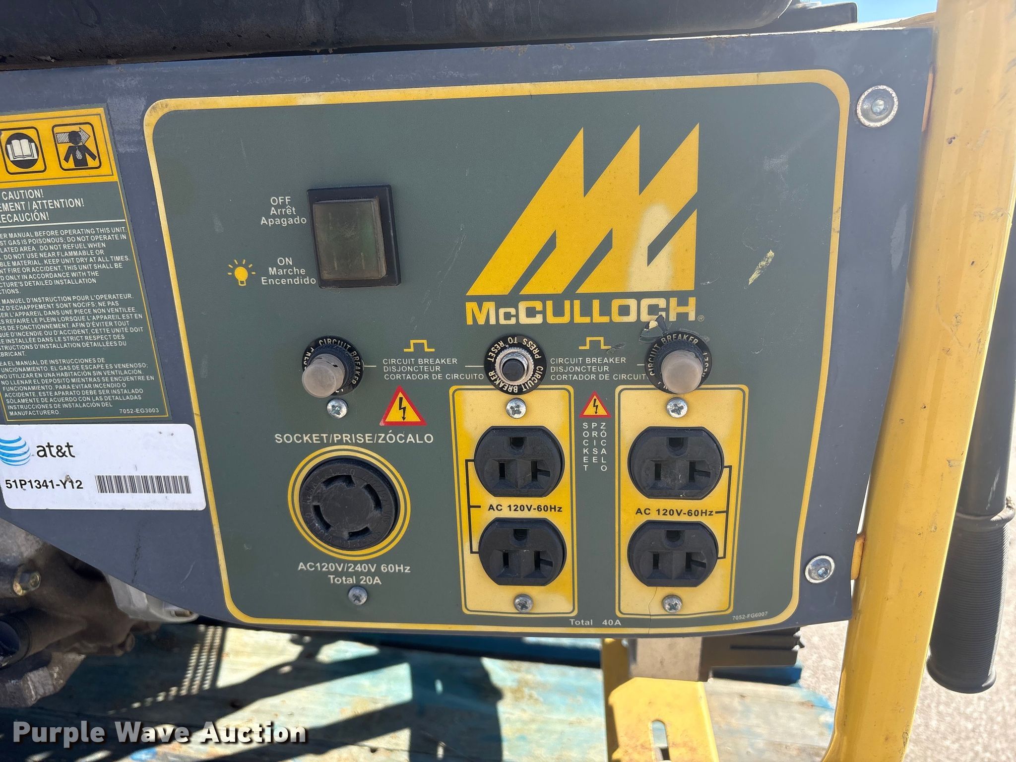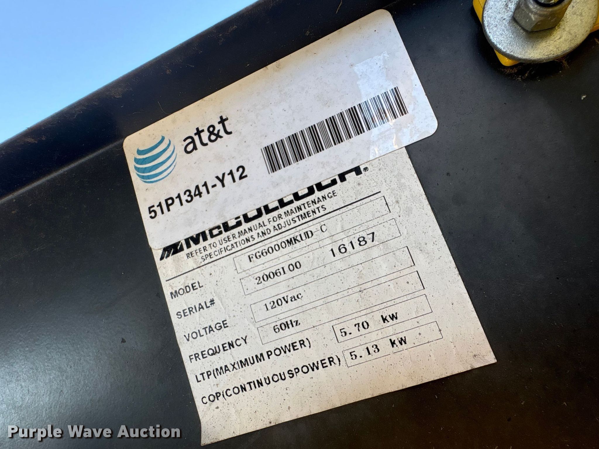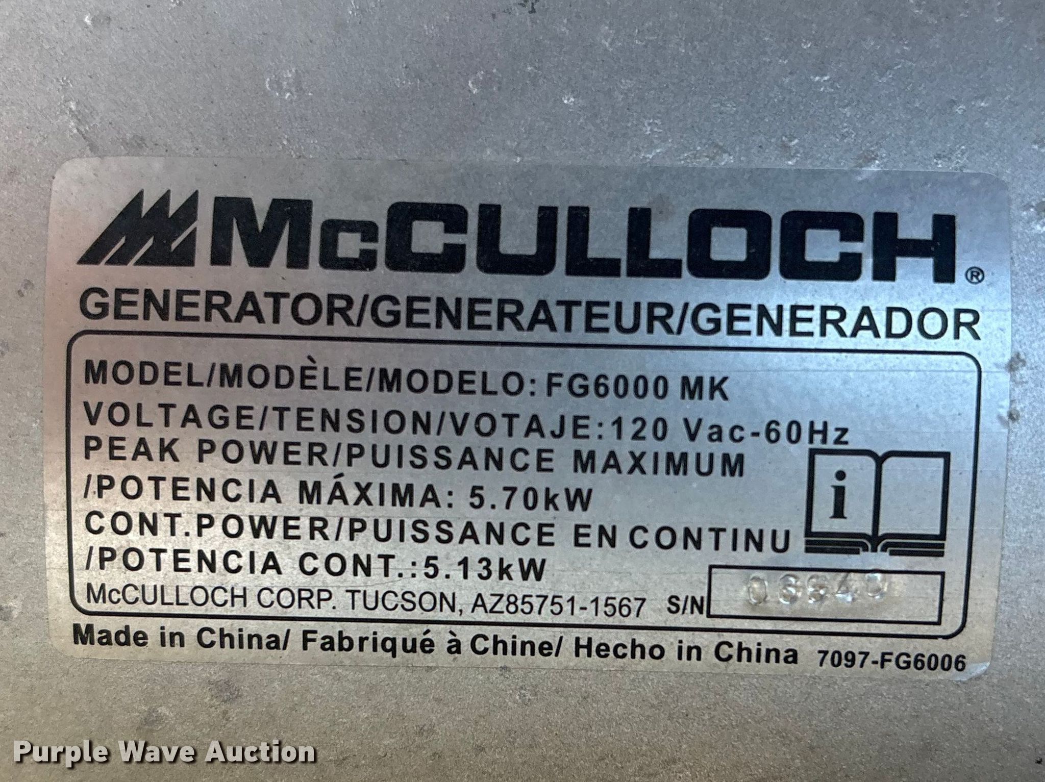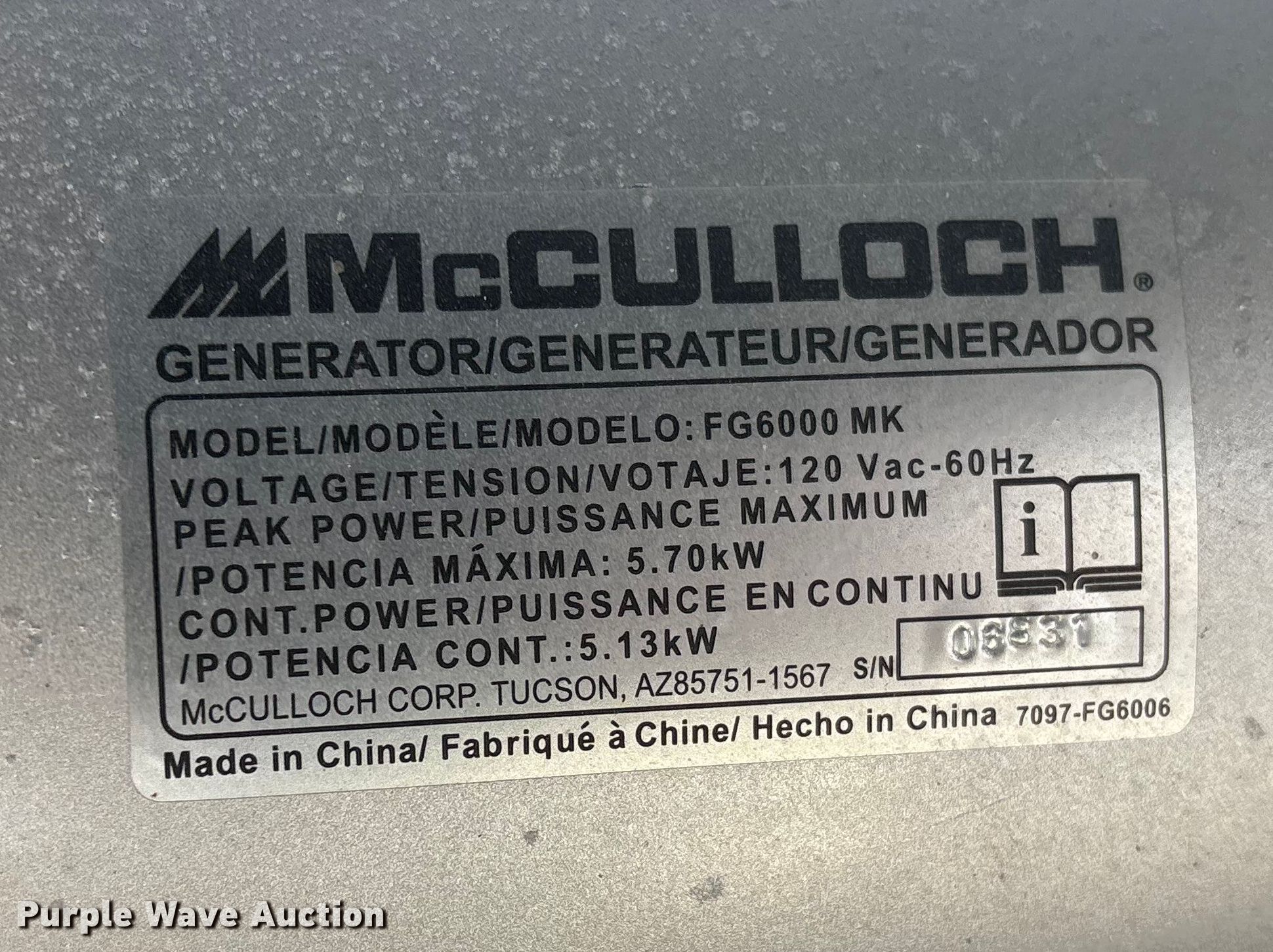 Purple Wave is selling a used Generator Set in Nebraska. This item is a (2) McCulloch FG6000MKUD-C generators with the following: Serial: 2006100-16187, Serial: 2006H00 14515, Dimensions: 30" L x 27" W x 32" H