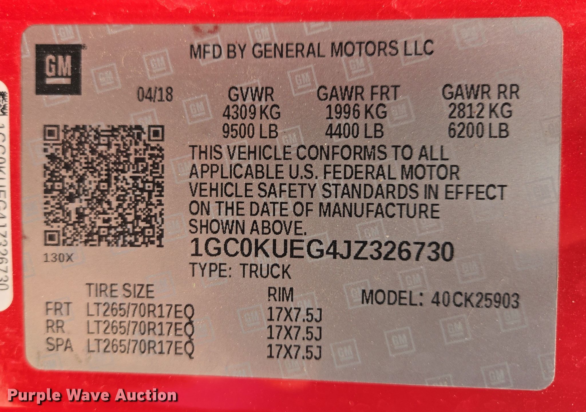 - VIN: 1GC0KUEG4JZ326730