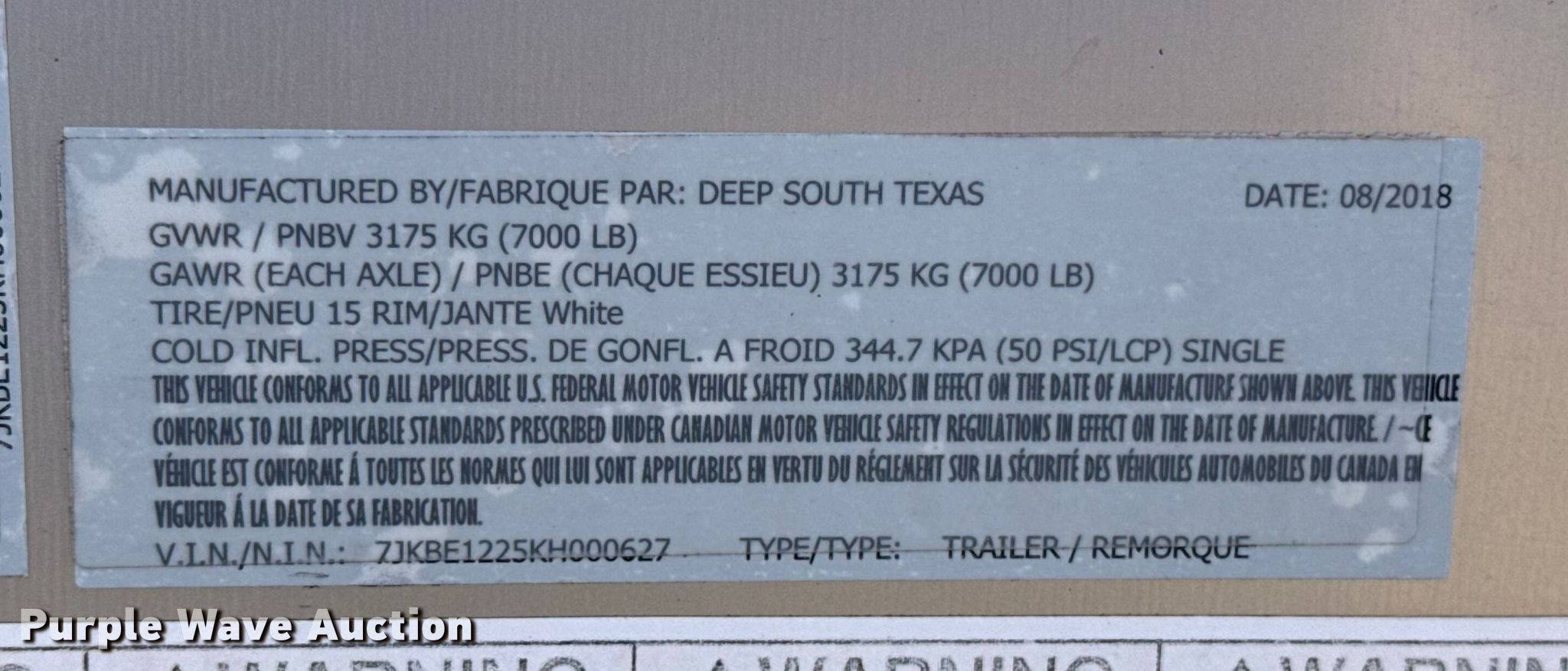 2019 Deep South Texas enclosed cargo trailer. VIN: 7JKBE1225KH000627, Unit #: 5-817031. Dimensions Overall Length: 16' 6", Width: 102", Body Length: 13' 8", Width: 84", Rear door / ramp 65" L x 73.5" W. Features Deck type: Wood. Chassis Ball hitch: 2 5/16", Landing gear: Single, Suspension: Spring, Brakes: Electric, Axles: Tandem, GVWR: 7,000 lbs, GAWR: 7,000 lbs. Tires Steel wheels, Size: ST205/75R16. Notes Hail damage. Oklahoma title. Title distribution may be delayed up to 14 days from verification of funds. Oklahoma Farm Bureau Insurance. Seminole, OK 74868