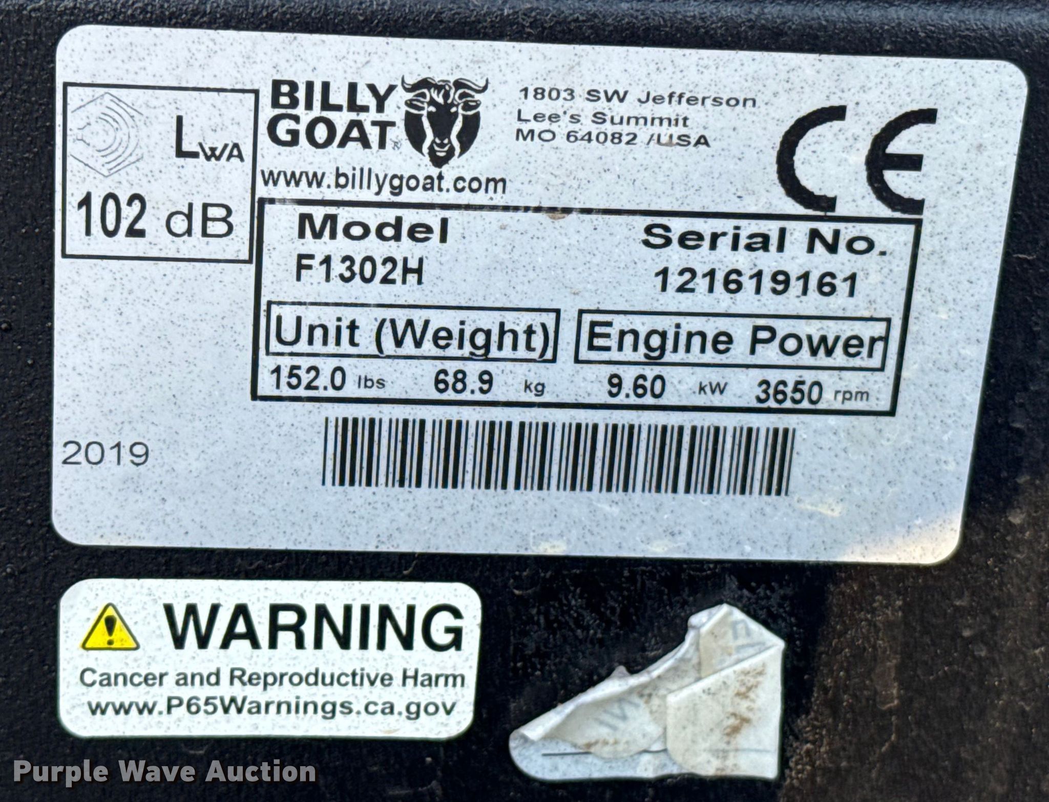Purple Wave is selling a used Lawn and Garden in Oklahoma. This item is a Billy Goat F1302H leaf blower with the following: Serial: 121619161