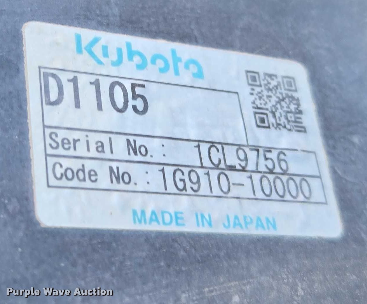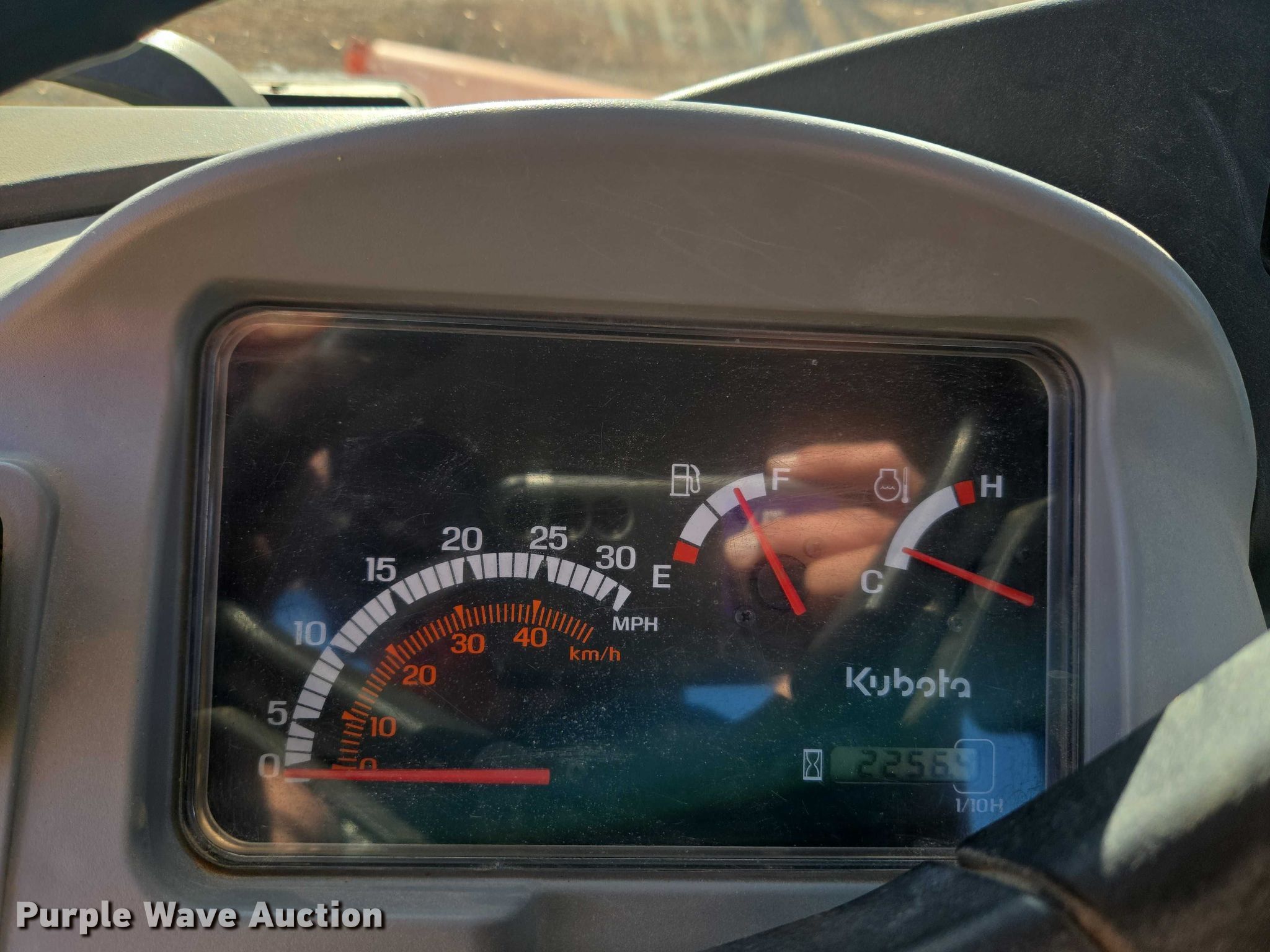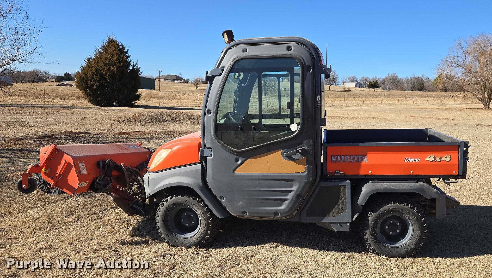 2015 Kubota RTV100 utility vehicle. Hours: 2,256 on meter, VIN: A5KC1HDAJCG035903. Engine Kubota D1105-ET03, Serial: 1CL9756, Displacement: 1.1L, Cylinders: 3, Fuel type: Diesel, Electric start. Transmission Automatic. Chassis Four wheel drive/ All wheel drive. Operators station Enclosed cab, AC, Heat. Features Dump bed 49" L x 54" W, Dump bed type: Electric/ Hydraulic, Attachment Kubota VT260, Description: Broom, Width: 60", Serial: 21807484. Tires Size: 25/10.00-12NHS. Transfer of ownership documentation will be a bill of sale. FWAuto Remarketing LLC. Yukon, OK 73099