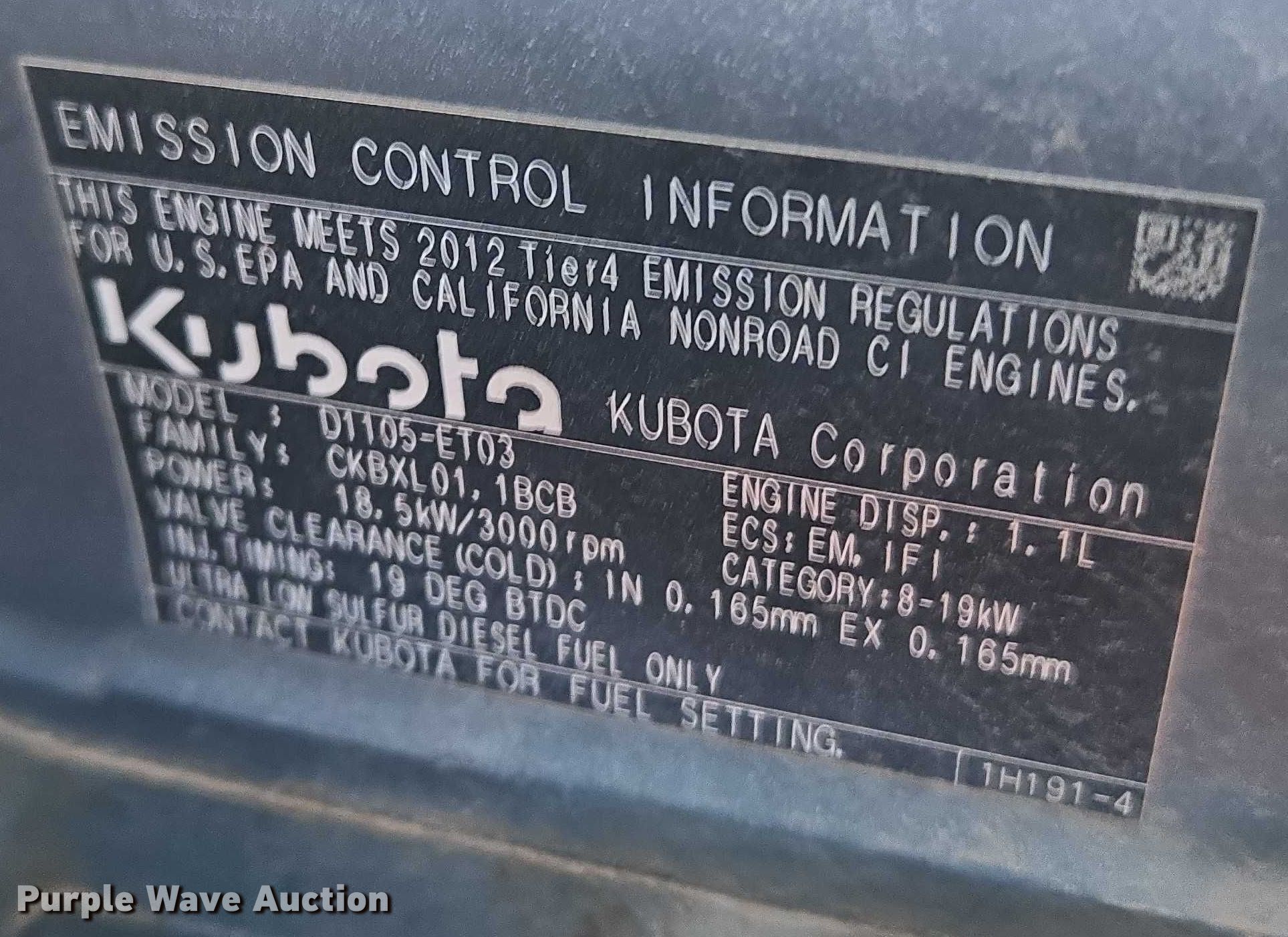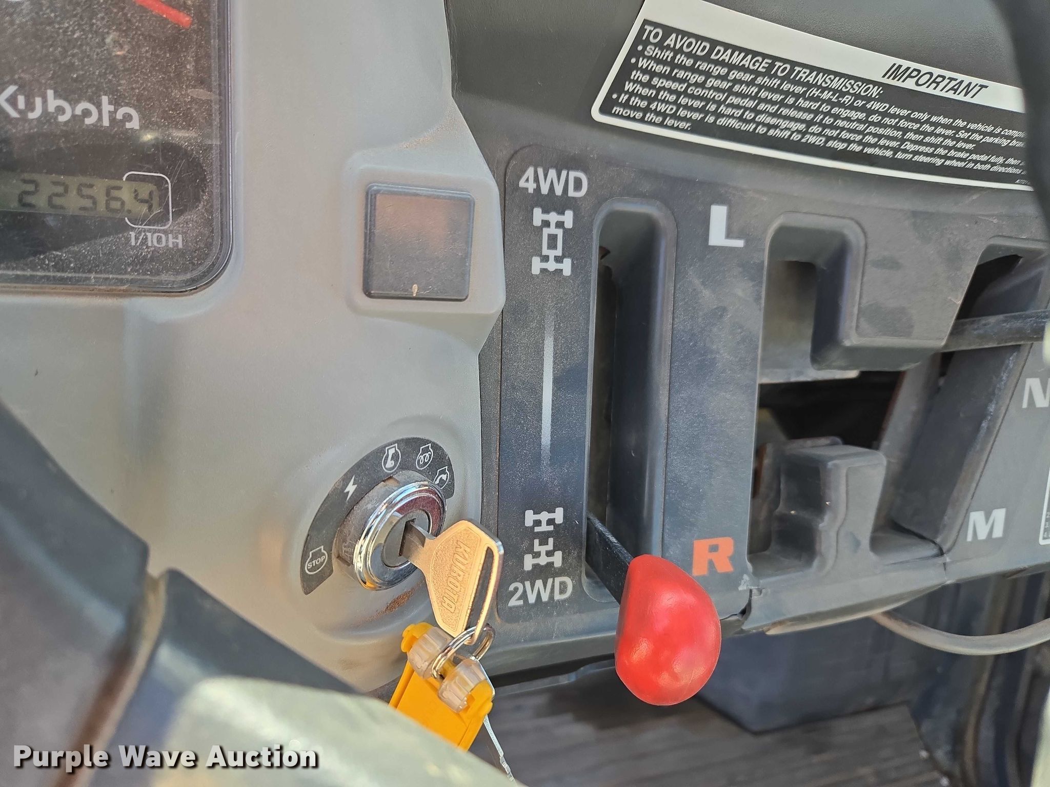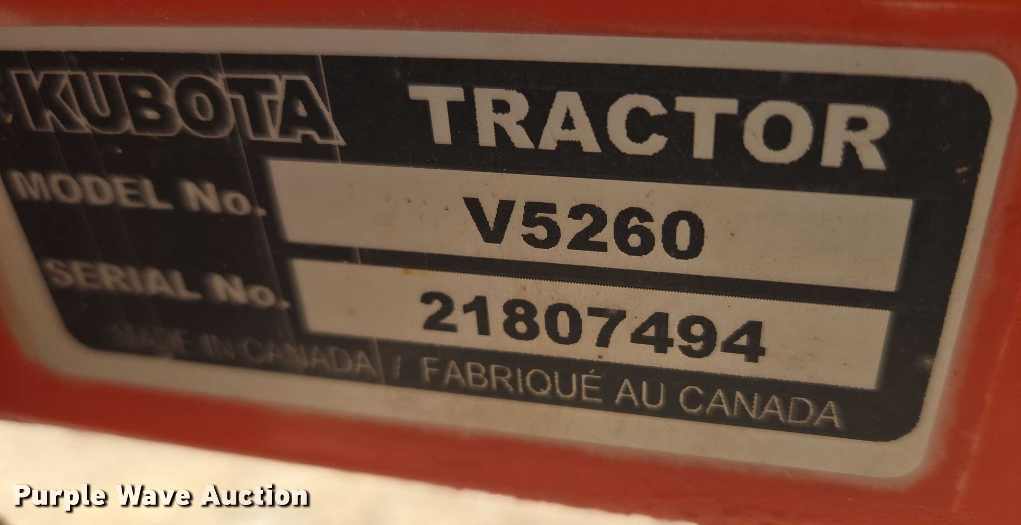 2015 Kubota RTV100 utility vehicle. Hours: 2,256 on meter, VIN: A5KC1HDAJCG035903. Engine Kubota D1105-ET03, Serial: 1CL9756, Displacement: 1.1L, Cylinders: 3, Fuel type: Diesel, Electric start. Transmission Automatic. Chassis Four wheel drive/ All wheel drive. Operators station Enclosed cab, AC, Heat. Features Dump bed 49" L x 54" W, Dump bed type: Electric/ Hydraulic, Attachment Kubota VT260, Description: Broom, Width: 60", Serial: 21807484. Tires Size: 25/10.00-12NHS. Transfer of ownership documentation will be a bill of sale. FWAuto Remarketing LLC. Yukon, OK 73099