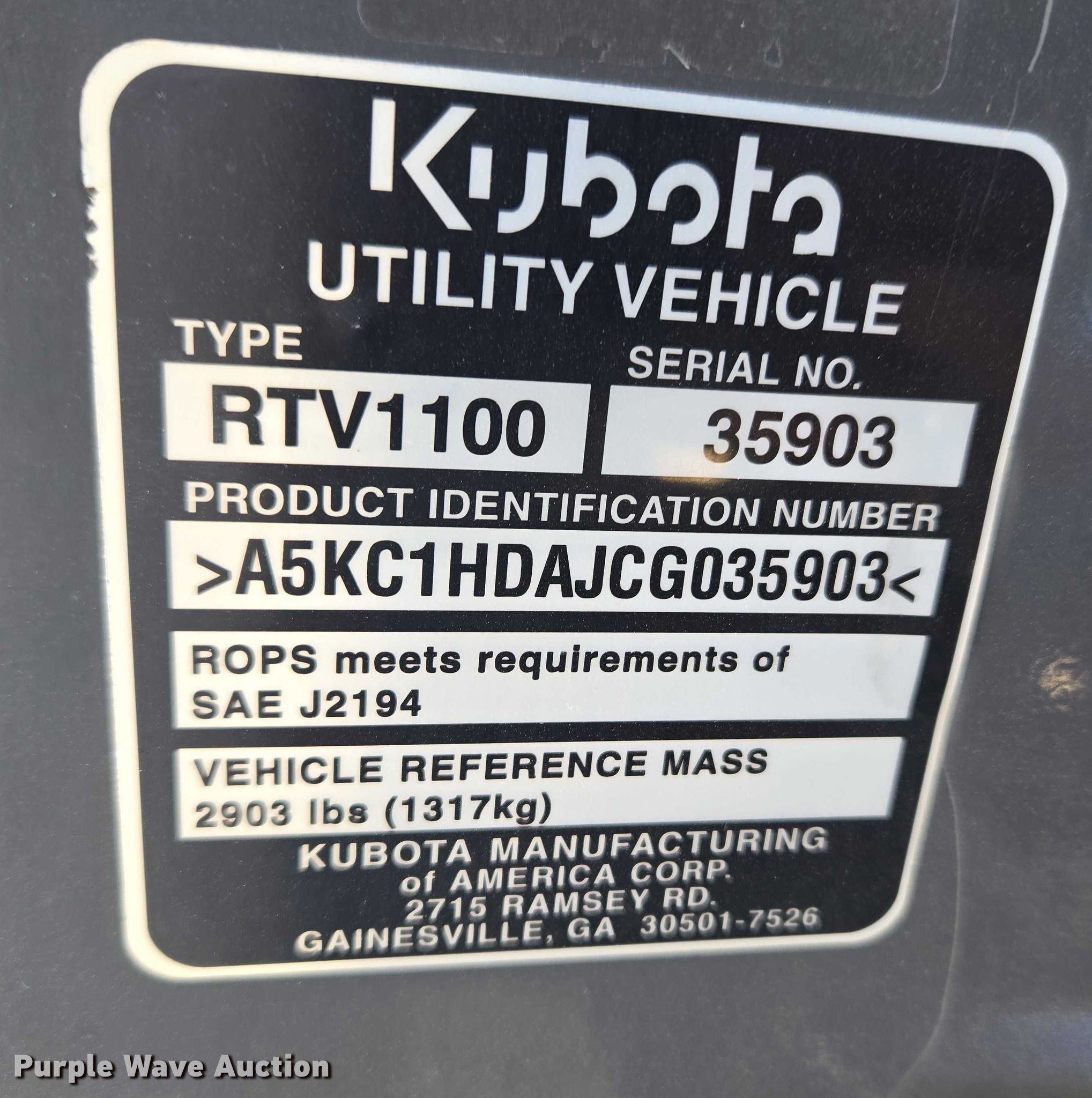 Purple Wave is selling a used Utility Vehicle in Oklahoma. This item is a 2015 Kubota RTV100 utility vehicle with the following: Hours: 2,256 on meter, VIN: A5KC1HDAJCG035903