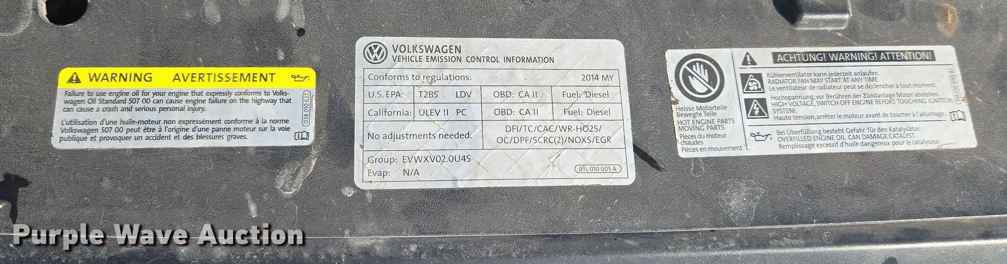 2014 Volkswagen Passat. Miles: 151,133 on odometer, VIN: 1VWCN7A36EC109307. Engine Cylinders: 4, Fuel type: Diesel. Transmission Automatic. Interior AC, Heat, Seat: Heated, Power driver, Power passenger, Heated mirrors, Power windows, Power locks, Cruise control, Backup camera, Powered sunroof. Tires Size: 235/45R18. Notes Windshield chipped or cracked. Oklahoma title. Title distribution may be delayed up to 14 days from verification of funds. BNB Industries. Wynnewood, OK 73098