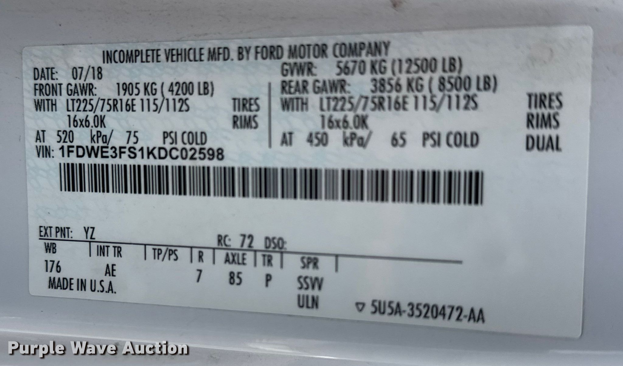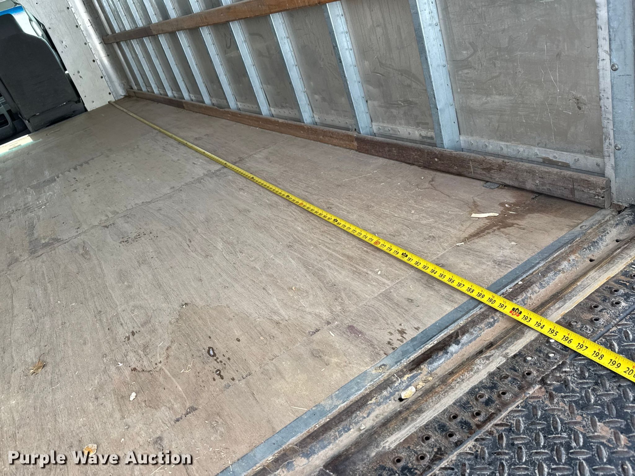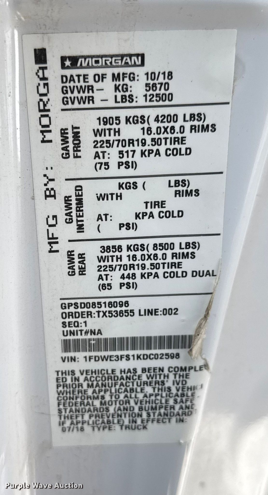 2019 Ford E350 Super Duty box truck. Miles: 168,339 on odometer, VIN: 1FDWE3FS1KDC02598. Engine Displacement: 6.8L, Cylinders: 10, Fuel type: Gas. Transmission Automatic. Chassis Axles: Single, Suspension: Spring, Brakes: Hydraulic, GVWR: 12,500 lbs, Wheelbase: 176". Interior AC, Heat, Power windows, Power locks, Cruise control. Features Bed Box bed, Morgan GPSD085 6096, Serial: MTX53655-002, Length: 16', Width: 96", Height: 7' 4", E-track rail system, Floor: Wood, End gate lift, Capacity: 2,000 lbs. Tires Size: 225/75R16. Notes Dash warning indicator: Check engine, Unknown operating condition of end gate lift, Transmission issues , Non-operational unit, Unit must be towed or hauled. Kansas title. Title distribution may be delayed up to 14 days from verification of funds. Fisher Lumber Co. Garden Plain, KS 67050