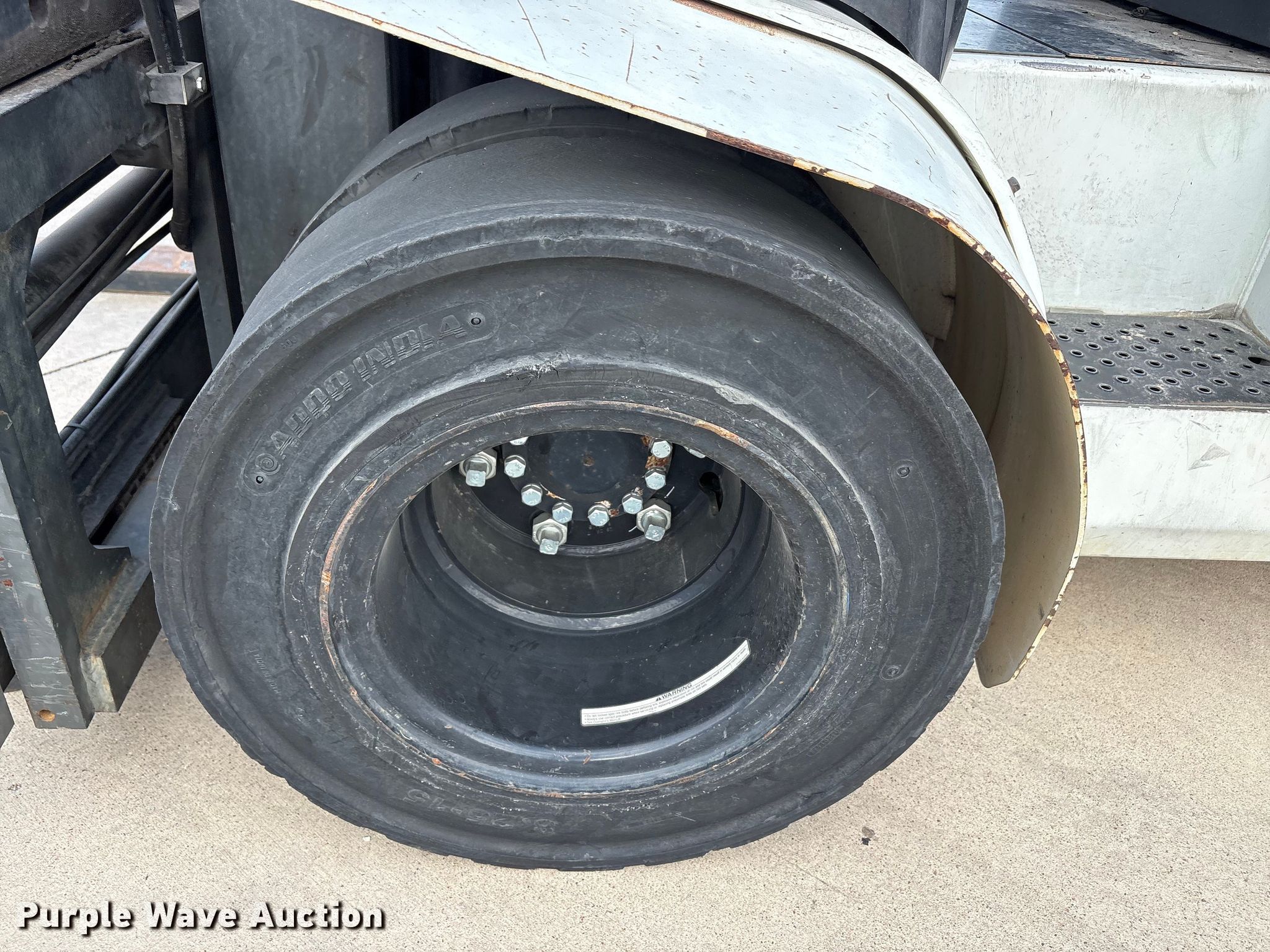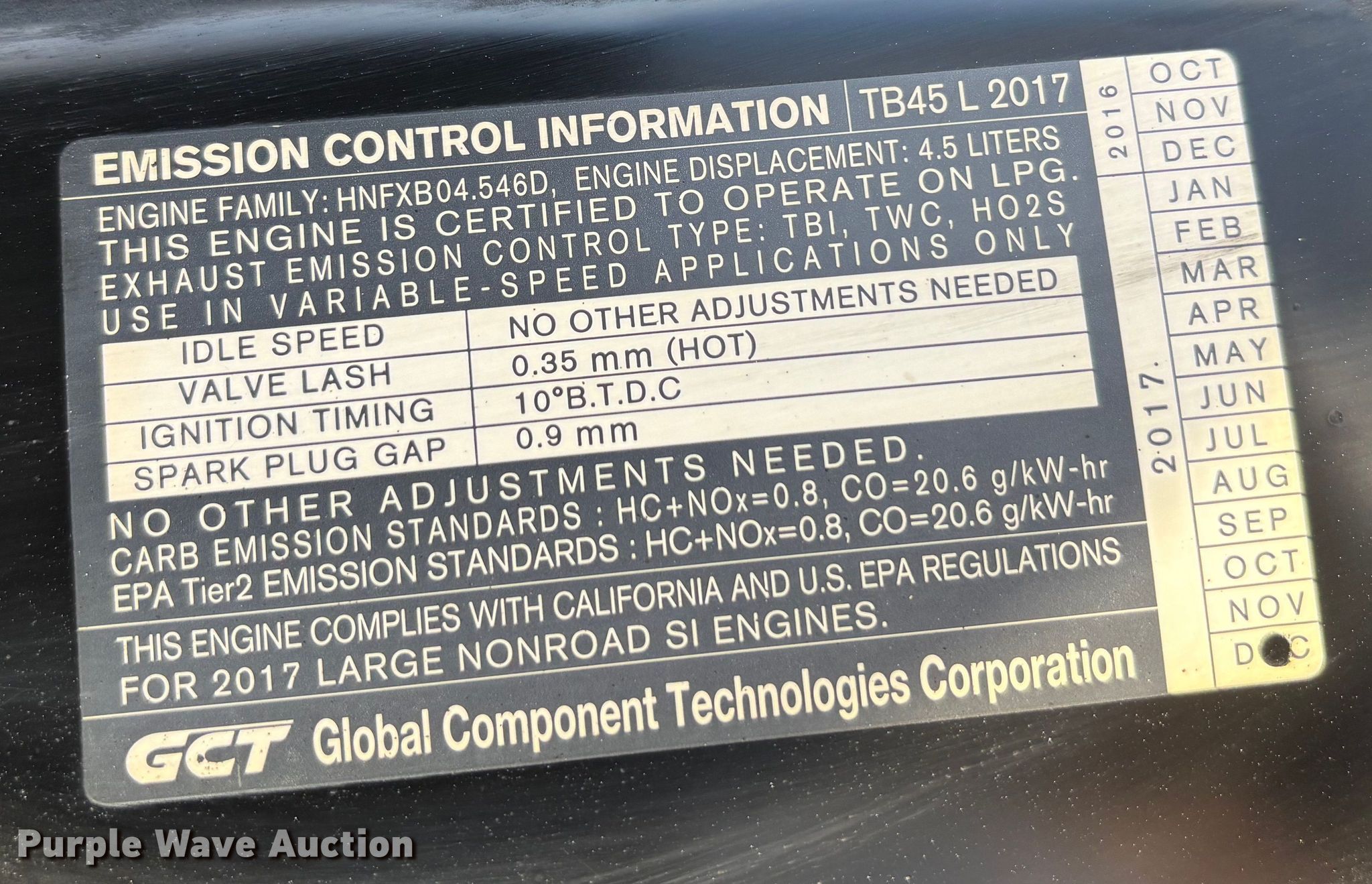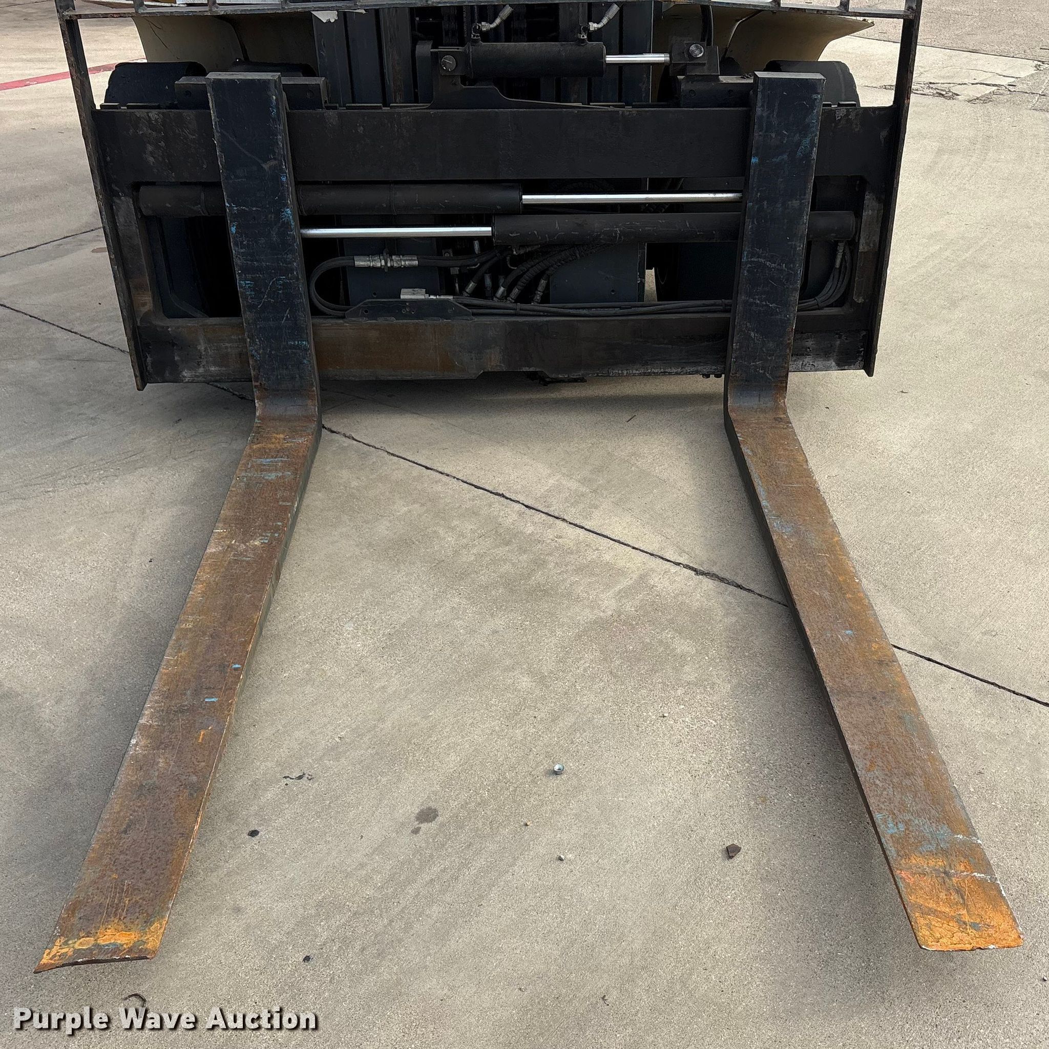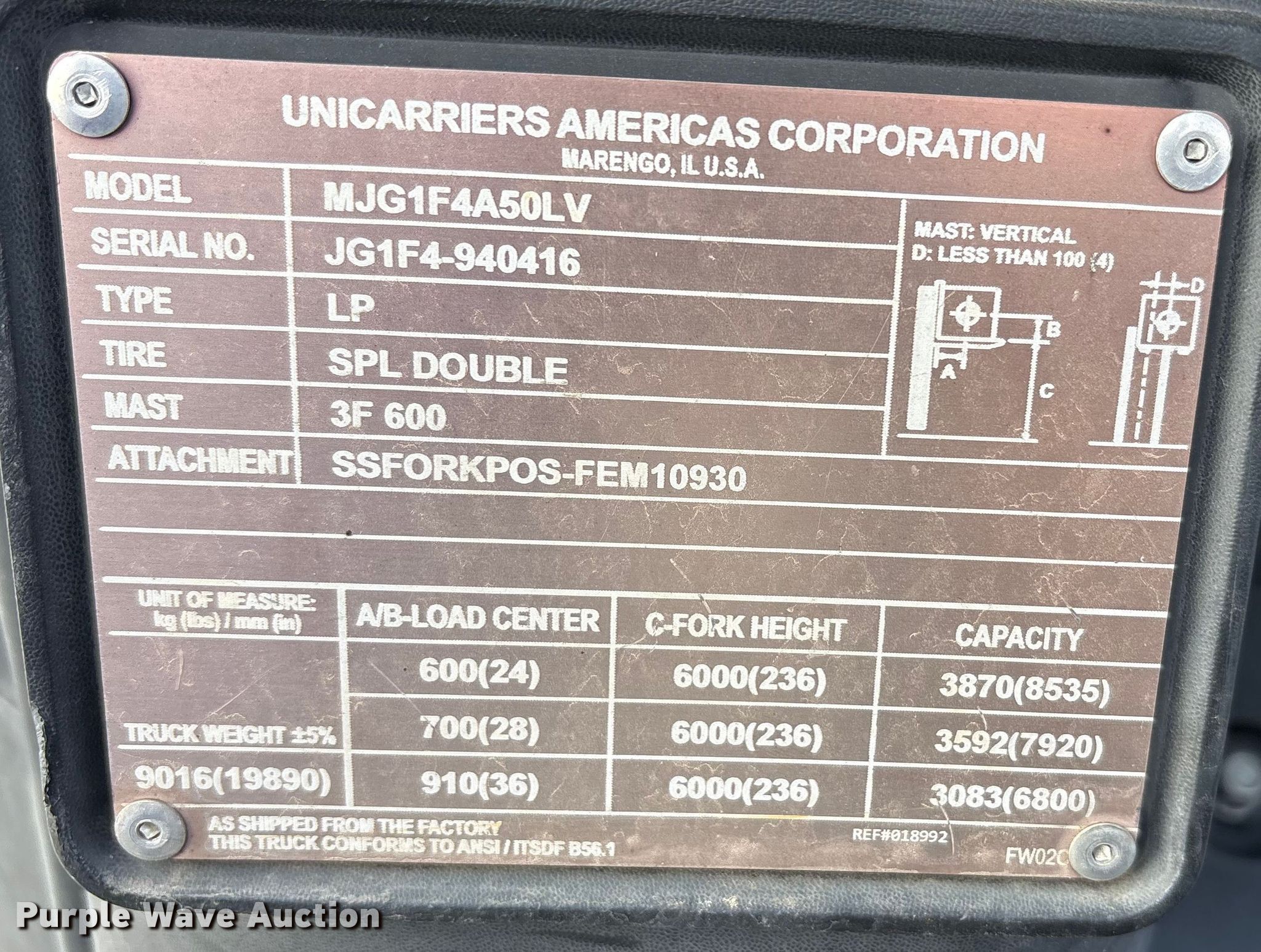 2018 UniCarriers PF110YLP forklift. Hours: 5,307 on meter, Serial: JG1F4-940416, Unit #: SFS2848. Engine GCT TB45L, Displacement: 4.5L, Cylinders: 6, Fuel type: LPG. Transmission Automatic. Operators station OROPS. Features Maximum lift capacity: 8,535 lbs, Maximum lift height: 236", Collapsed mast height: 117", Mast stages: 3, Side shift, Mast tilt, Fork positioner, Fork length: 70". Tires Front: 8.25-15, Rear: 7.00-12, Solid. Notes Warning indicator: Master warning. Ferguson. Euless, TX 76040