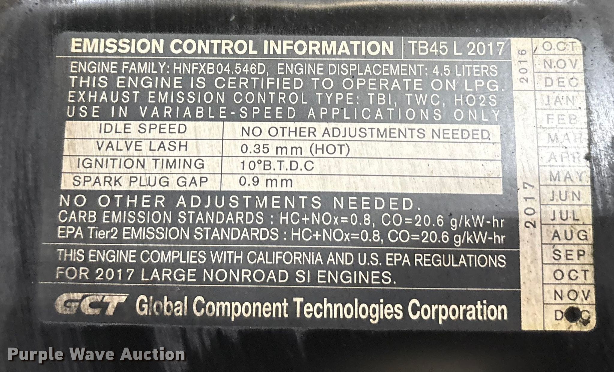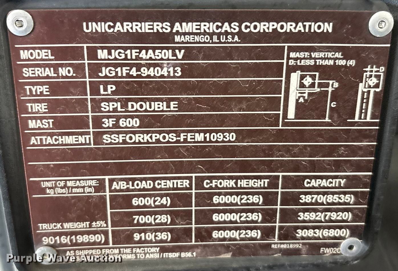 2018 UniCarriers PF110YLP forklift. Hours: 5,816 on meter, Serial: JG1F4-940413, Unit #: SFS2847. Engine GCT TB45L, Displacement: 4.5L, Cylinders: 6, Fuel type: LPG. Transmission Automatic. Operators station OROPS, Canopy. Features Maximum lift capacity: 8,535 lbs, Maximum lift height: 236", Collapsed mast height: 115", Mast stages: 3, Side shift, Mast tilt, Fork positioner, Fork length: 70". Tires Front: 8.25-15, Rear: 7.00-12, Solid. Notes Warning indicator: Master warning. Ferguson. Euless, TX 76040