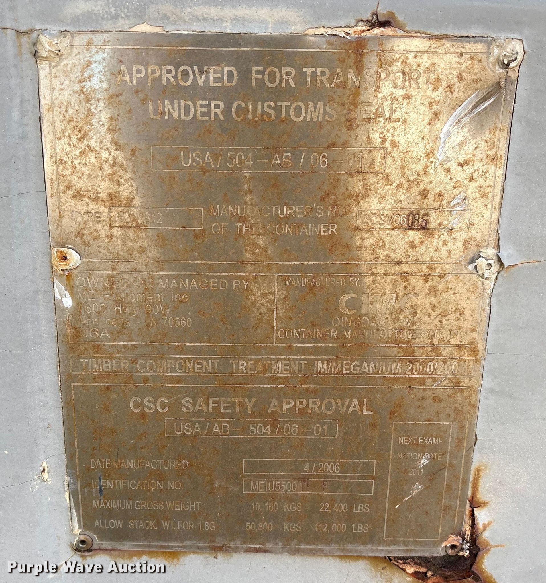 Purple Wave is selling a used Storage or Shipping Container in Louisiana. This item is a 2003 CIMC 021NS12 shipping container with the following: Serial: MEIU5500118