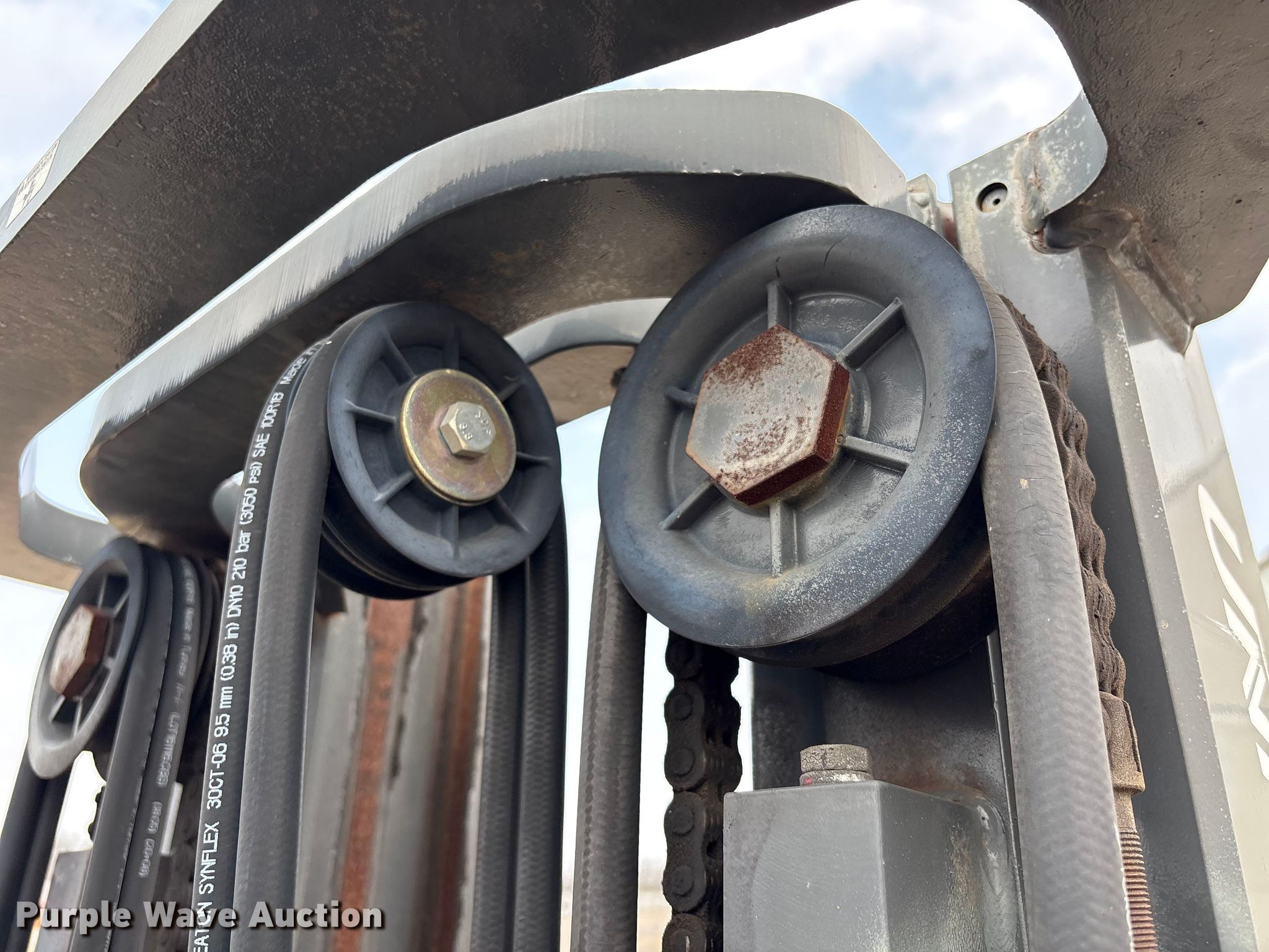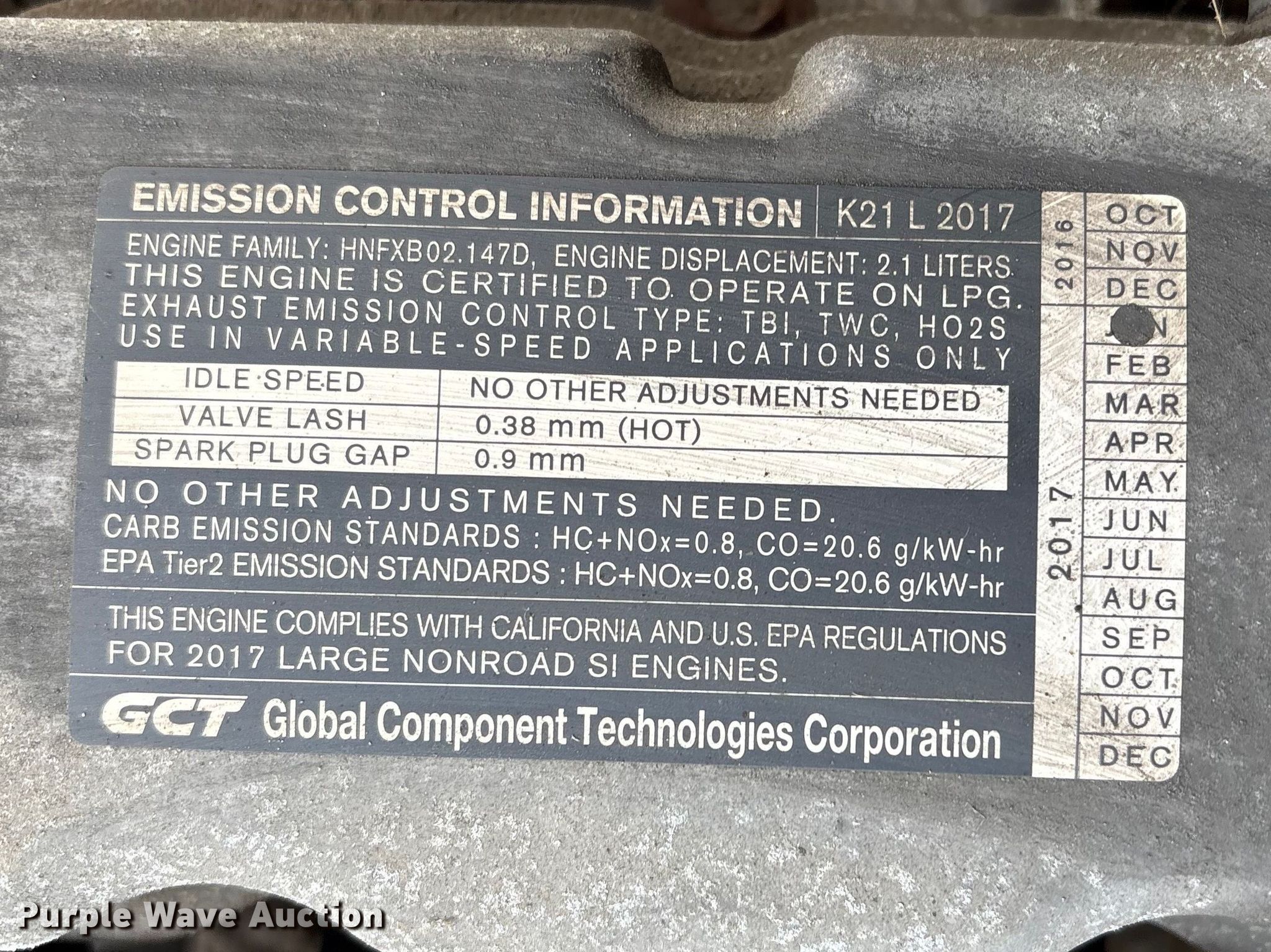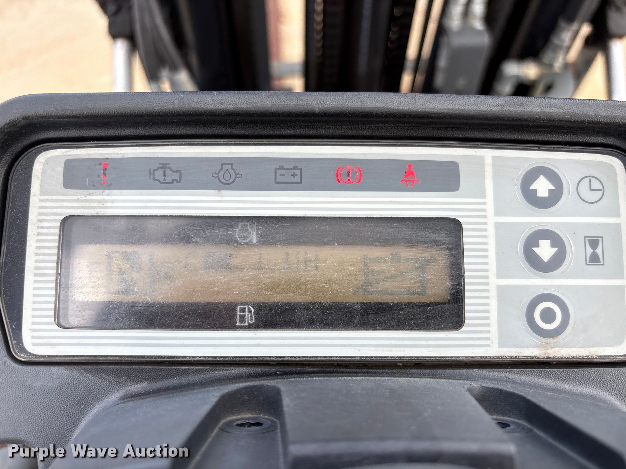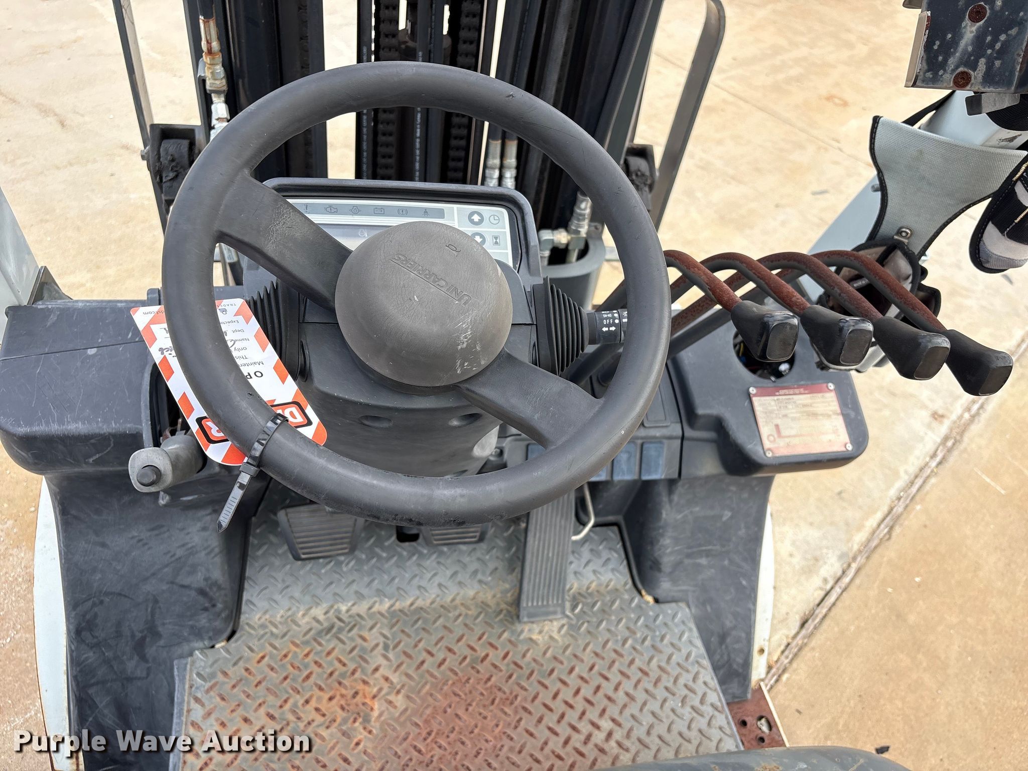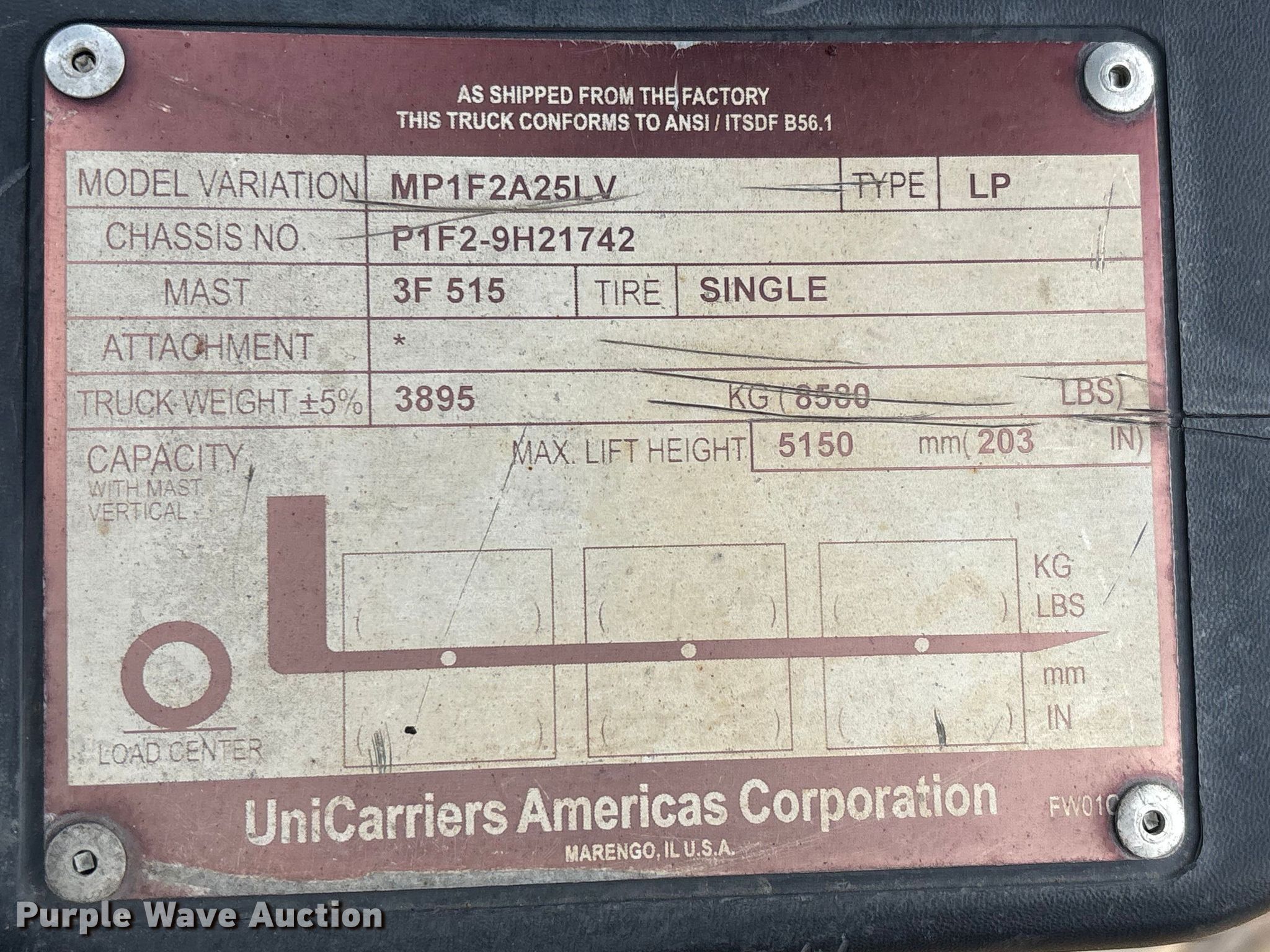 2016 UniCarriers PF50 forklift. Hours: Unknown, Serial: P1F2-9H21742, Unit #: SFS3033. Engine GCT, Displacement: 2.1L, Cylinders: 4, Fuel type: LPG LP bottle: Not included. Transmission Automatic. Operators station OROPS, Canopy. Features Maximum lift capacity: 3,325 lbs, Maximum lift height: 203", Collapsed mast height: 89", Mast stages: 3, Side shift, Mast tilt, Fork positioner, Fork length: 60". Tires Front: 7.00-12, Rear: 6.00-9, Non-marking. Notes Warning indicator: Engine fault, Master warning, Possible hydraulic issues, Transmission issues Non-operational reverse, Non-operational unit. Ferguson. Houston, TX 77051
