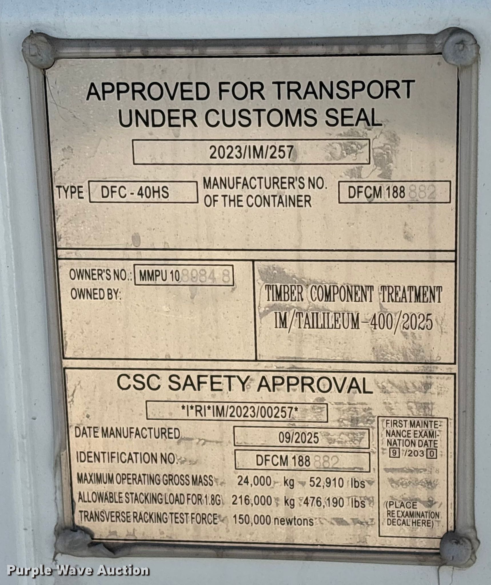 Purple Wave is selling a used Storage or Shipping Container in Oklahoma. This item is a 2025 shipping container with the following: Serial: DFCM188882