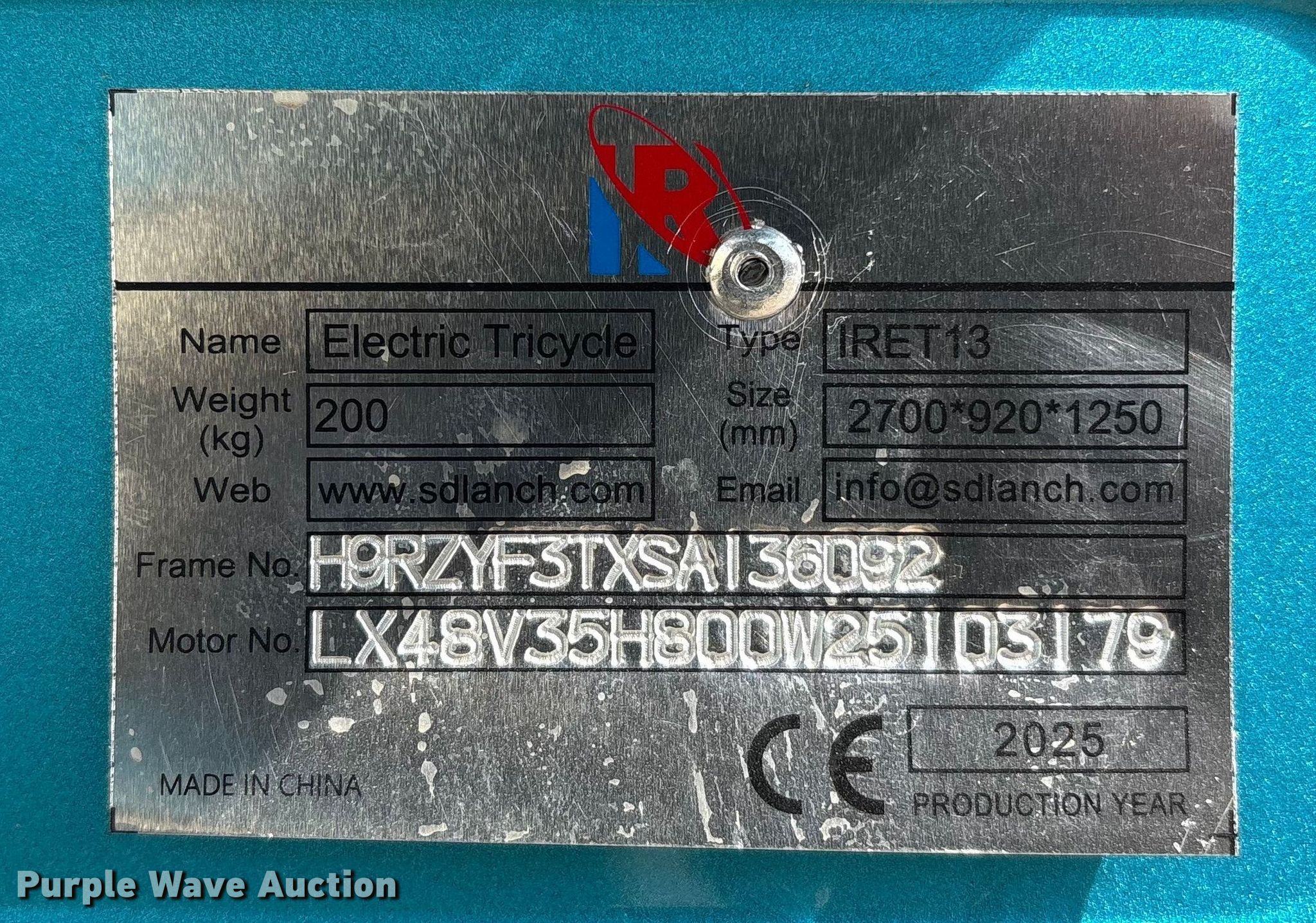 Purple Wave is selling a used Golf Cart in Oklahoma. This item is a 2025 IRanch IRET13 Electric tricycle with the following: Serial: H9RZYF3TXSA136092