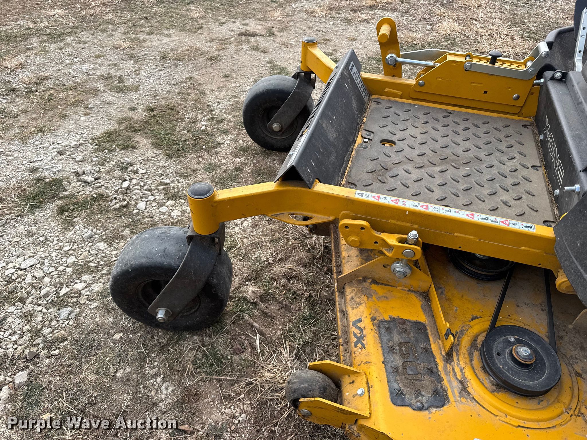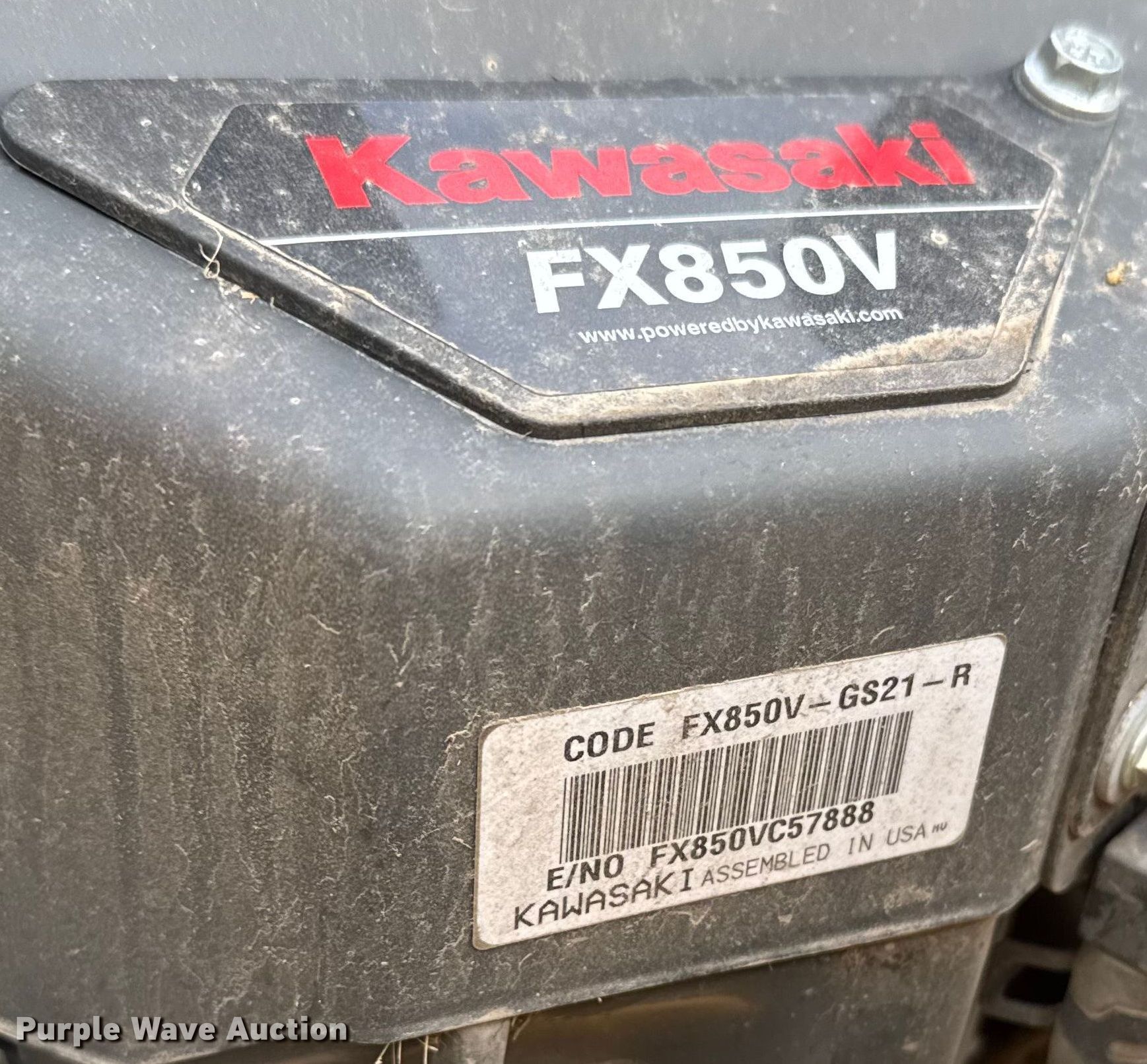 Hustler X-One ZTR lawn mower. Cutting width: 60", Serial: 23026111. Engine Kawasaki FX850V, Cylinders: 2, Fuel type: Gas. Transmission Hydrostatic. Tires Front: 13x6.5-5, Rear: 24x12.00-12. Farmer State Bank. Westmoreland, KS 66549