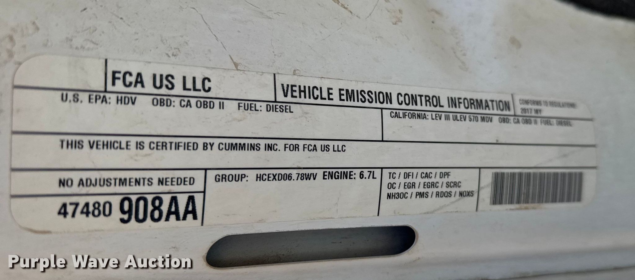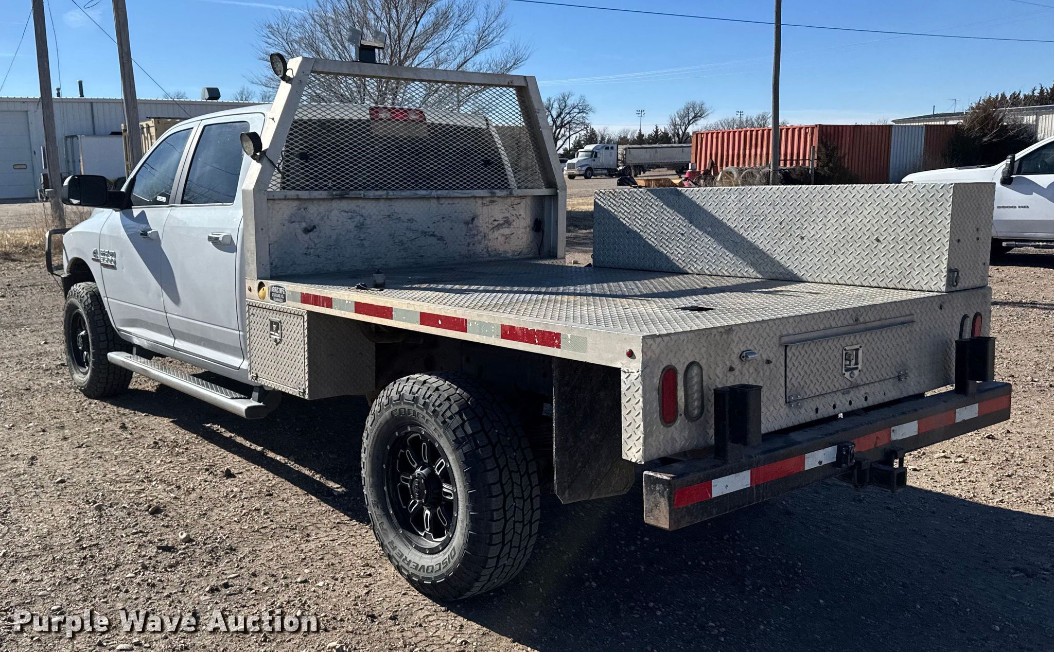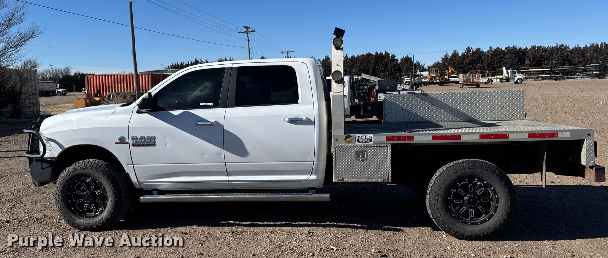 2017 RAM 3500 Crew Cab flatbed pickup truck. Miles: 160,568 on odometer, VIN: 3C63R3HL9HG633615. Engine Displacement: 6.7L, Cylinders: 6, Fuel type: Diesel. Transmission Automatic, Four wheel drive. Interior AC, Heat, Seat: Power driver, Heated mirrors, Power windows, Power locks, Cruise control, Brake controller. Features Bed Flatbed, Length: 8' 4", Width: 83". Tires Size: 285/75R18. Notes Dash warning indicator: Check engine, Hail damage, Emissions system modified. Kansas electronic title. Title has a lien that will be released following the close of the auction. A paper title will be printed once the lien is released. Title distribution may be delayed up to 30 days from verification of funds. Western Kansas Ag. Sharon Springs, KS 67758