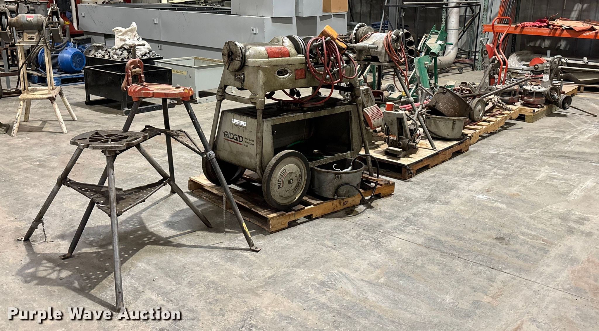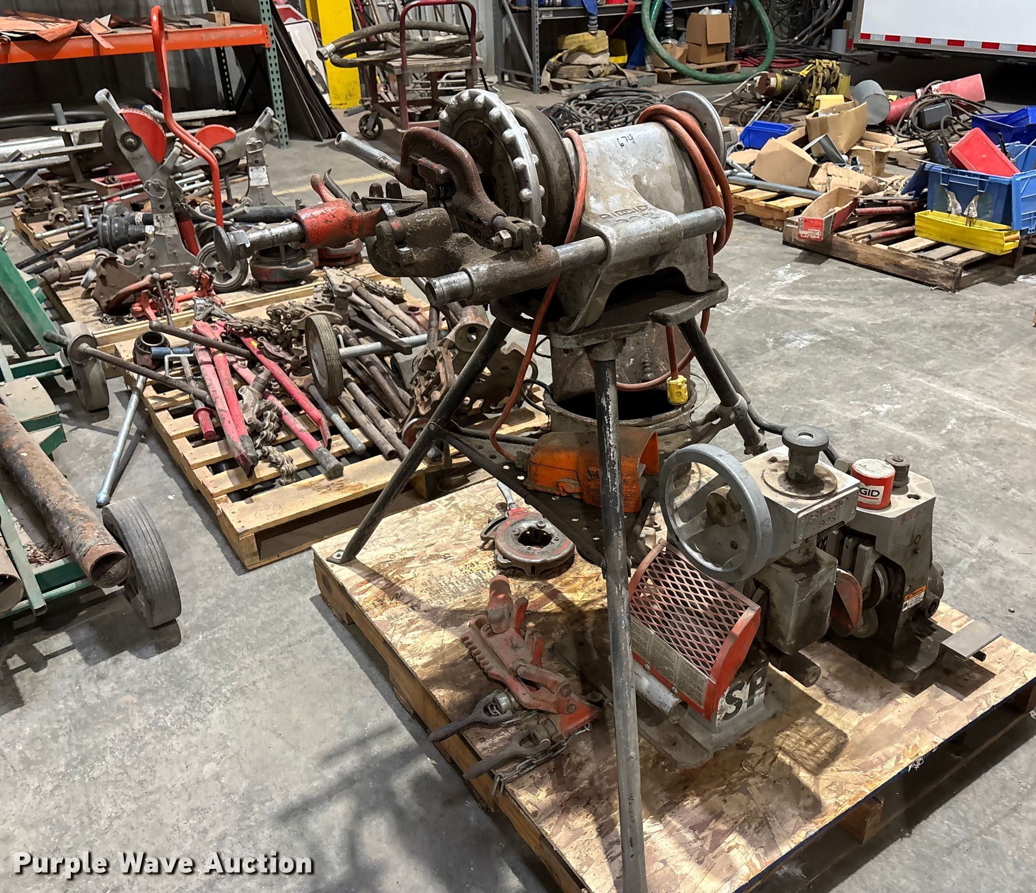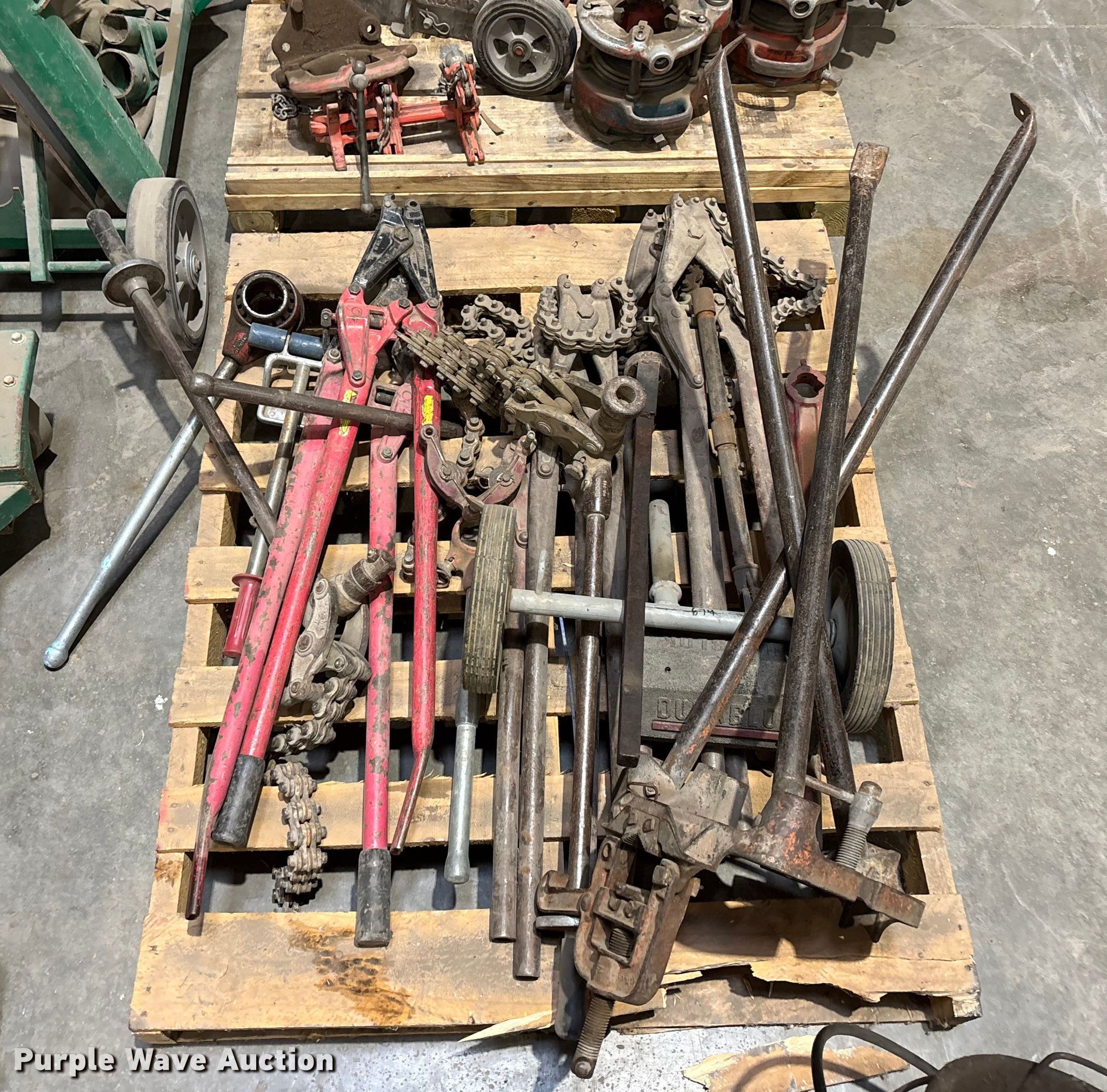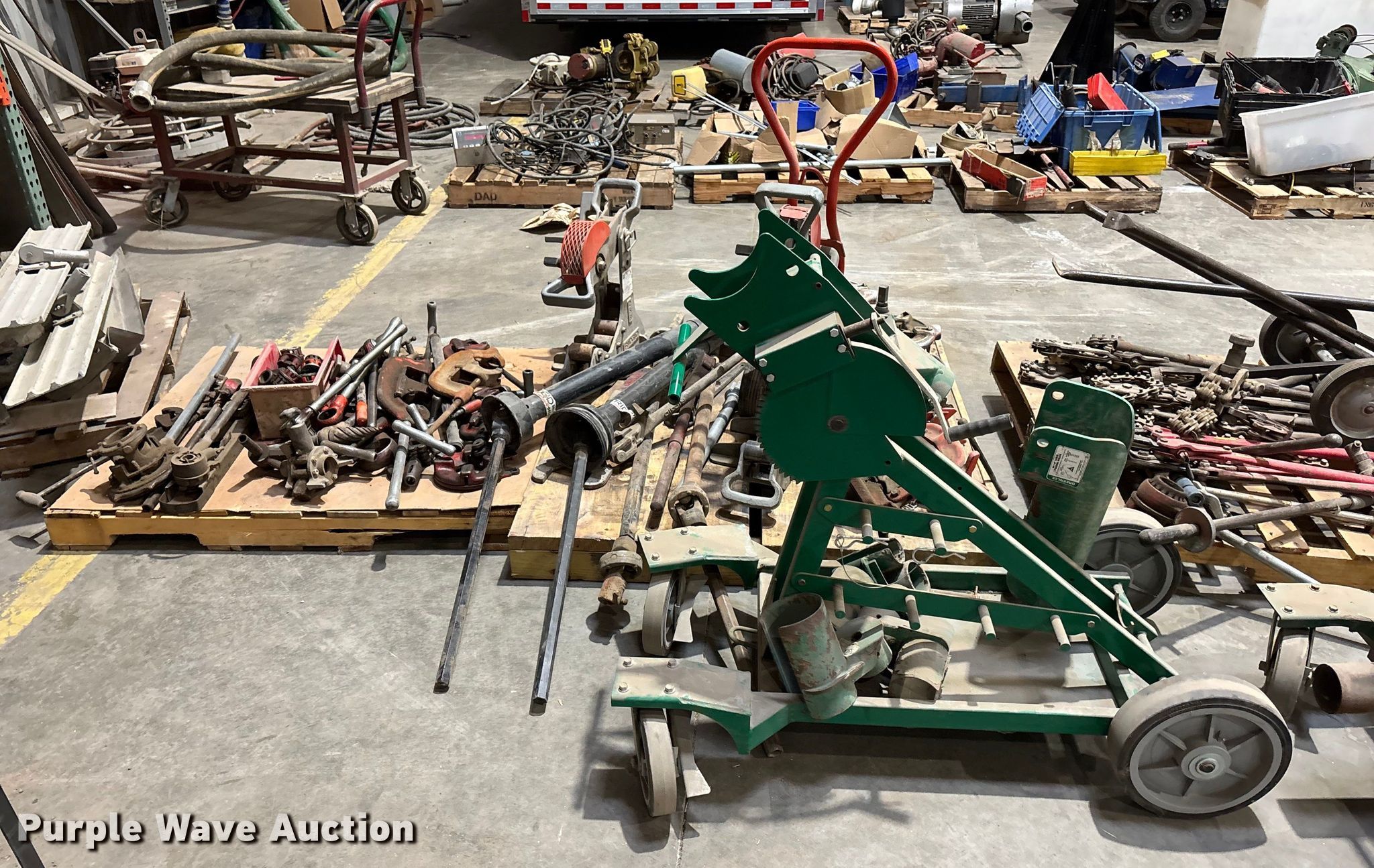 Purple Wave is selling a used Tools in Kansas. This item is a Tools with the following: Pipe Bender, Size: 3" conduit, Rigid pipe threaders, (2) Rigid 258 pipe cutters, Pipe stands, Chain cutters, Chain wrenches, Rigid 300, Rigid 801 and more