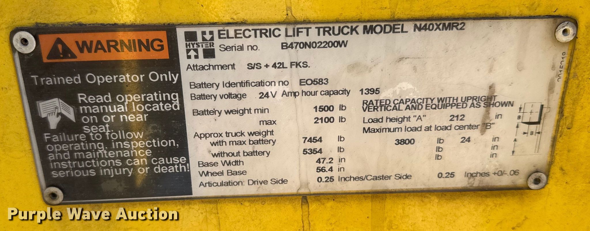 (3) Hyster 40 forklifts. Hours: Unknown. Electric Motor Volts: 24. Transmission Hydrostatic. Operators station Canopy. Features Maximum lift capacity: 3,800 lbs, Collapsed mast height: 84", Mast stages: 3, Side shift, Reach / retract. Notes No chargers, Non-operational units. Sperior Contracting & Manufacturing Services Co.. Salina, KS 67401