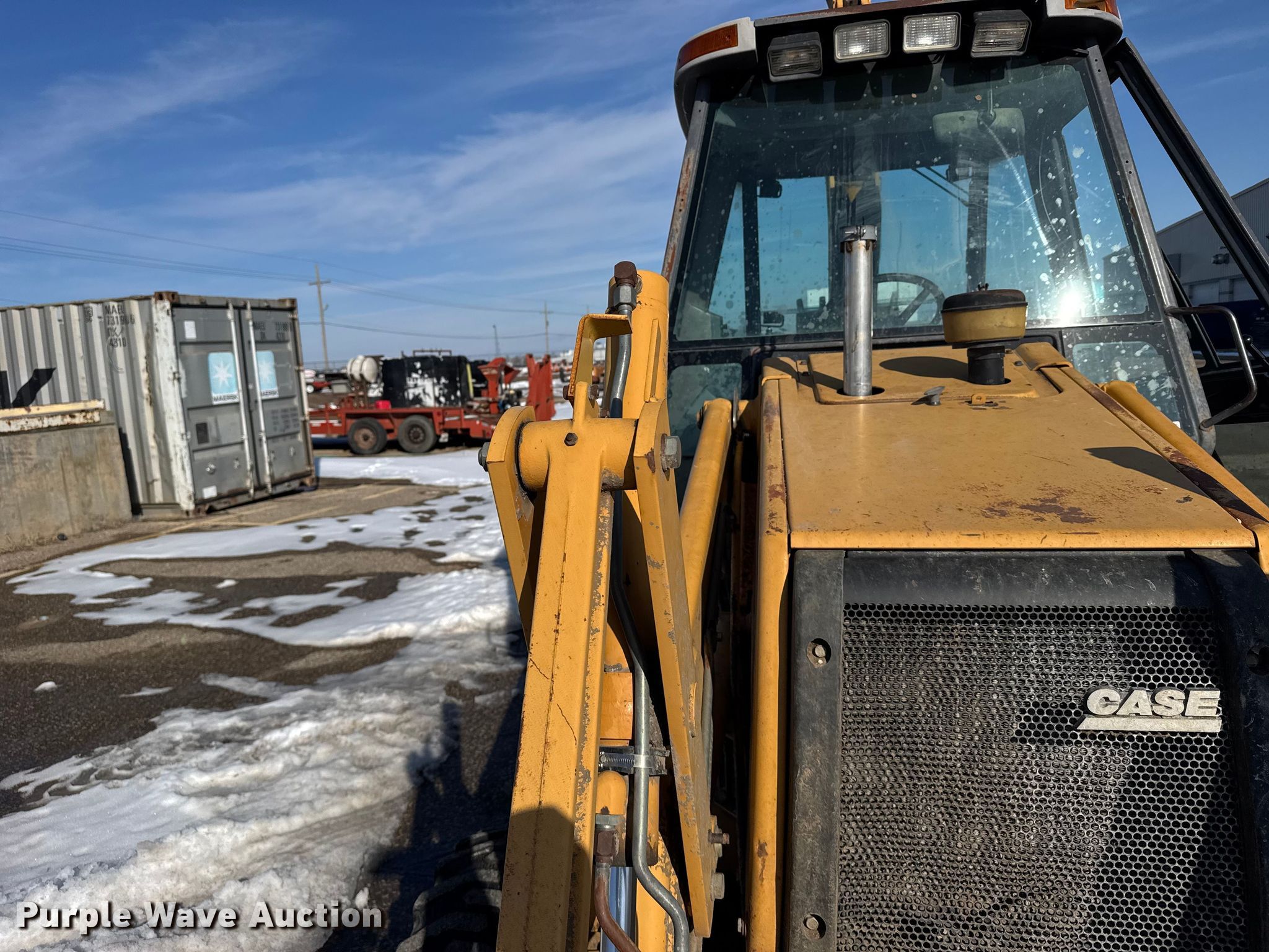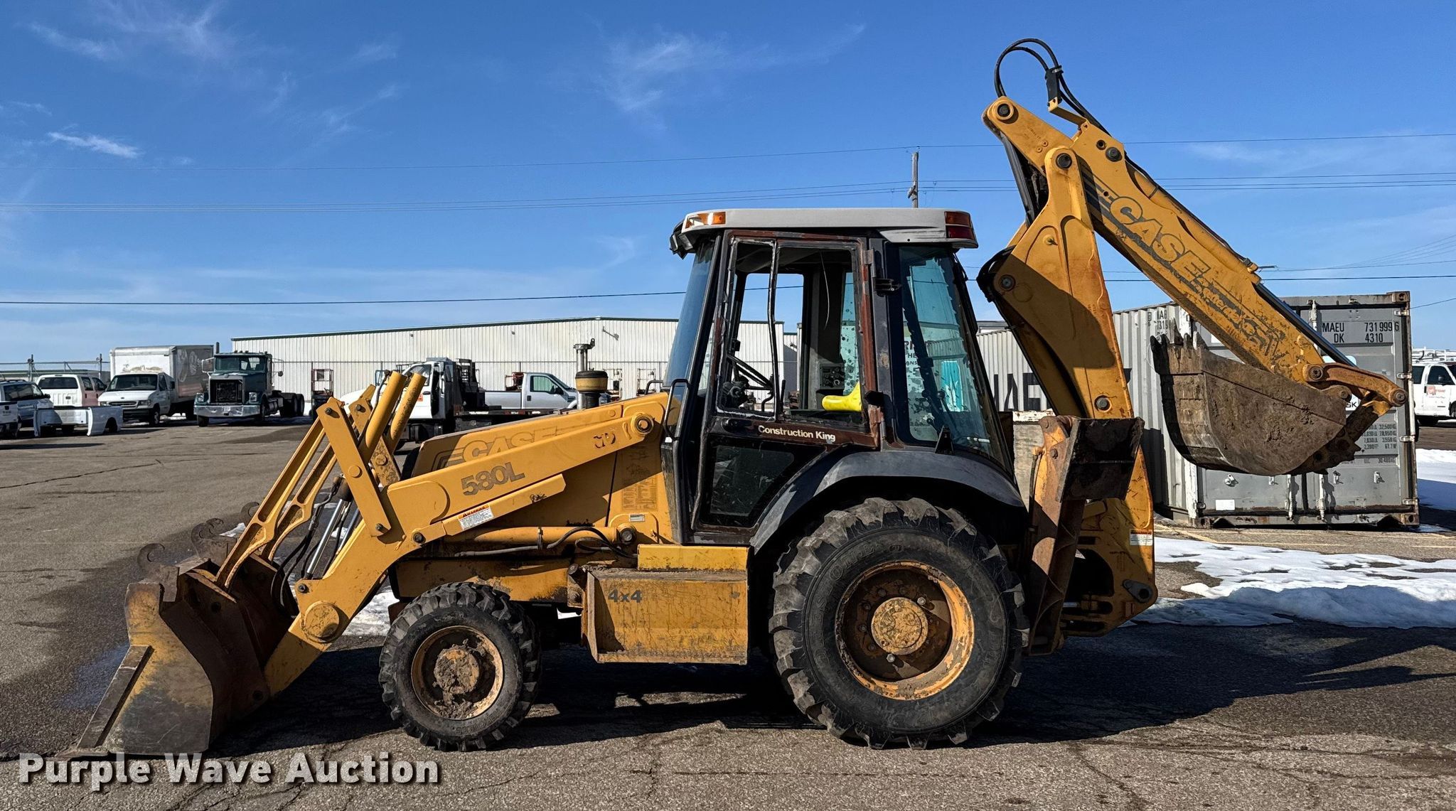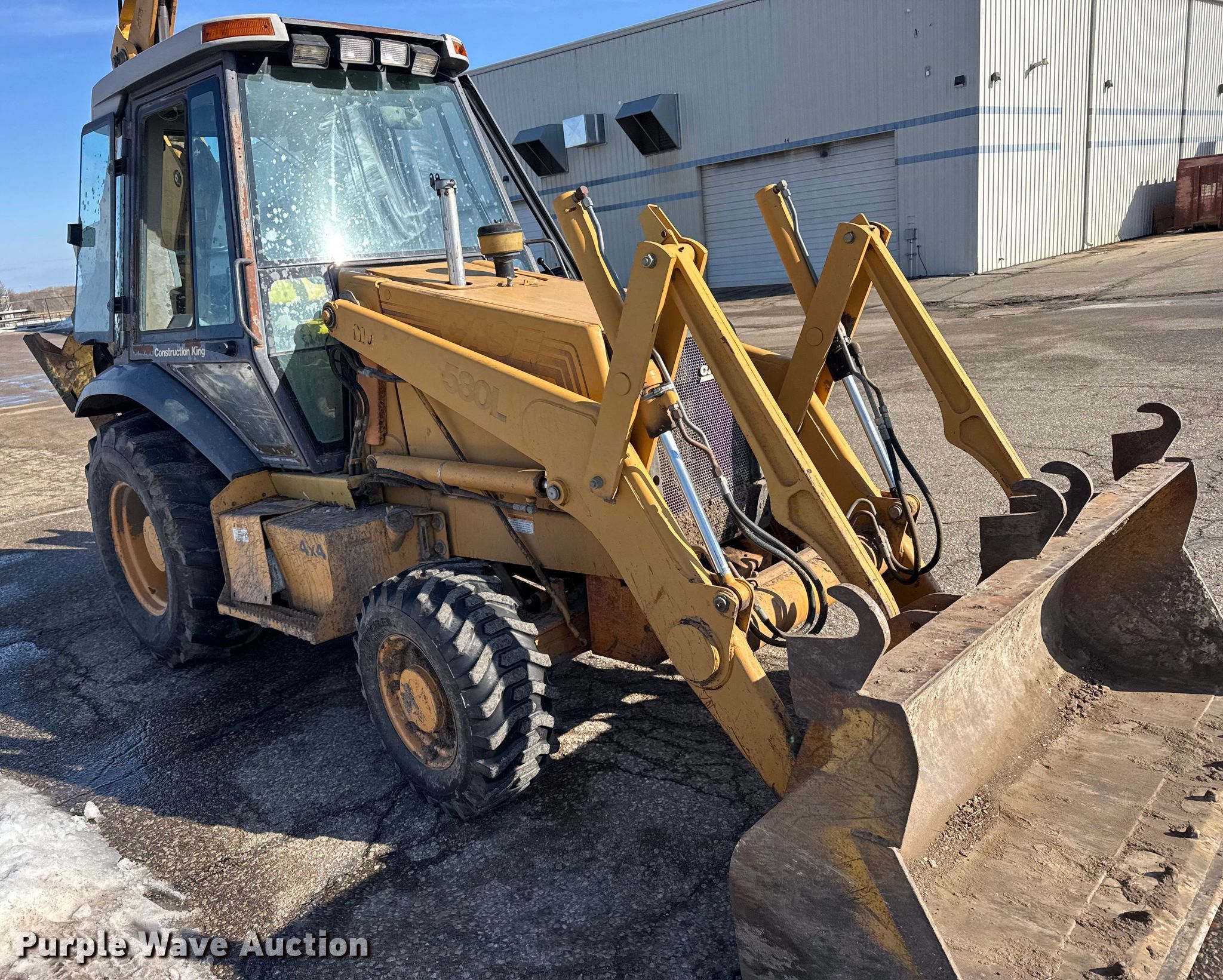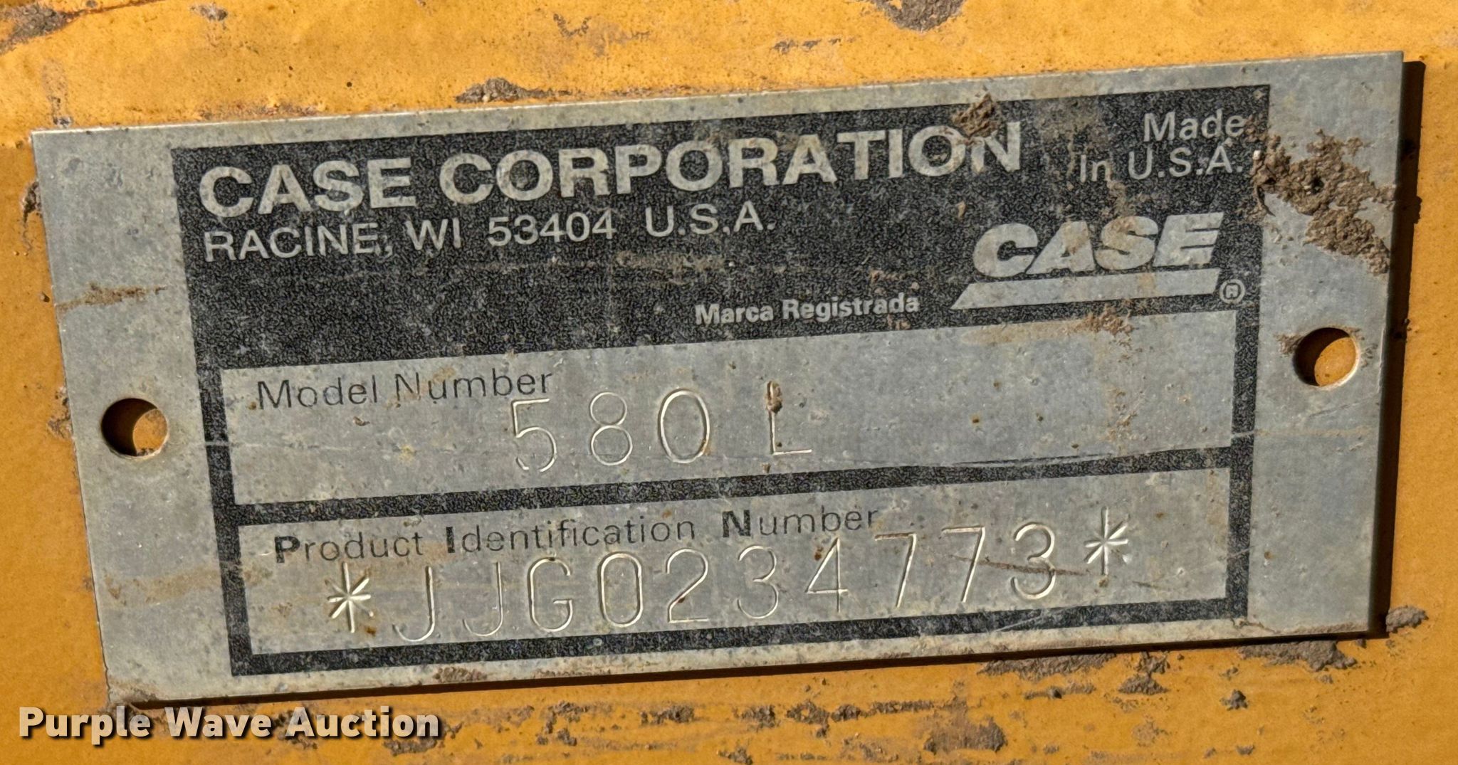 1997 Case 580L backhoe. Hours: 4,118 on meter, Serial: JJG0234773. Engine Cylinders: 4, Fuel type: Diesel. Transmission Shuttle shift, 4F - 4R. Chassis Four wheel drive. Operators station Enclosed cab, Backhoe controls: Wobble stick / two stick. Features Loader Bucket Width: 84", Cutting edge: Bolt-on, Backhoe Extendable stick, Bucket Width: 24", Teeth: 5.. Tires Front: 12-16.5, Rear: 17.5-24. Notes Side window broken. Sperior Contracting & Manufacturing Services Co.. Salina, KS 67401