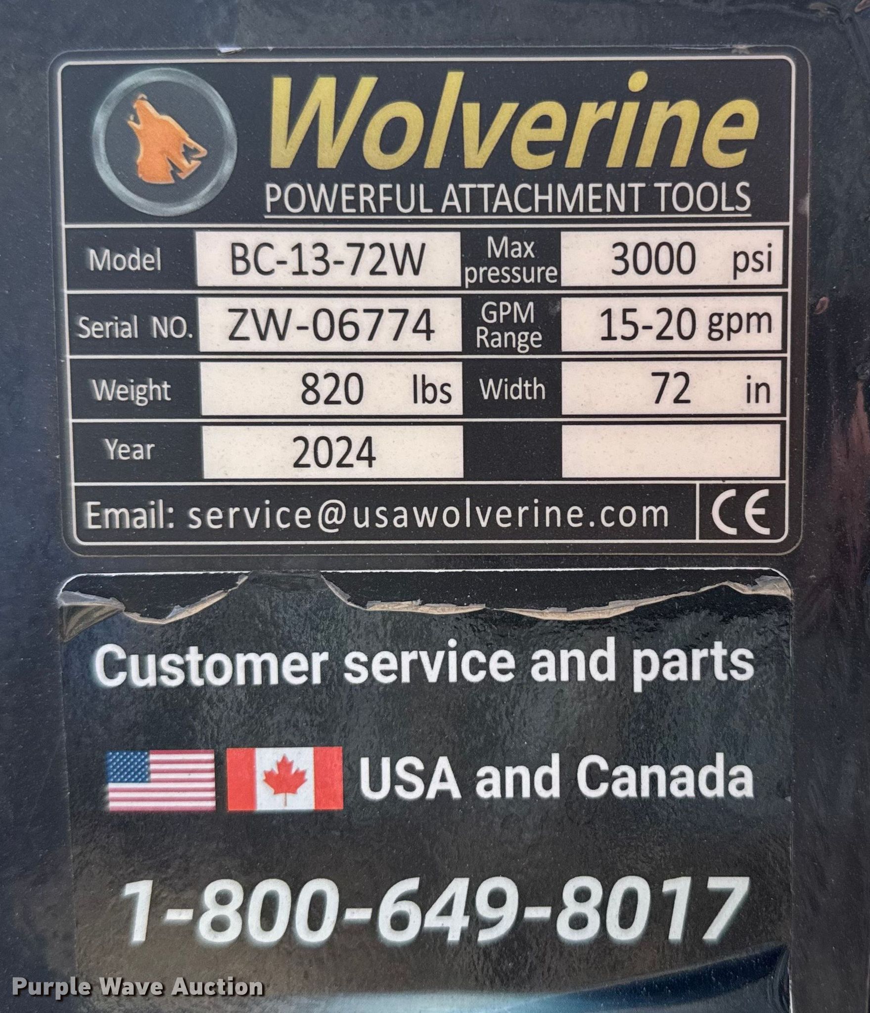 Purple Wave is selling a used Skid Steer Attach. in Kansas. This item is a 2024 Wolverine BC-13-72W skid steer rotary mower with the following: Serial: ZW-06774, Width: 60"