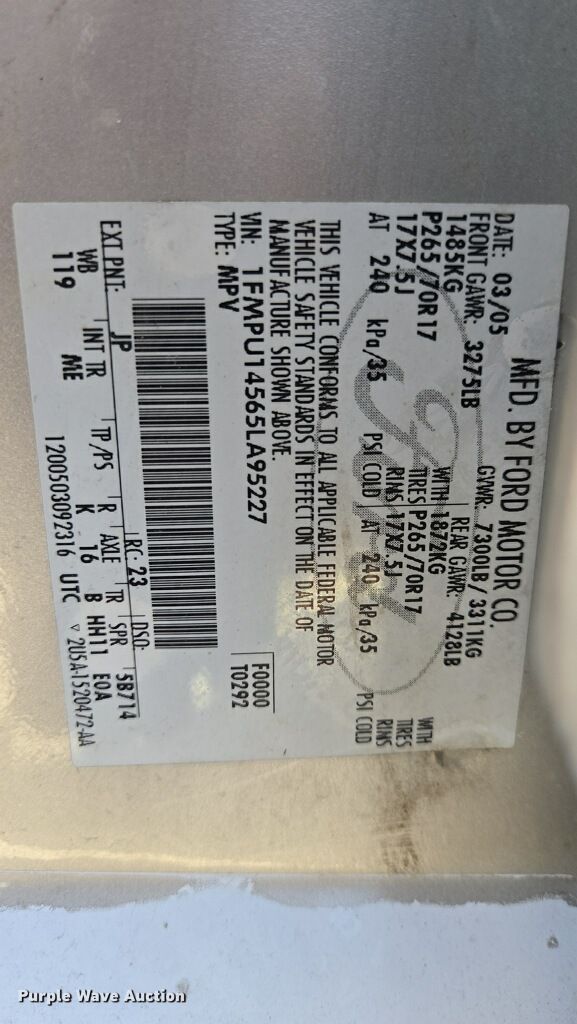Purple Wave is selling a used Passenger Vehicle in Oklahoma. This item is a 2005 Ford Expedition SUV with the following: Miles: 138,263 on odometer, VIN: 1FMPU14565LA95227