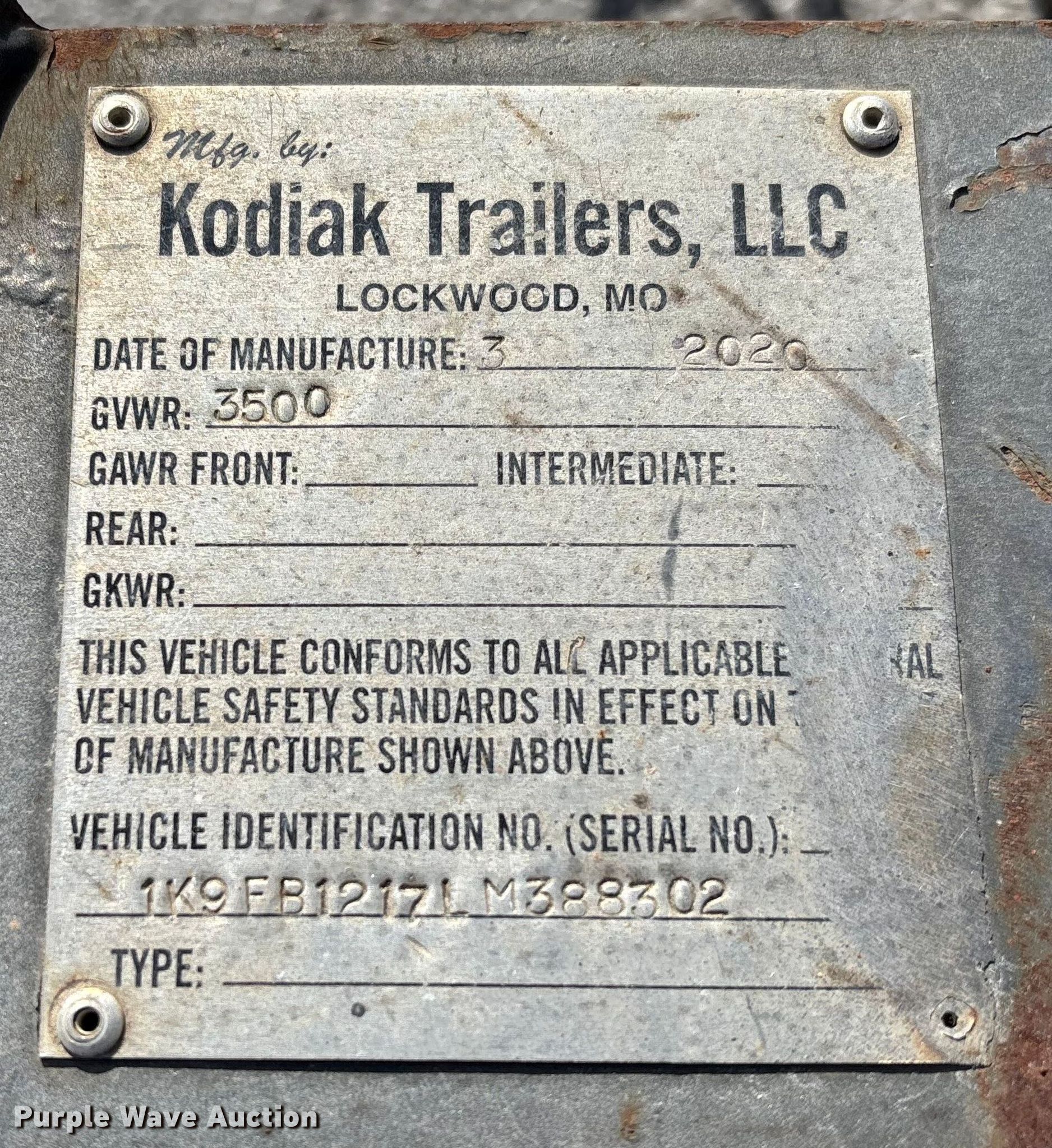 Purple Wave is selling a used Car or Utility Trailer in Missouri. This item is a 2020 Kodiak utility trailer with the following: VIN: 1K9FB1217LM388302
