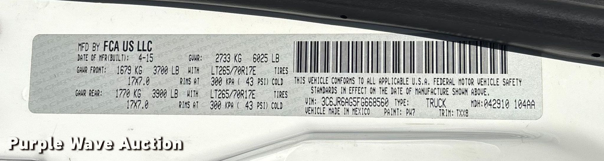 - VIN: 3C6JR6AG5FG668560