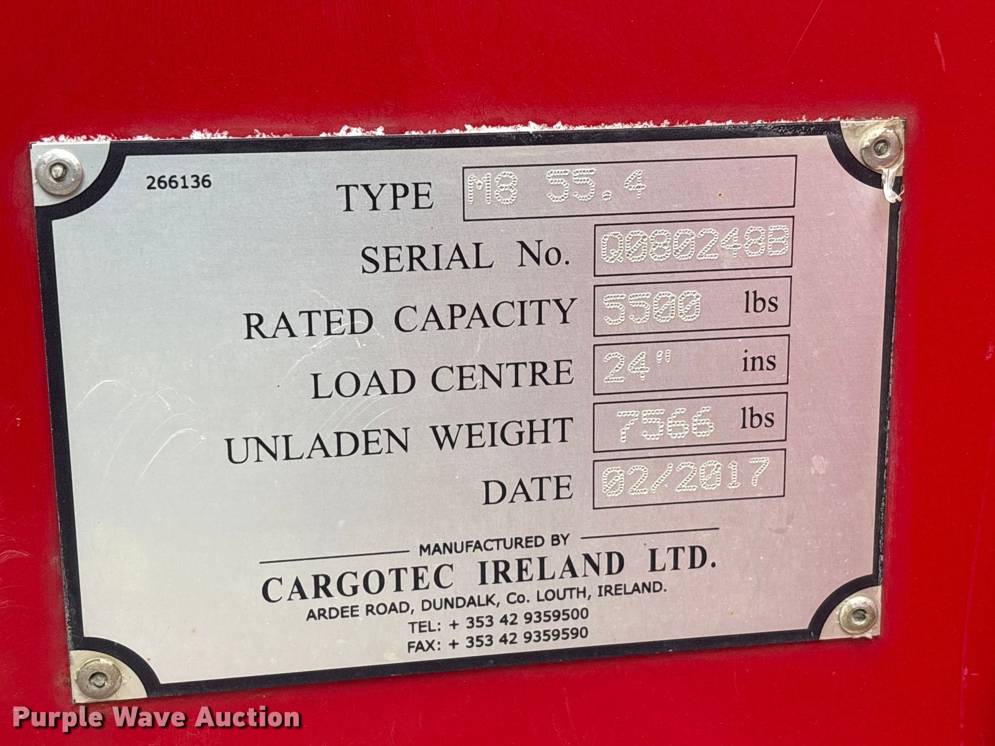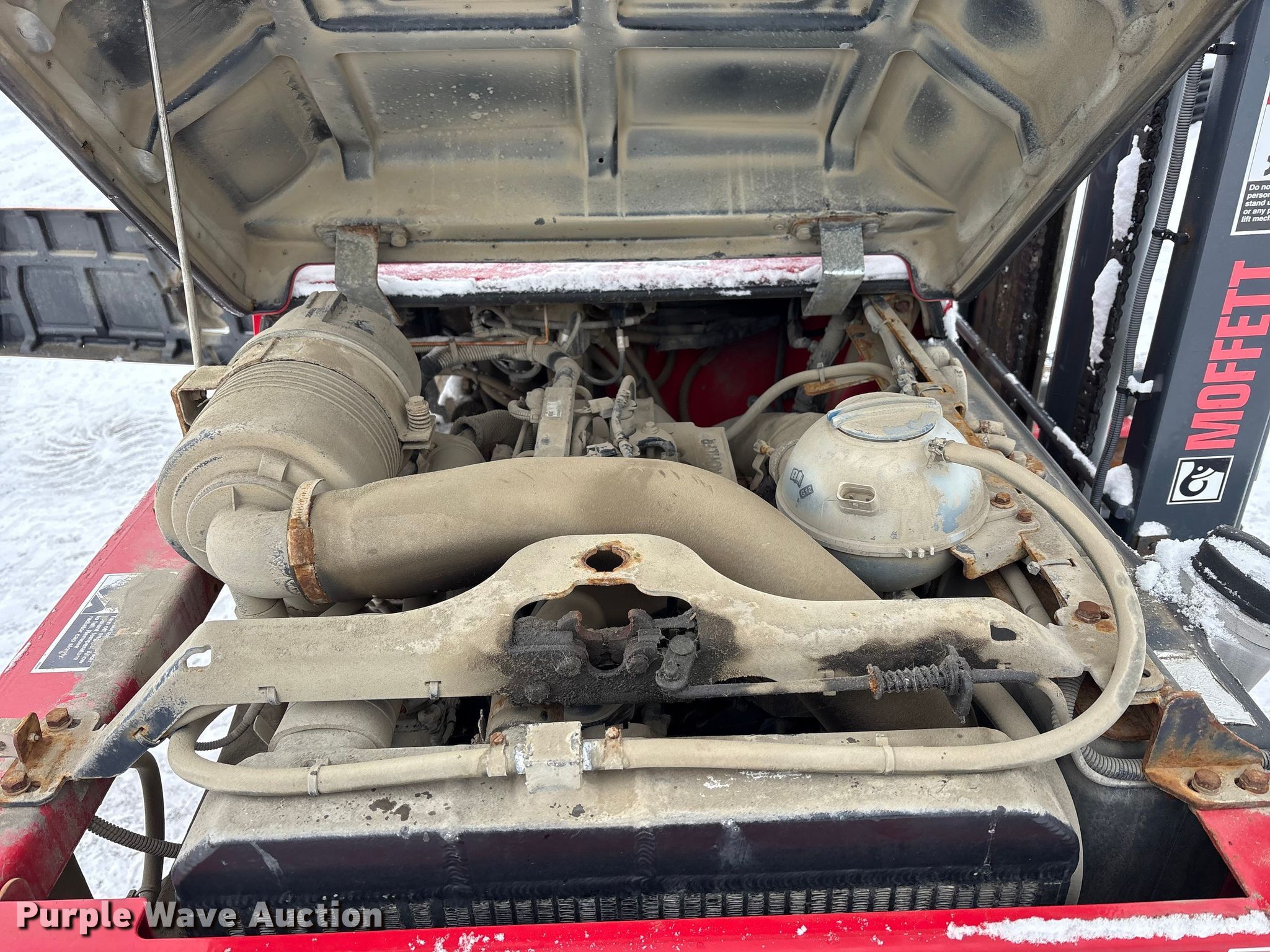 2017 Moffett M8 55.4 forklift. Hours: 1,045 on meter, Serial: Q080248B, Unit #: SFS2892. Engine Kohler, Cylinders: 4, Fuel type: Diesel. Transmission Hydrostatic. Chassis Differential lock. Operators station OROPS. Features Maximum lift capacity: 5,500 lbs, Maximum lift height: 144", Collapsed mast height: 107", Mast stages: 2, Side shift, Mast tilt, Reach / retract, Fork length: 48". Tires Size: 31x15.5-15. Notes Jump start required during on-site data collection. Ferguson. Valley View, OH 44125