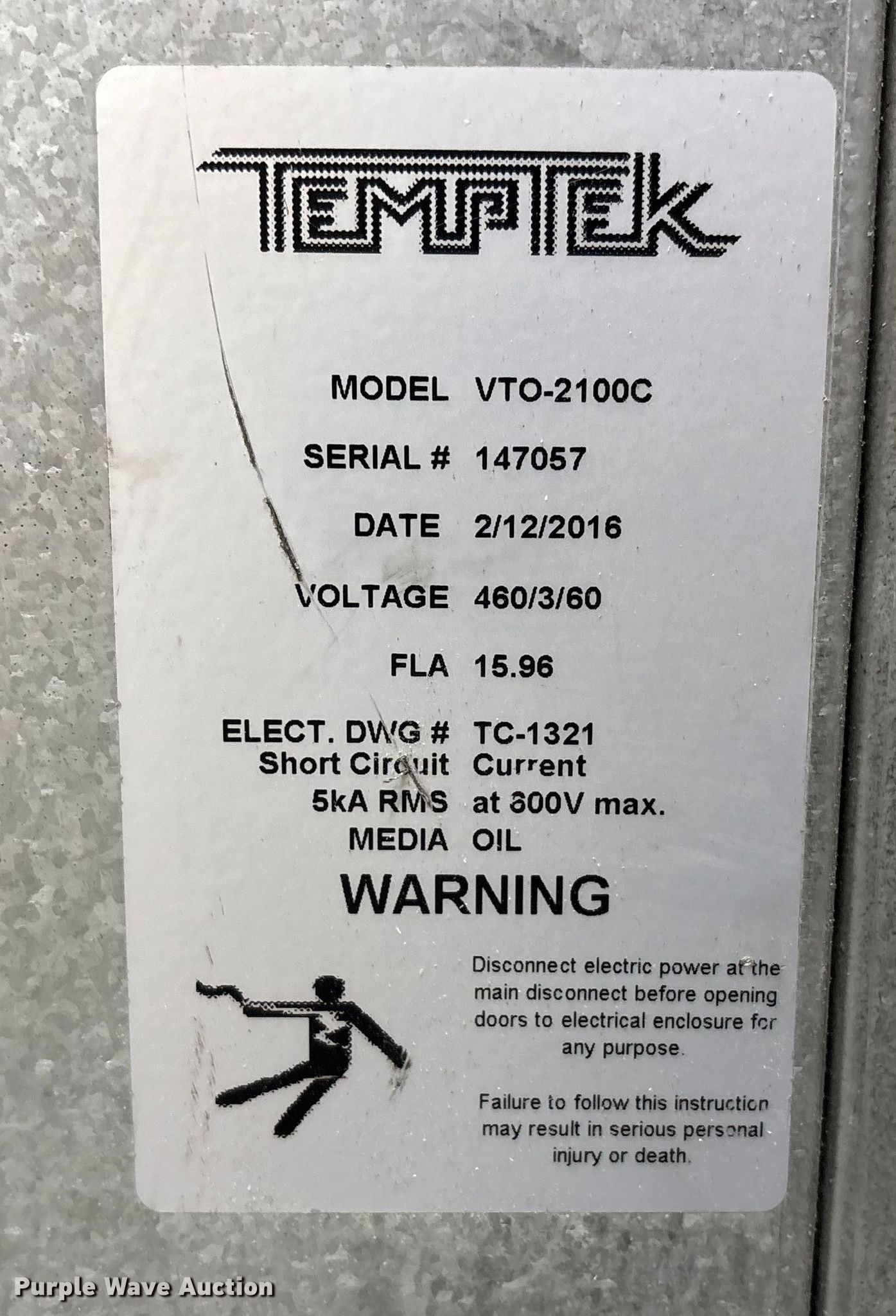 Temptek VTO-2100C temperature controller. Serial: 147057. Dimensions Overall Length: 33", Width: 17", Height: 44". Electric Motor Volts: 460, Phase: Three. Persistent Molding Technologies. Frankfort, KY 40601