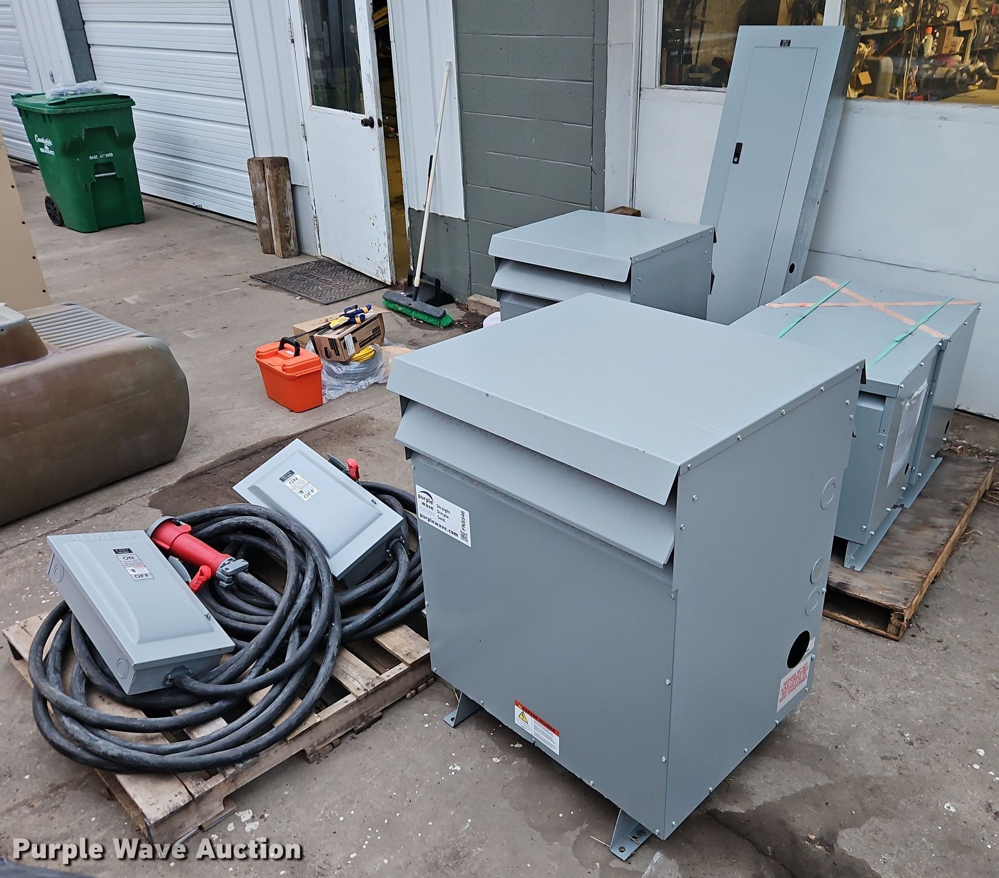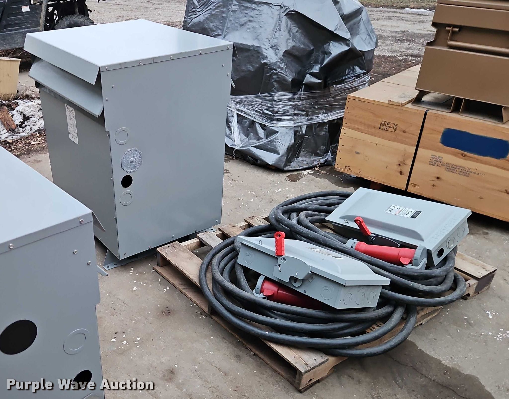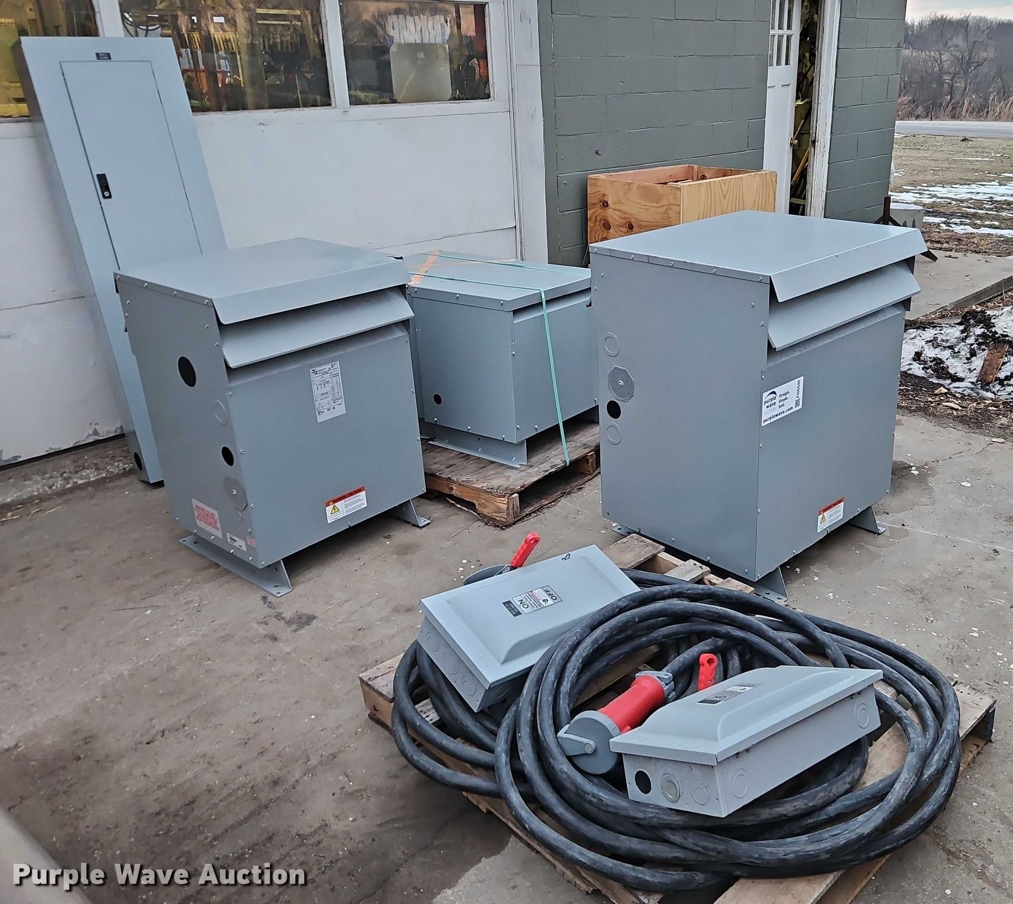 Purple Wave is selling a used Electronics in Missouri. This item is a (4) transformers with the following: Phase: Three, Electrical panel, Amps: 400, (2) disconnect switches, Phase:3, Hubble connectors, Amps: 100, 50' cable