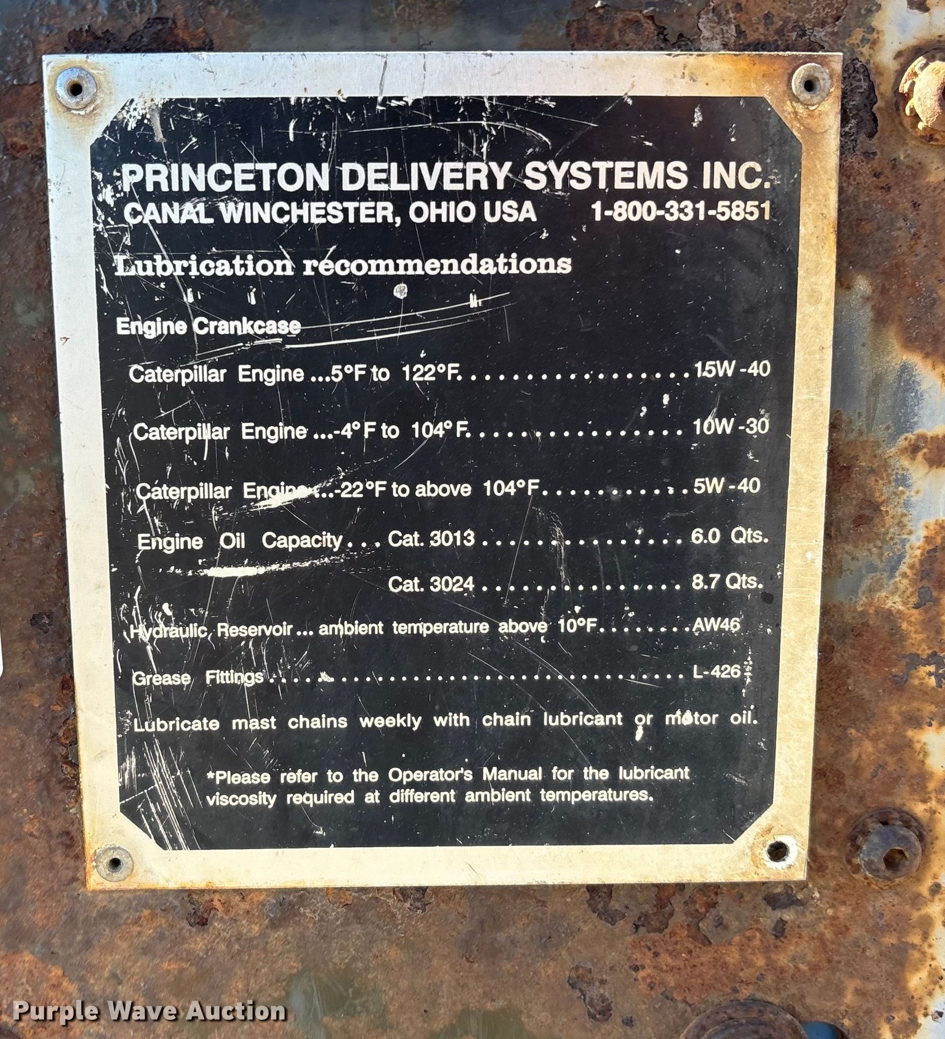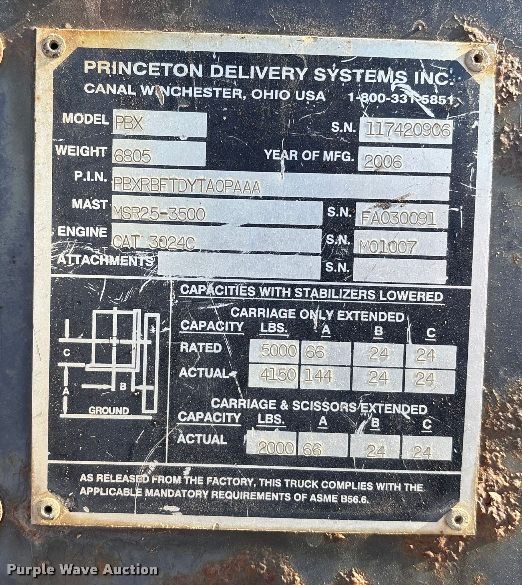 2006 Princeton PBX Forklift. Hours: 482 on meter, Hours: Unknown, Serial: PBXRBFTDYTA0PAAA. Engine Caterpillar, Cylinders: 4, Fuel type: Diesel. Transmission Hydrostatic. Chassis Differential lock. Operators station Canopy. Features Maximum lift capacity: 5,000 lbs, Maximum lift height: 144", Collapsed mast height: 115", Mast stages: 2, Side shift, Mast tilt, Reach / retract, Fork length: 48". Tires Size: 31x15.5. Notes Unknown operating condition of hour meter. Hollis Truck Line, LLC. Valley Falls, KS 66088