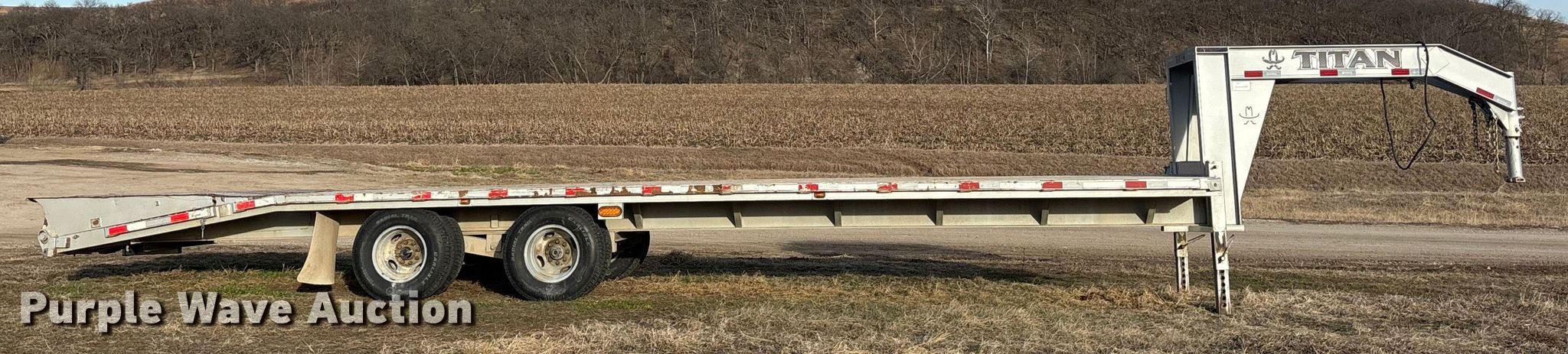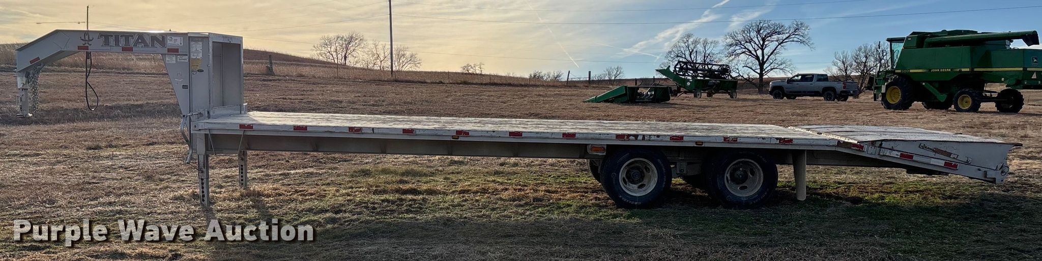 2021 Titan equipment trailer. VIN: 4TGF30203M1086761. Dimensions Overall Length: 38' 6", Width: 102", Deck Length: 24', Width: 102", Tail length: 6', Ramps: Manual Length: 6'. Features Deck type: Wood. Chassis Hitch: Gooseneck, Landing gear: Dual, Suspension: Spring, Brakes: Electric, Axles: Tandem, GVWR: 20,000 lbs. Tires Steel wheels, Size: 235/85R16. Notes Toolbox locked. Kansas title. Title distribution may be delayed up to 14 days from verification of funds. Flint Hills Stone. Alma, KS 66401